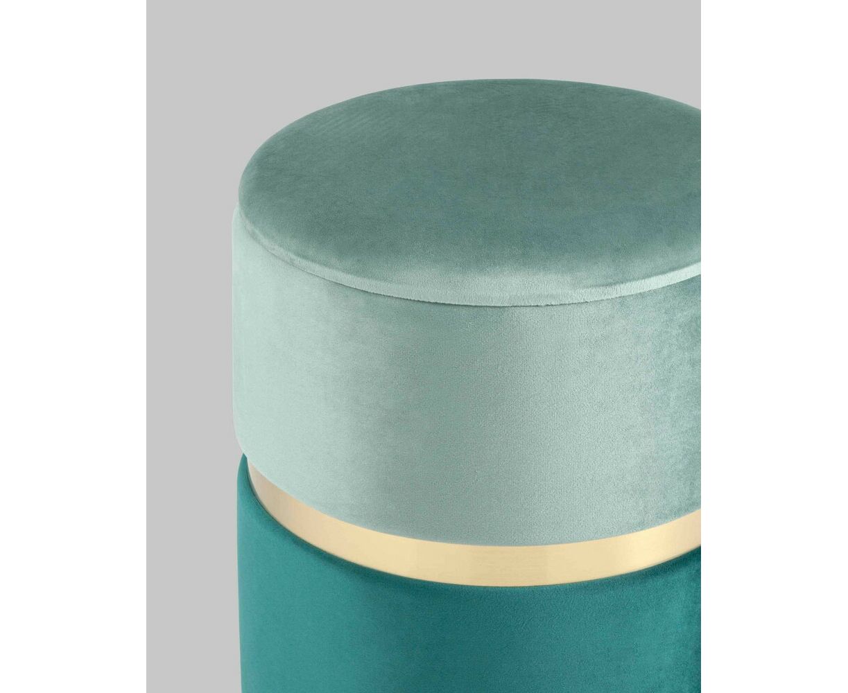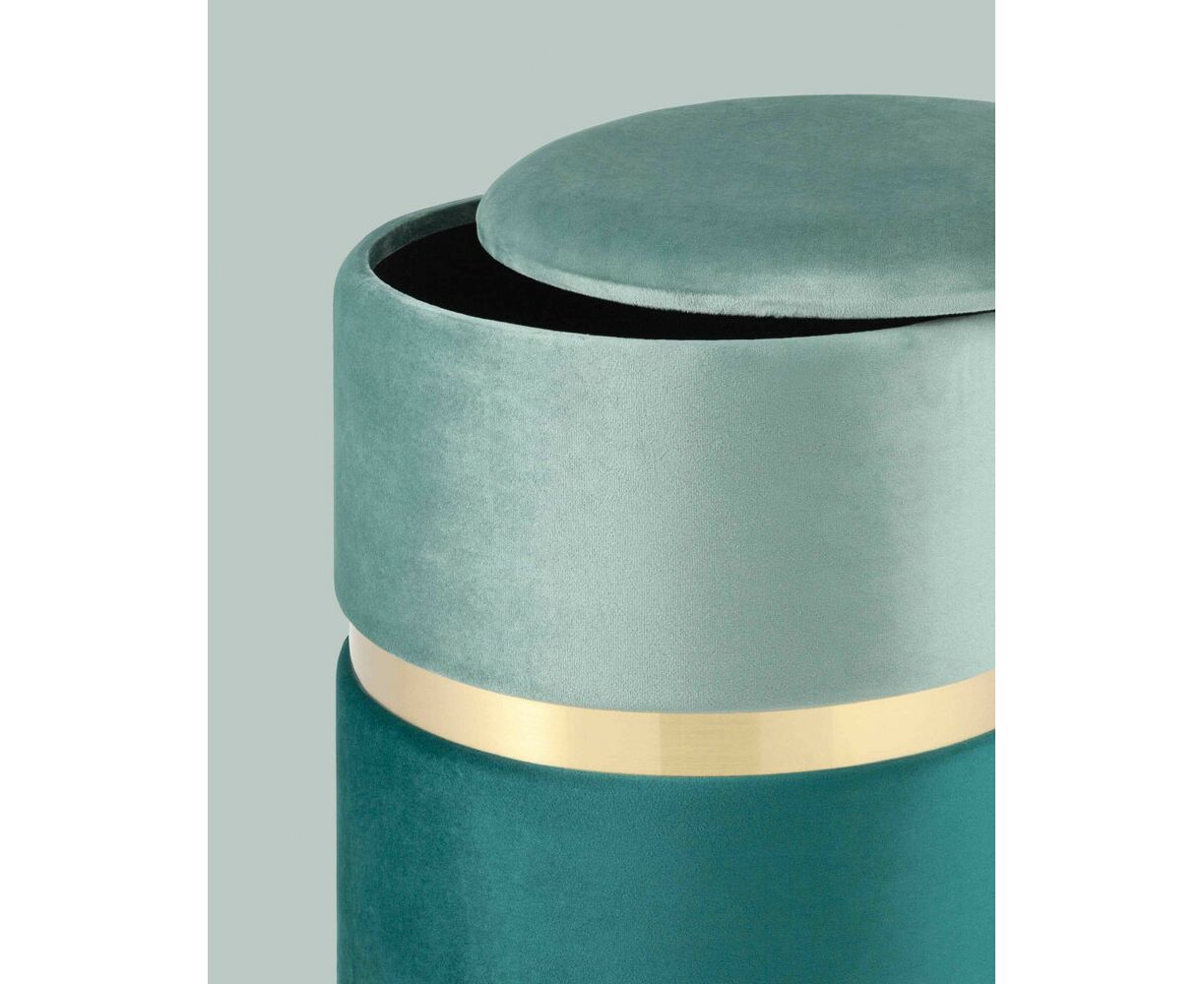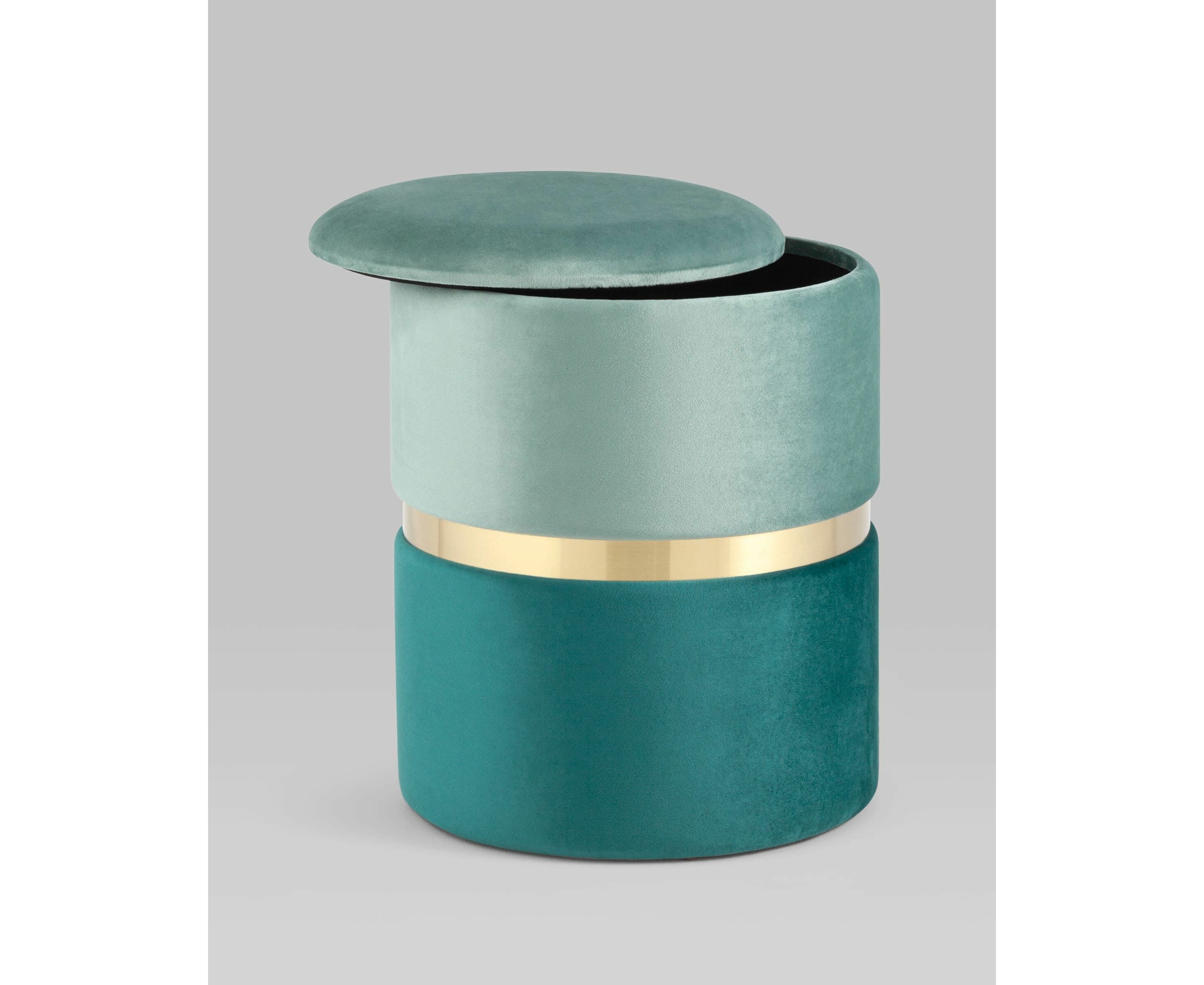Лаконичная модель пуфа в мягкой обивке прекрасно впишется в современные интерьеры. Обивка выполнена из велюра в светлом и темном оттенках и украшена металлическим ободком в золотом цвете. Под сиденьем имеется ящик для хранения различных мелочей. В основании предусмотрены специальные подпятники, которые делают пуф более устойчивым и предотвращают скольжение.