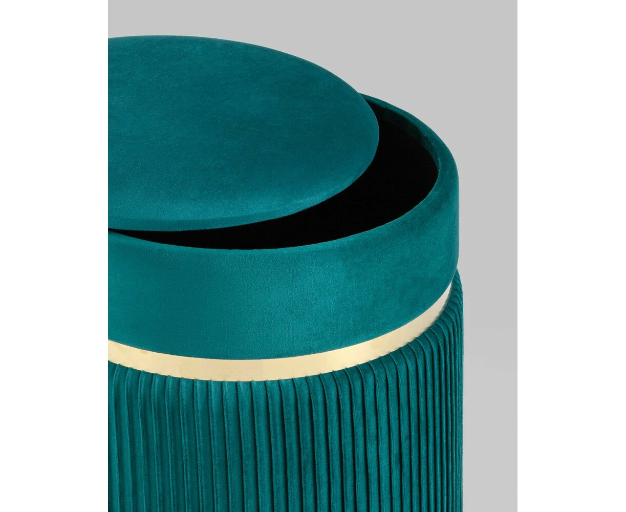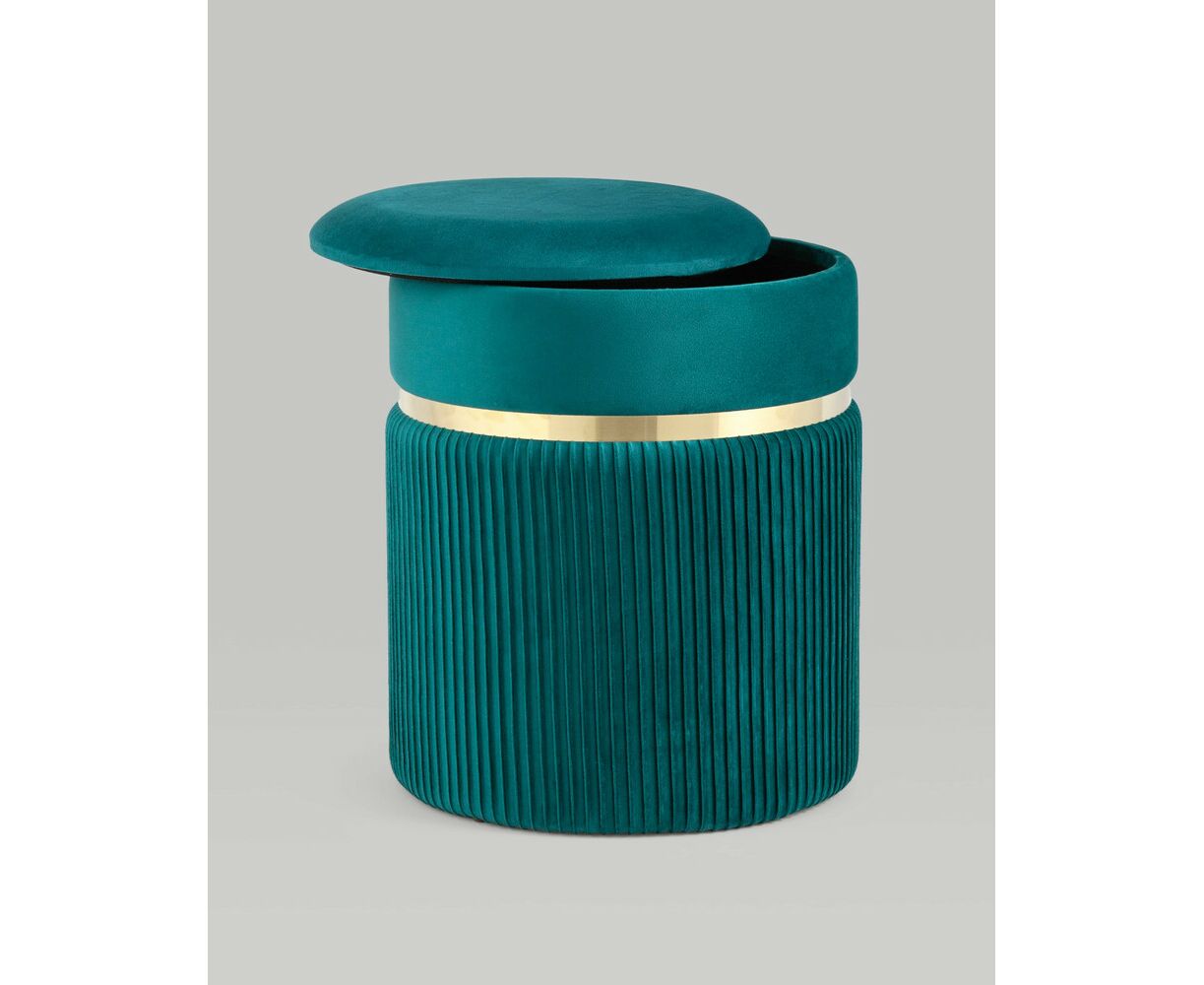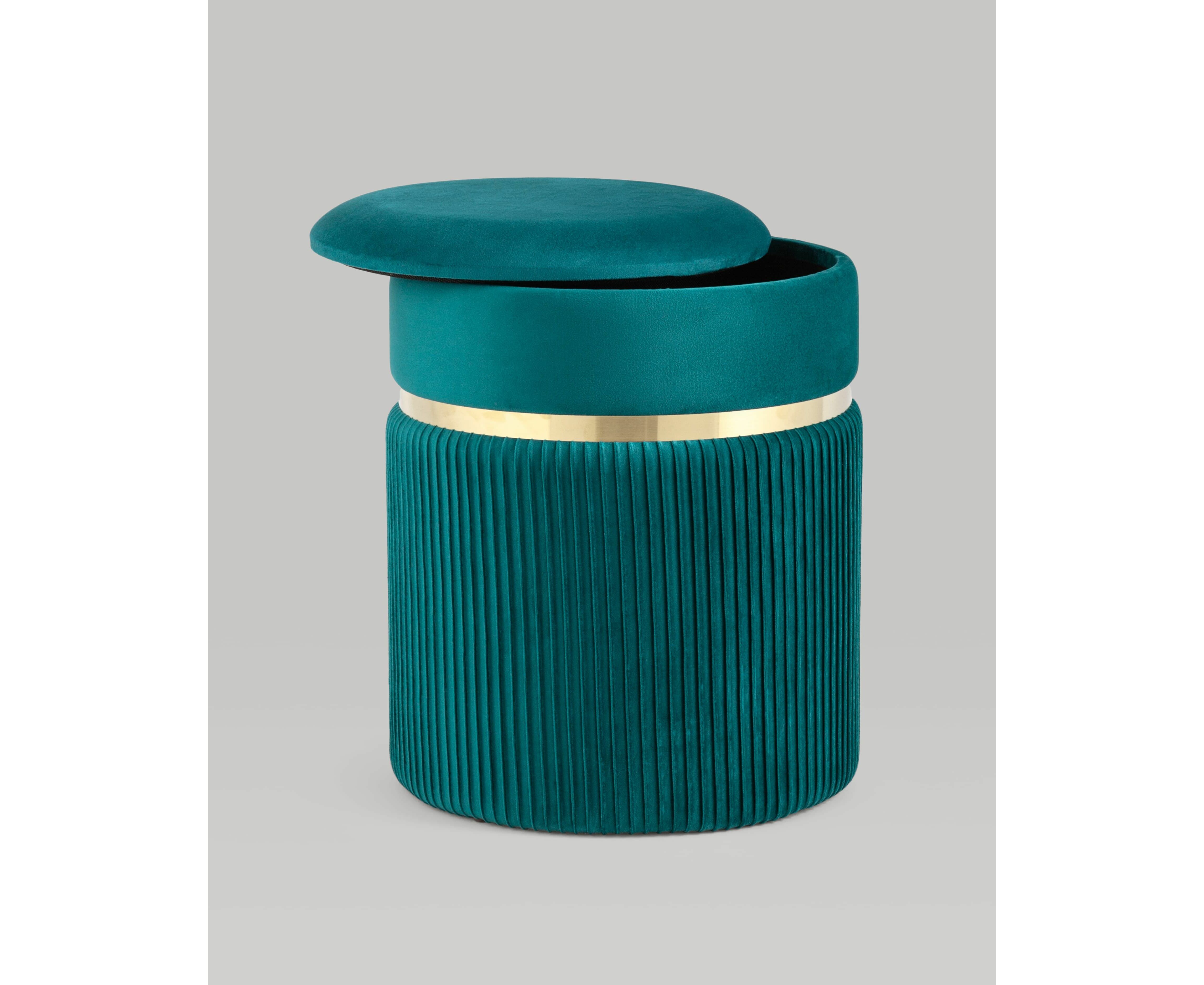 Лаконичная модель пуфа в обивке из мягкого велюра, которая дополнит интерьер вашего дома. Обивка красиво украшена декоративными оборками и металлическим ободком в золотом цвете. Под сиденьем имеется ящик для хранения различных мелочей. В основании предусмотрены специальные подпятники, которые делают пуф более устойчивым и предотвращают скольжение.
