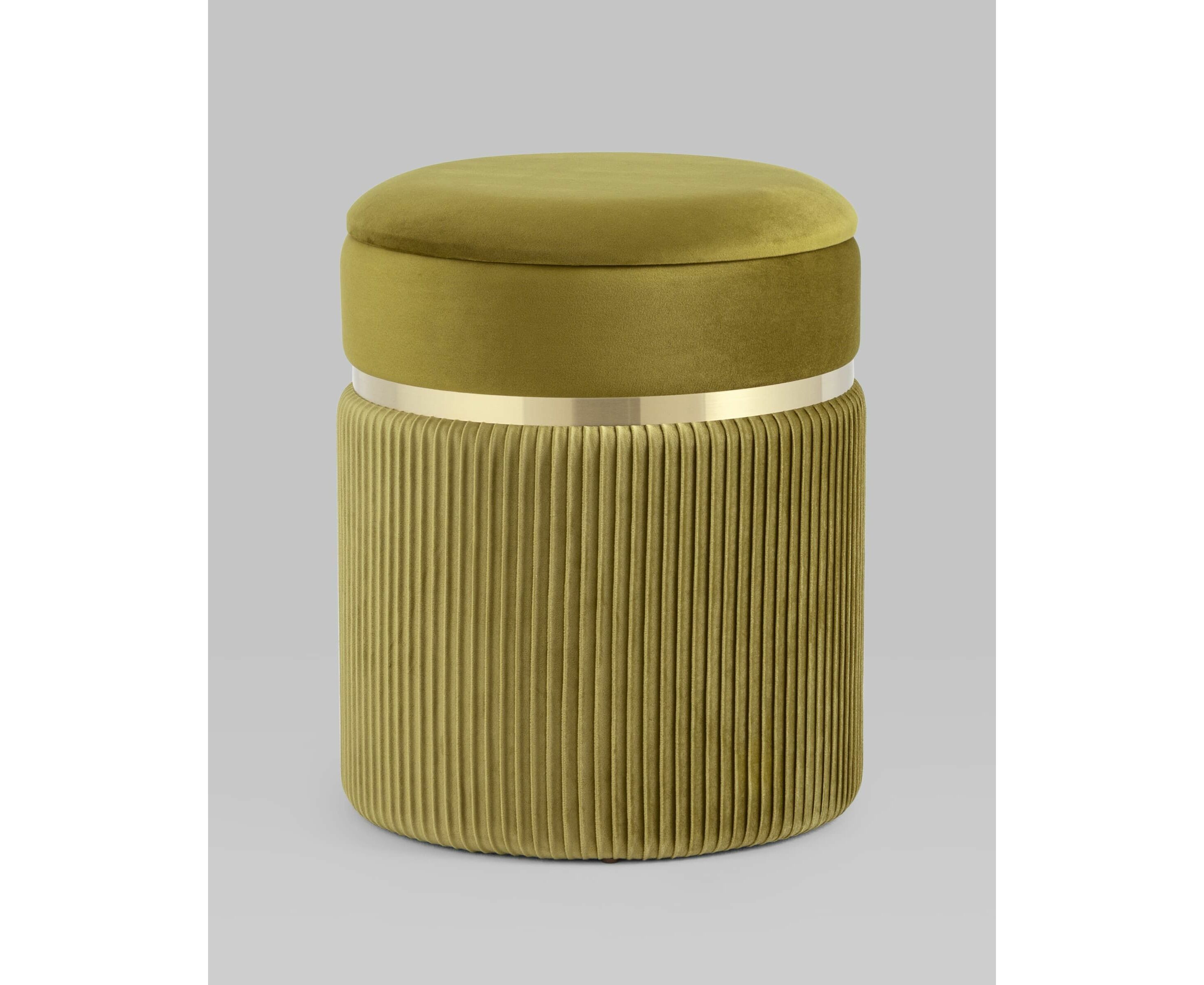 Лаконичная модель пуфа в обивке из мягкого велюра, которая дополнит интерьер вашего дома. Обивка красиво украшена декоративными оборками и металлическим ободком в золотом цвете. Под сиденьем имеется ящик для хранения различных мелочей. В основании предусмотрены специальные подпятники, которые делают пуф более устойчивым и предотвращают скольжение.