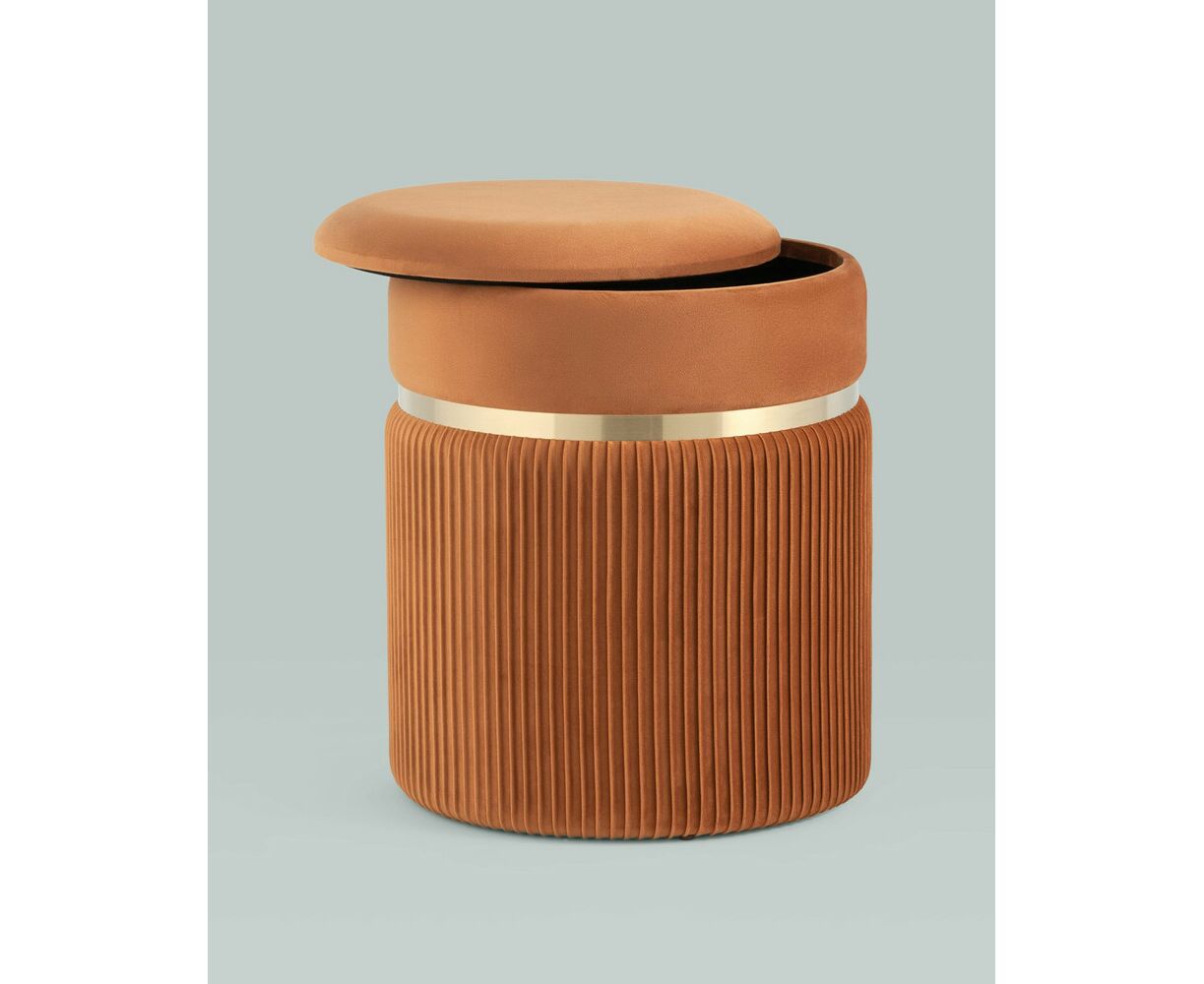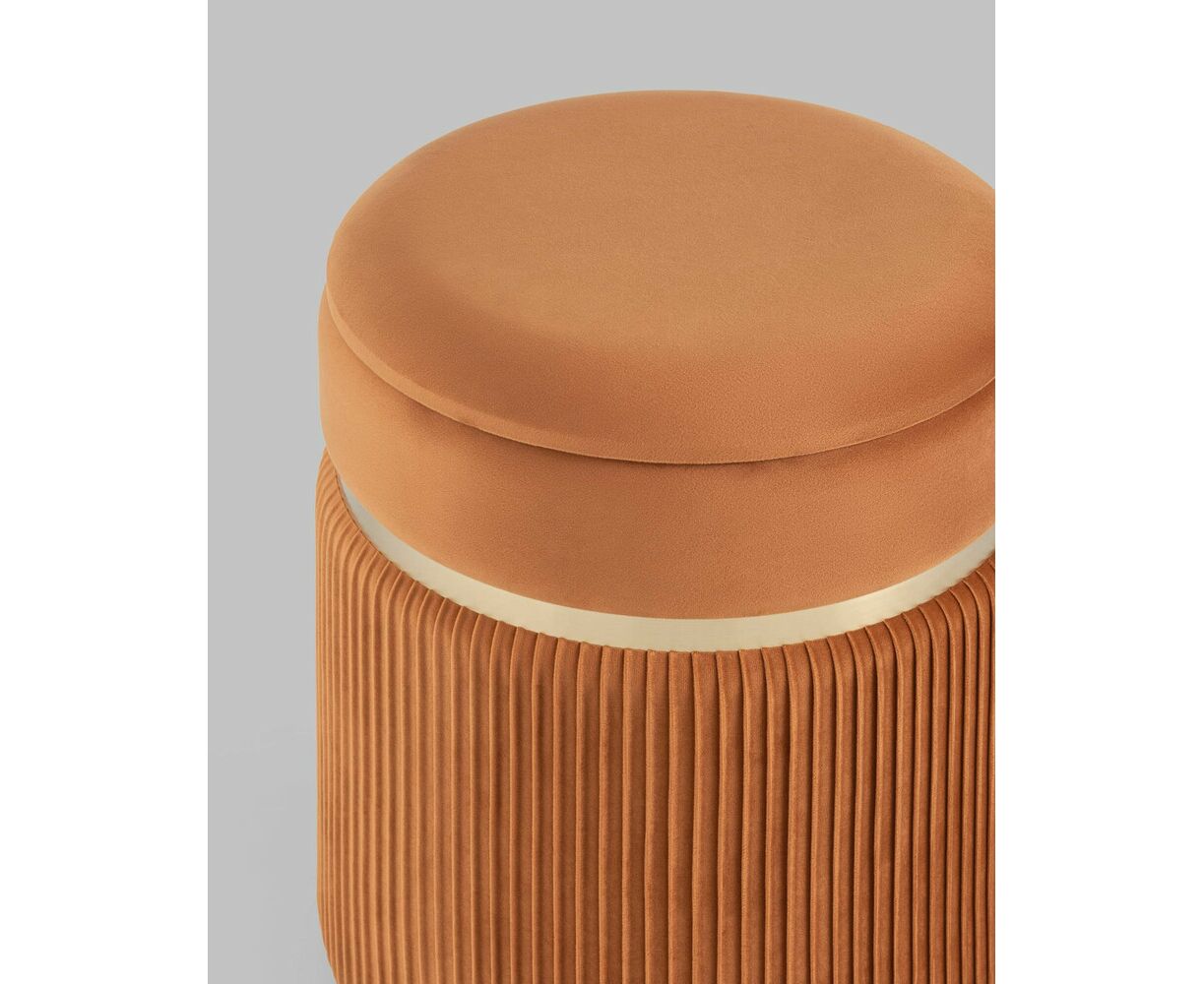 Лаконичная модель пуфа в обивке из мягкого велюра, которая дополнит интерьер вашего дома. Обивка красиво украшена декоративными оборками и металлическим ободком в золотом цвете. Под сиденьем имеется ящик для хранения различных мелочей. В основании предусмотрены специальные подпятники, которые делают пуф более устойчивым и предотвращают скольжение.