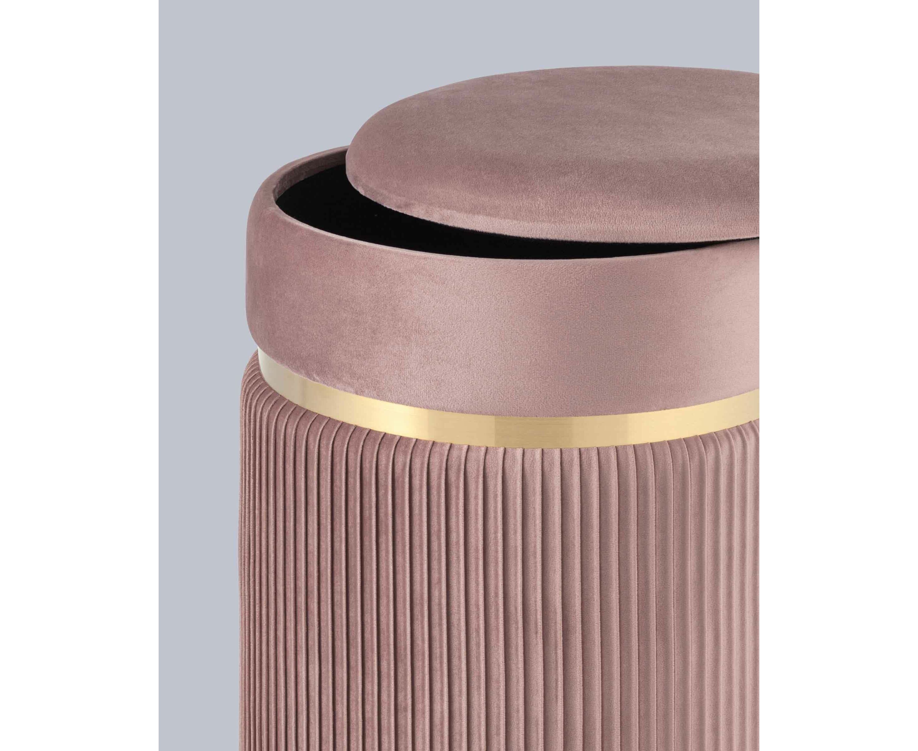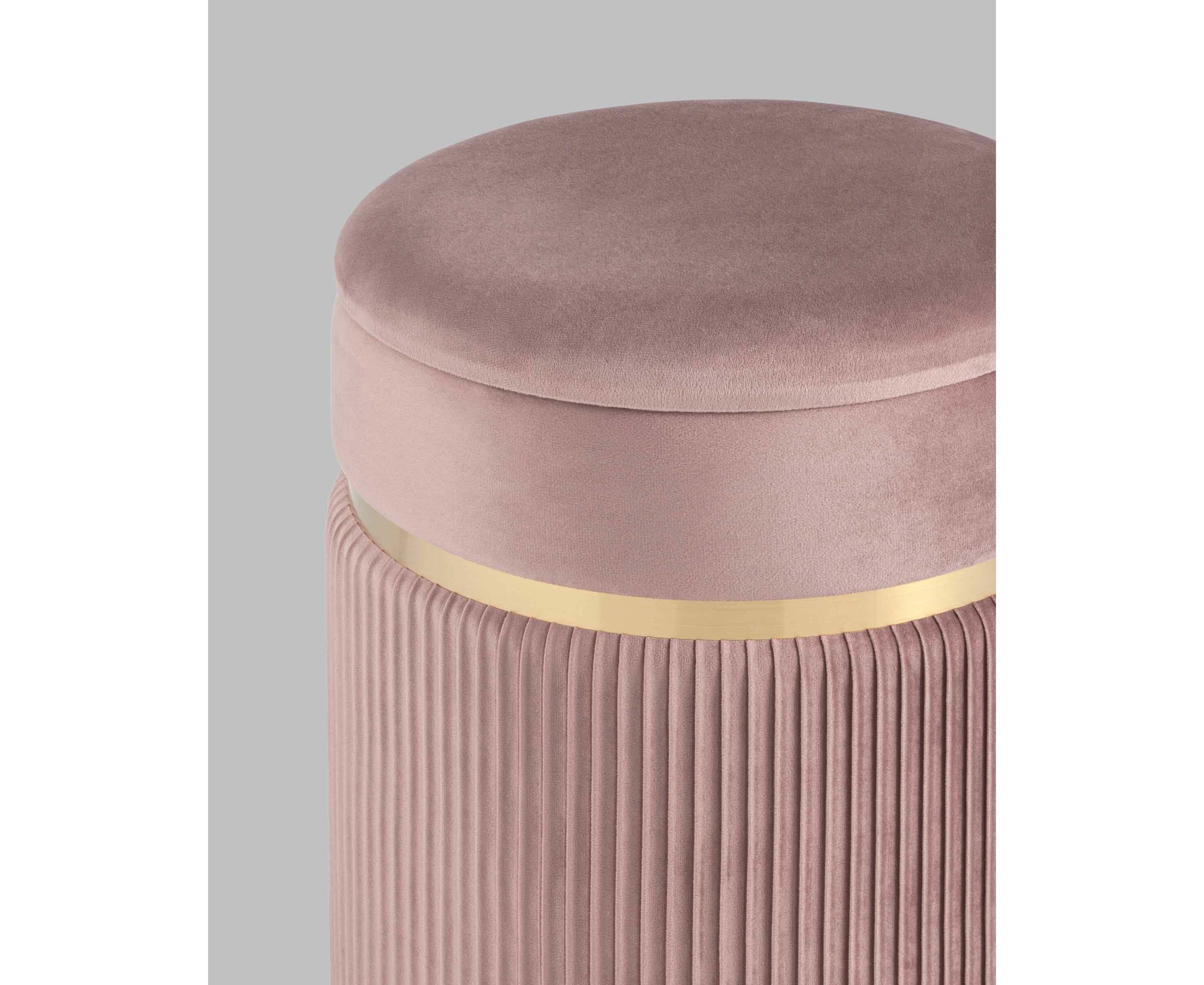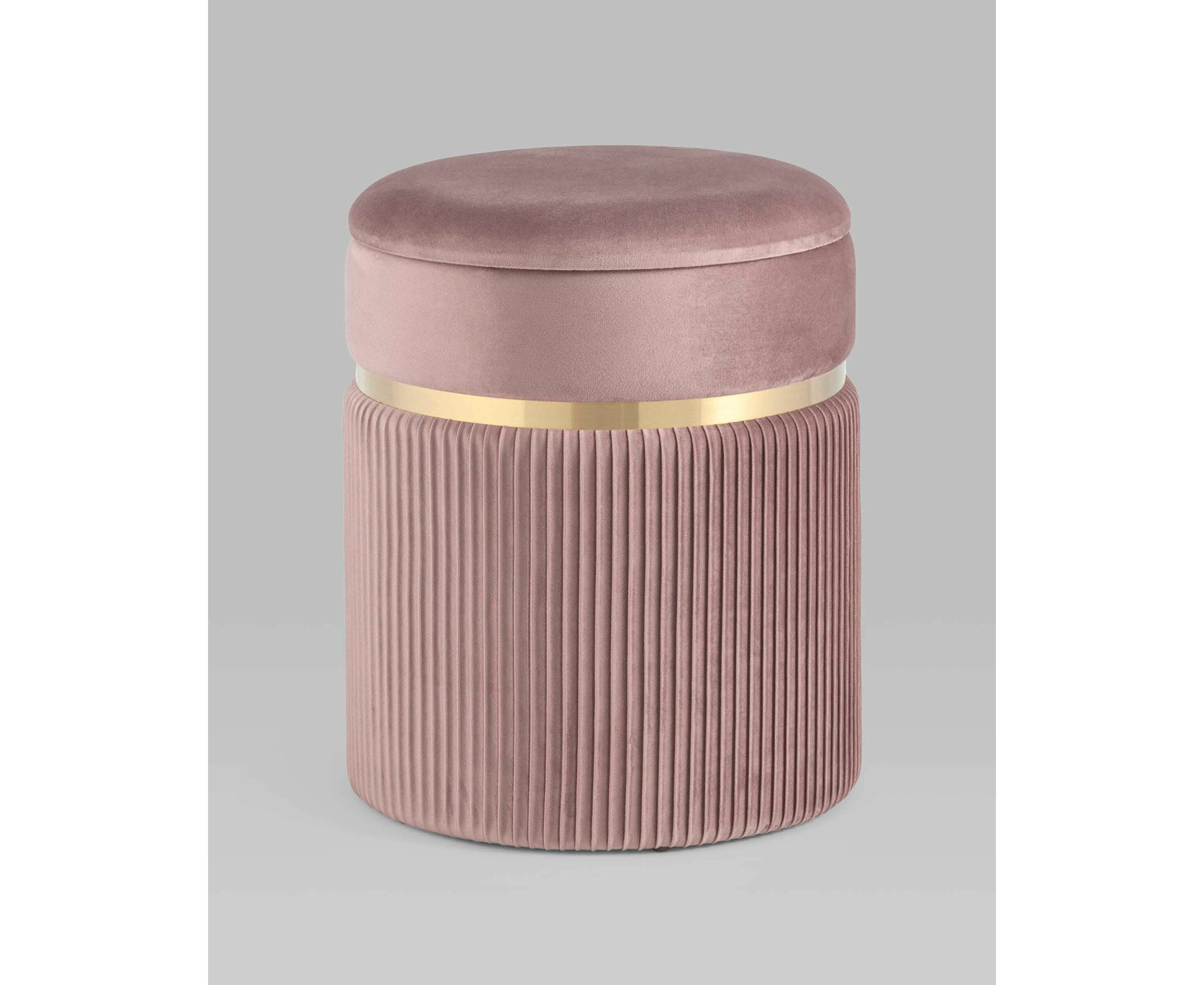 Лаконичная модель пуфа в обивке из мягкого велюра, которая дополнит интерьер вашего дома. Обивка красиво украшена декоративными оборками и металлическим ободком в золотом цвете. Под сиденьем имеется ящик для хранения различных мелочей. В основании предусмотрены специальные подпятники, которые делают пуф более устойчивым и предотвращают скольжение.