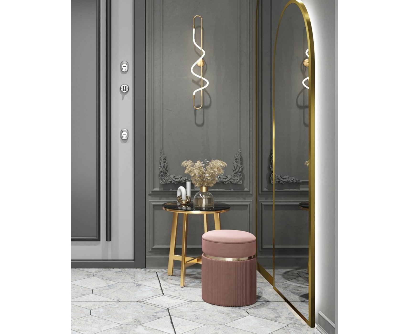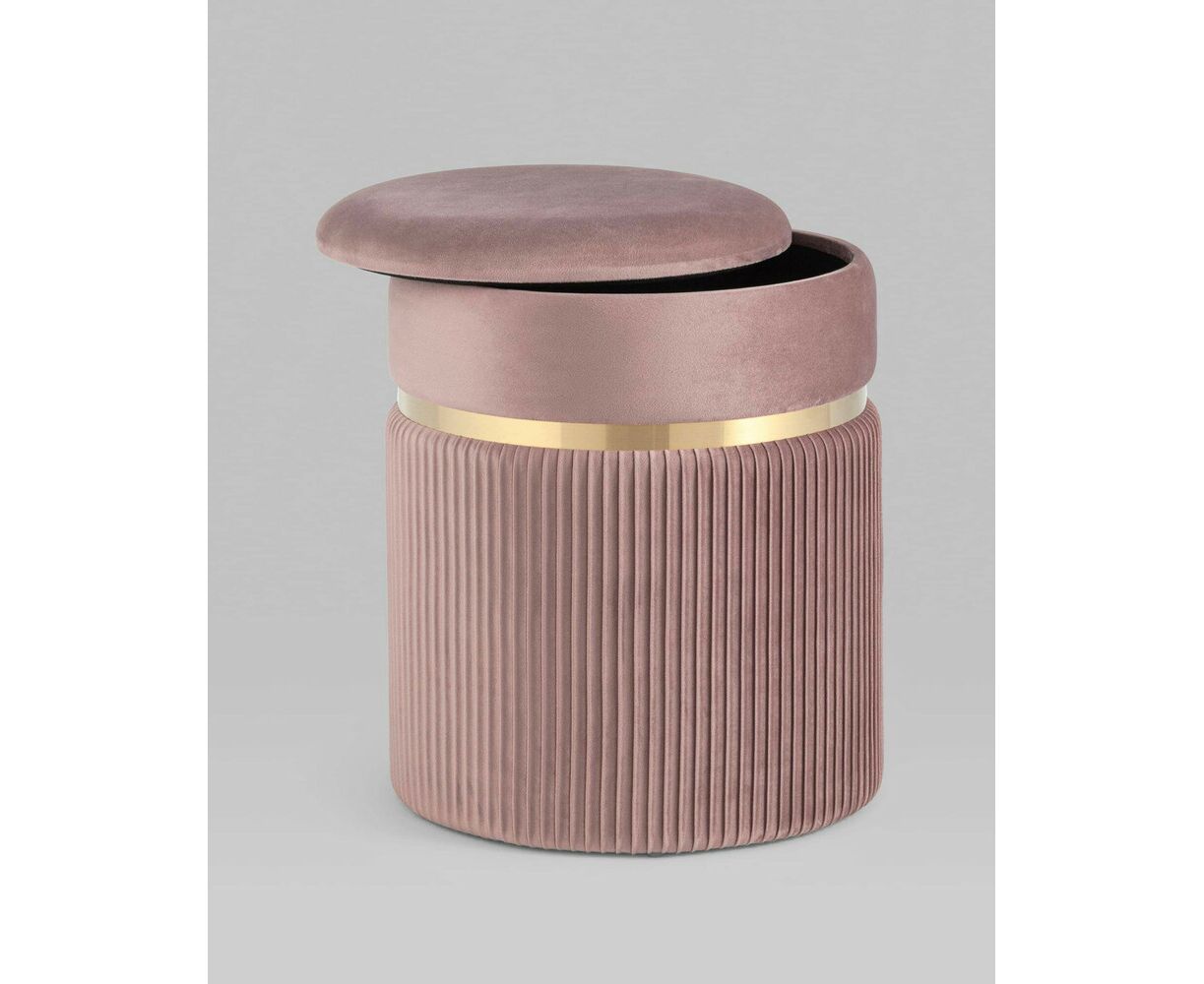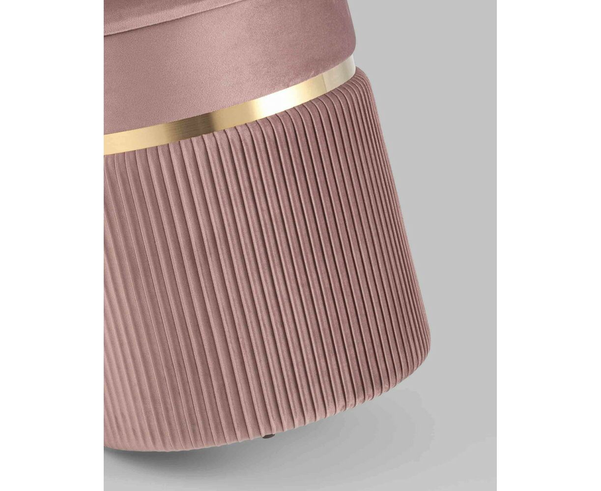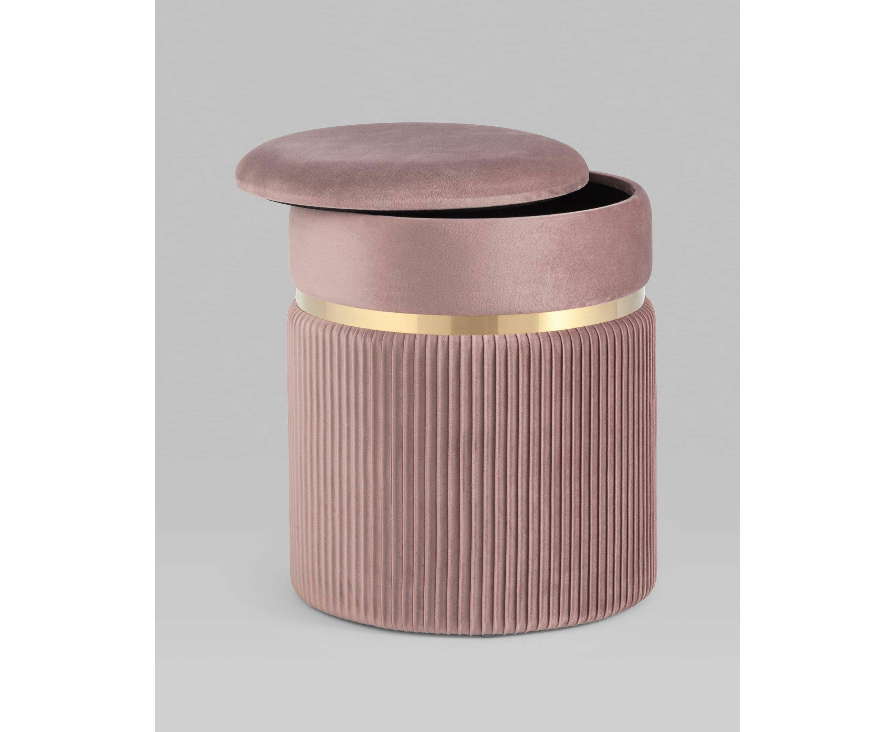 Лаконичная модель пуфа в обивке из мягкого велюра, которая дополнит интерьер вашего дома. Обивка красиво украшена декоративными оборками и металлическим ободком в золотом цвете. Под сиденьем имеется ящик для хранения различных мелочей. В основании предусмотрены специальные подпятники, которые делают пуф более устойчивым и предотвращают скольжение.