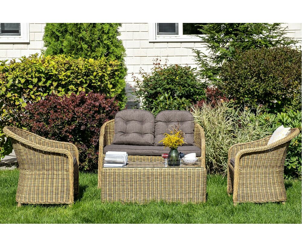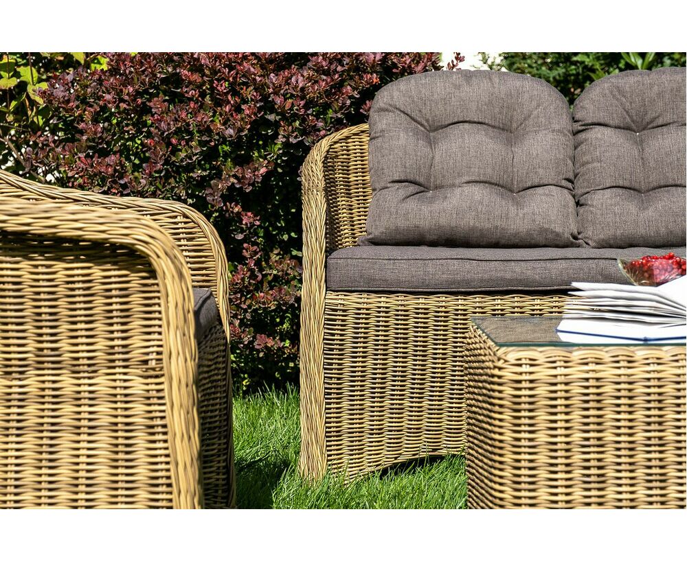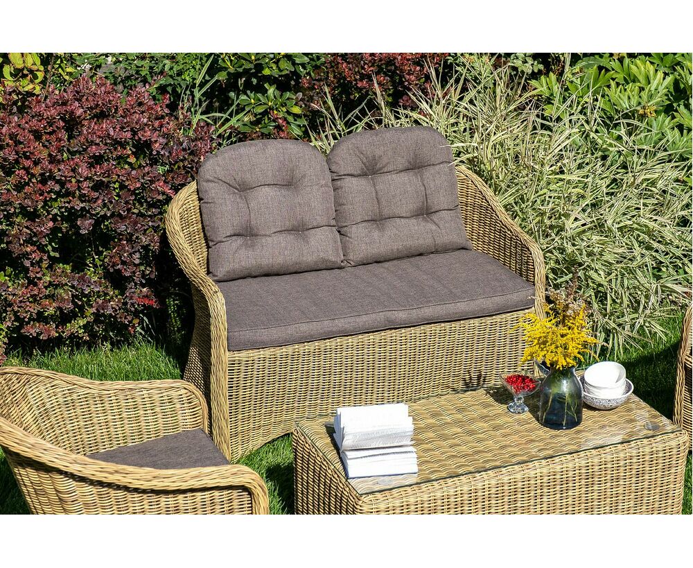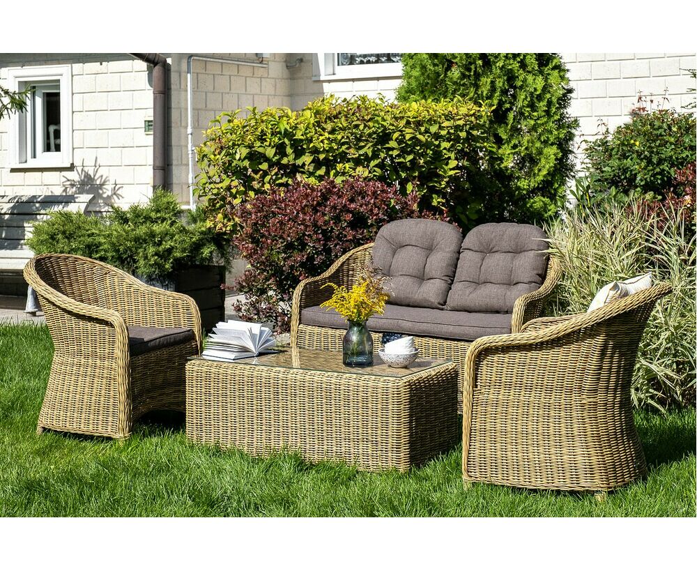 Комплект выполнен из круглого искусственного ротанга соломенного цвета. Каркас - из легкого и прочного алюминия. Подушки со съемными чехлами - из 100% полиэстера, плотностью 230гр/м2 с влагоотталкивающей пропиткой. "Равенна" диван двухместный плетенный из ротанга, цвет соломенный 1шт. 1 180Х680Х810, "Равенна" плетеное кресло из искусственного ротанга, цвет соломенный с серой подушкой 2шт. 570Х680Х810, "Кон Панна" столик журнальный из искусственного ротанга, цвет соломенный 1шт. 1 000Х500Х420,