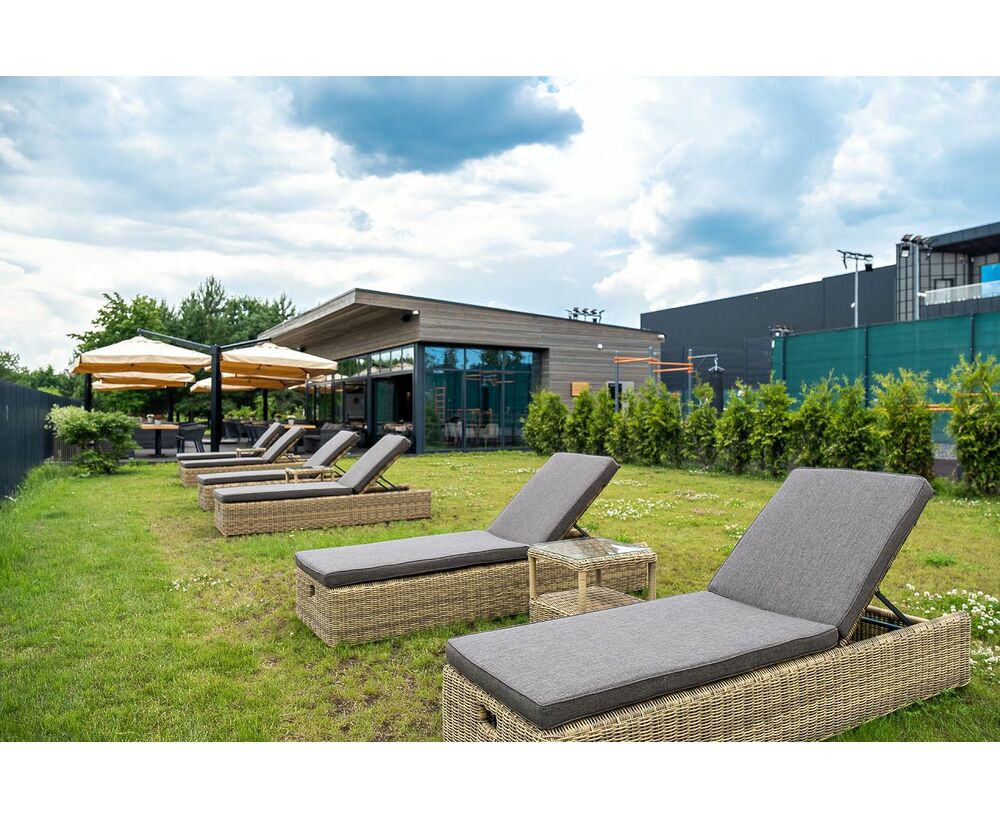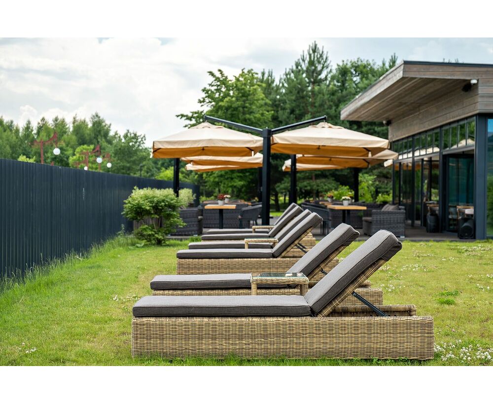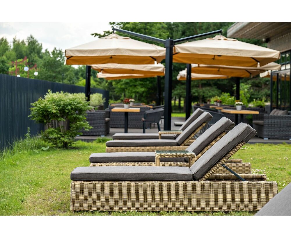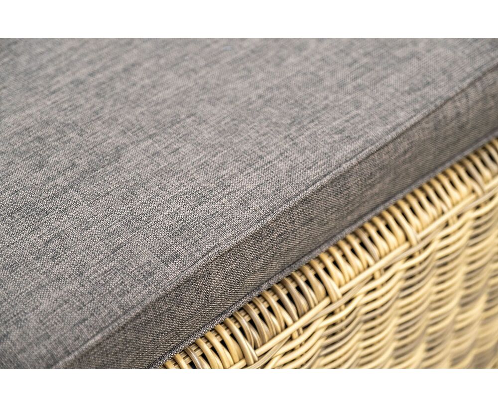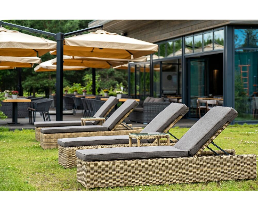 Есть несколько пазов, благодаря которым можно поднимать или опускать спинку. Также комфорт обеспечивает мягкий матрас. Съемный чехол серо-коричневого цвета изготовлен из 100%-го полиэстера с водоотталкивающим эффектом. Мебель оплетена вручную.