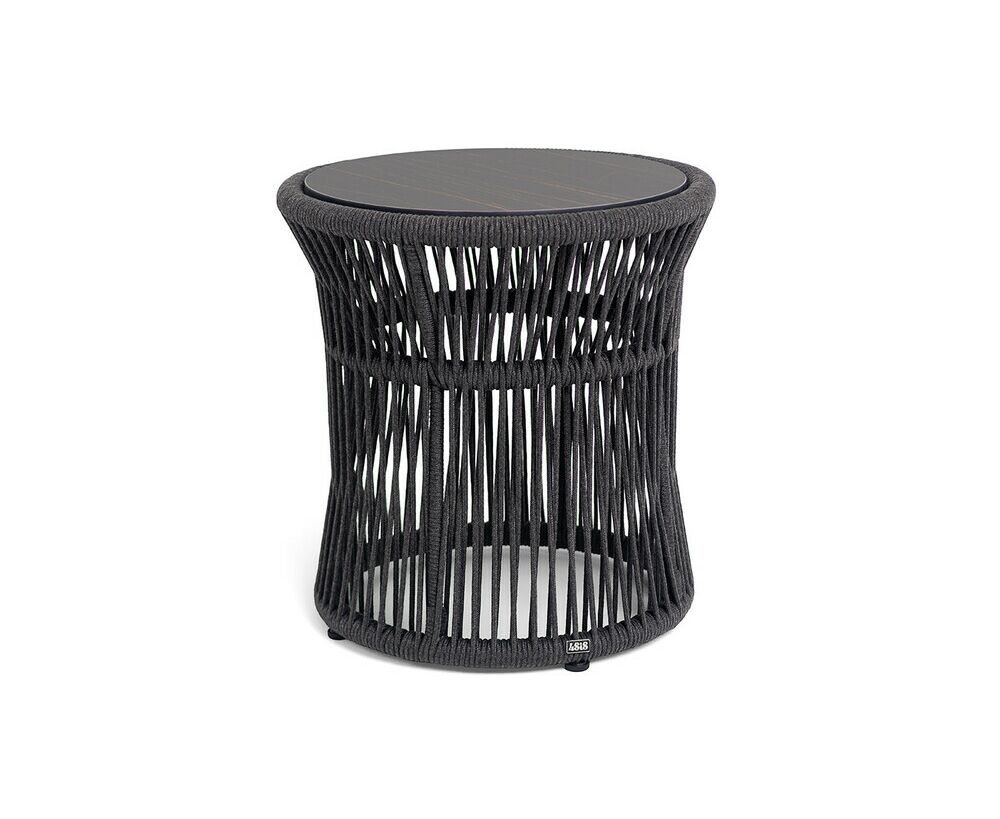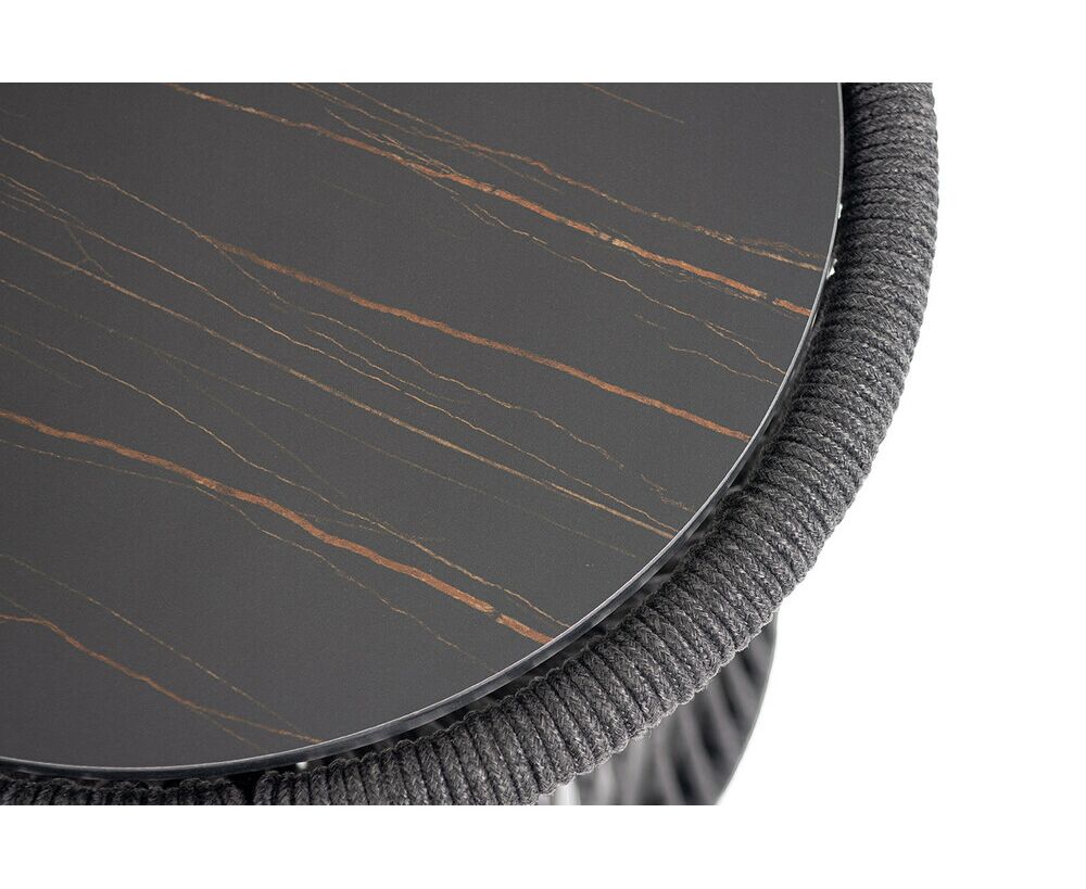 "Романо" журнальный стол из HPL круглый Ø45 H47, каркас из алюминия черный муар, цвет "черный мрамор", роуп темно серый круглый