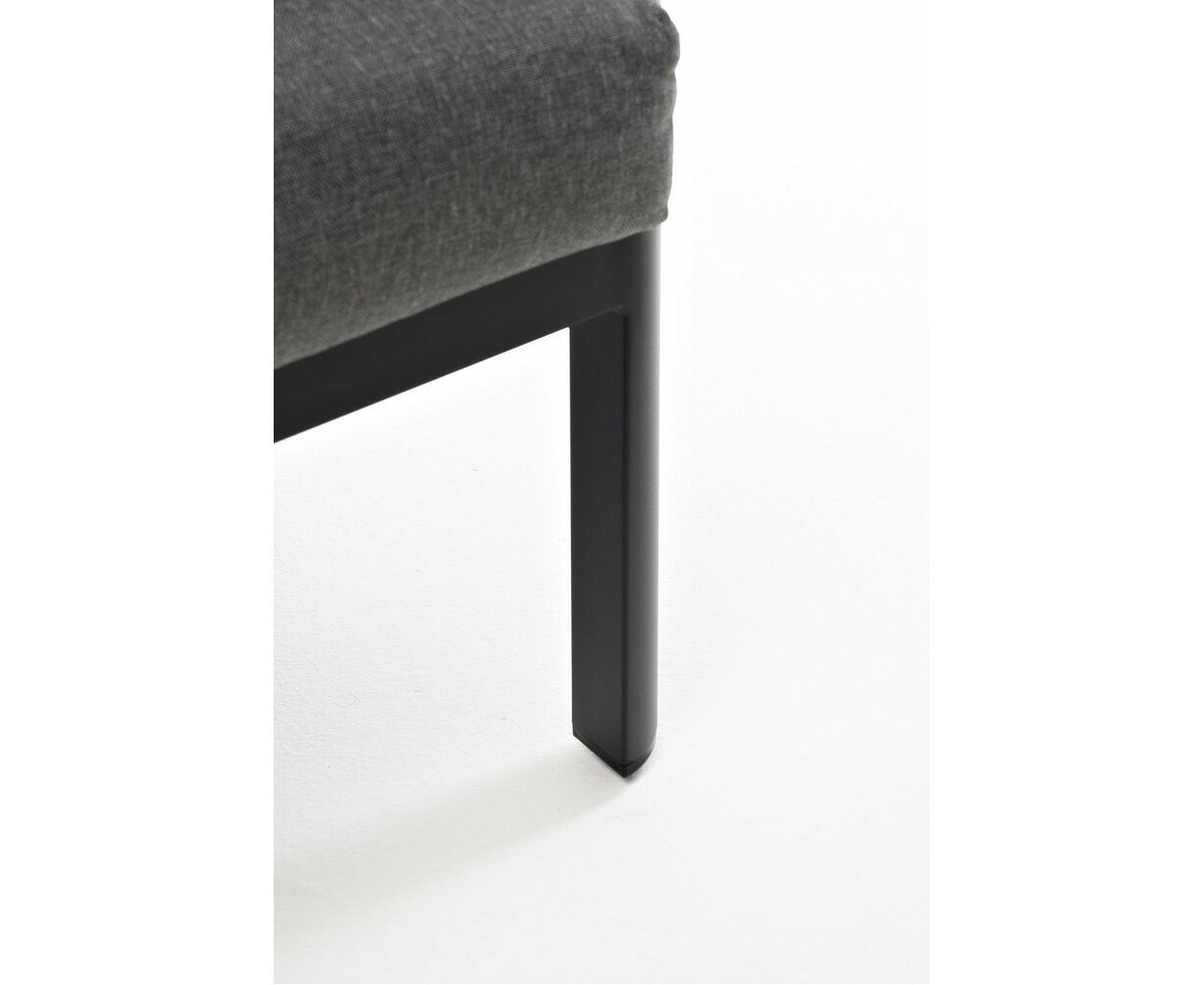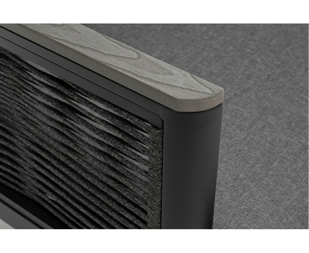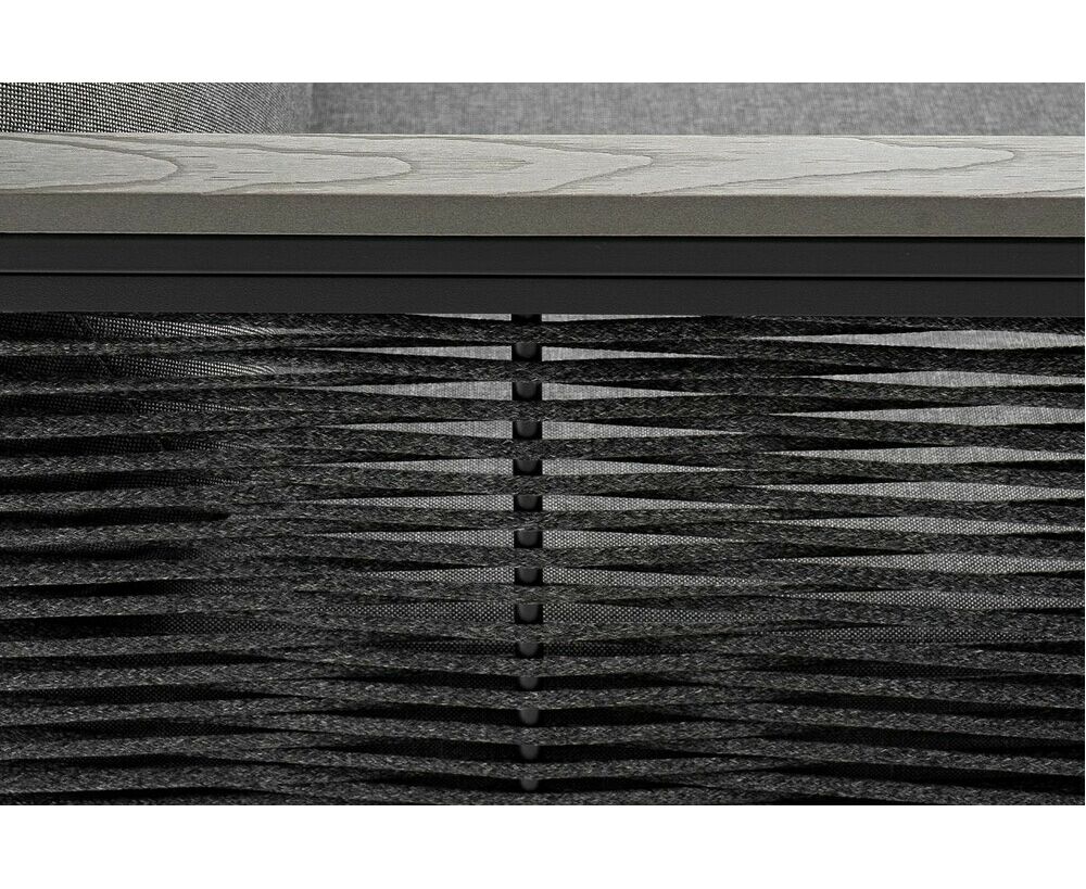 Каркас выполнен из высококачественного алюминия и окрашен порошковой краской в темно-серый цвет. Боковые стороны подлокотников вручную оплетены эластичными синтетическими лентами серого оттенка, состоящие из высокопрочных полиэфирных волокон.
