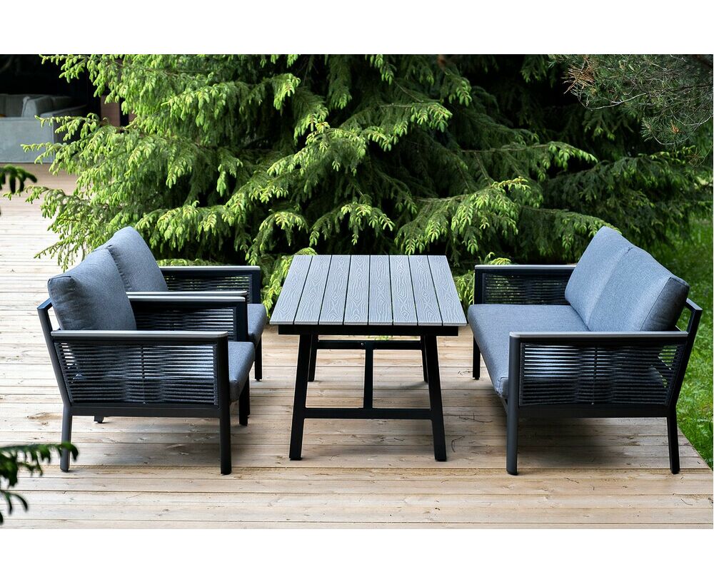 Диван и кресла оснащены подушками серого цвета со съемными чехлами. Стол со столешницей из ДПК. "Сан Ремо" кресло плетеное из роупа садовое, каркас алюминий темно-серый, роуп серый, ткань серая 2шт. 680Х780Х700, "Сан Ремо" диван 2-местный плетеный из роупа, каркас алюминий темно-серый, роуп серый, ткань серая 1шт. 1 460Х780Х700, "Сан Ремо" стол обеденный из ДПК, каркас алюминиевый темно-серый 1шт. 1 500Х800Х650,
