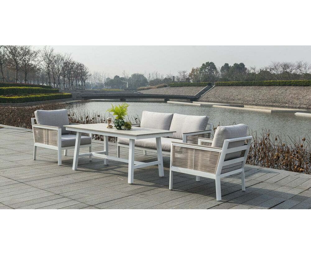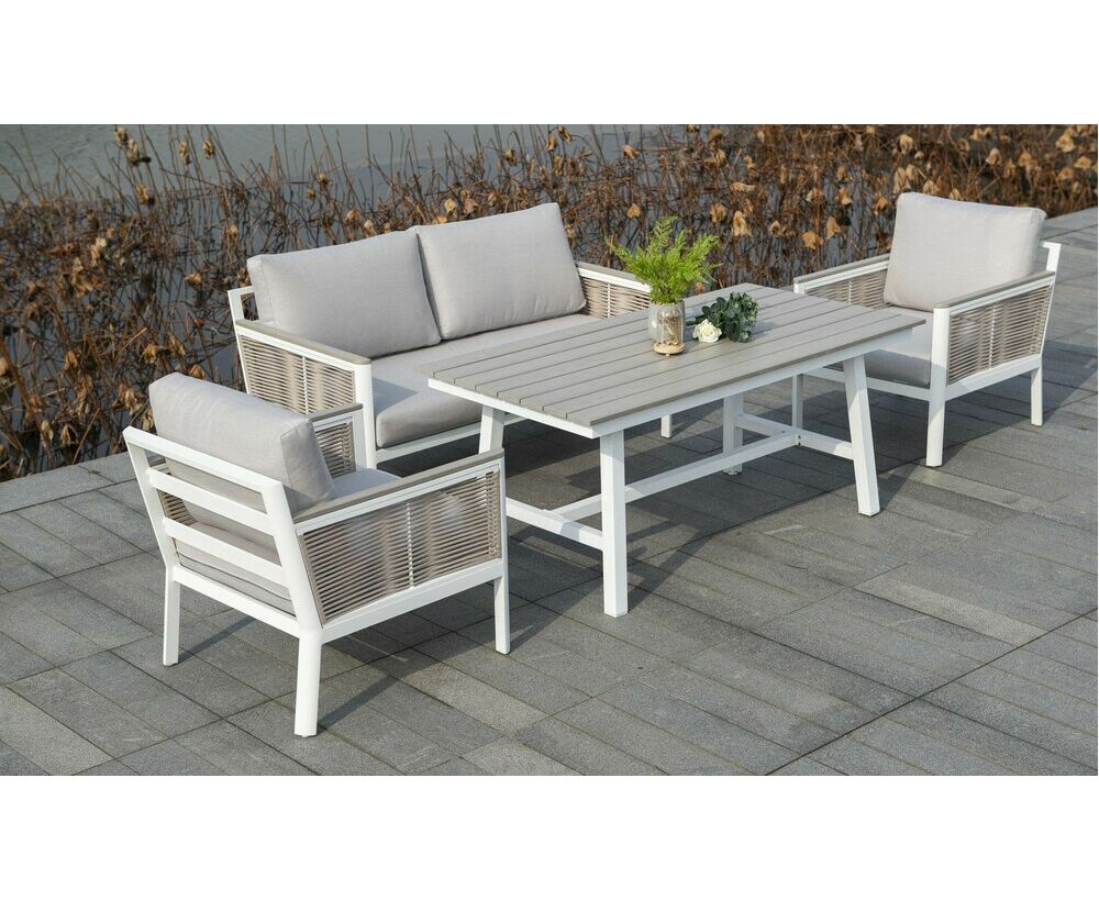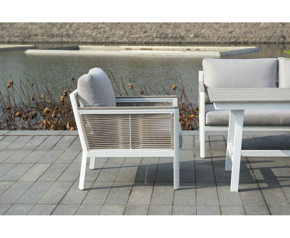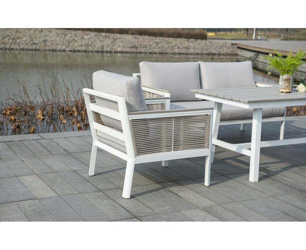 "Сан Ремо" лаунж-зона, алюминиевый каркас белого цвета, вручную оплетенный роупом серо-коричневого цвета.