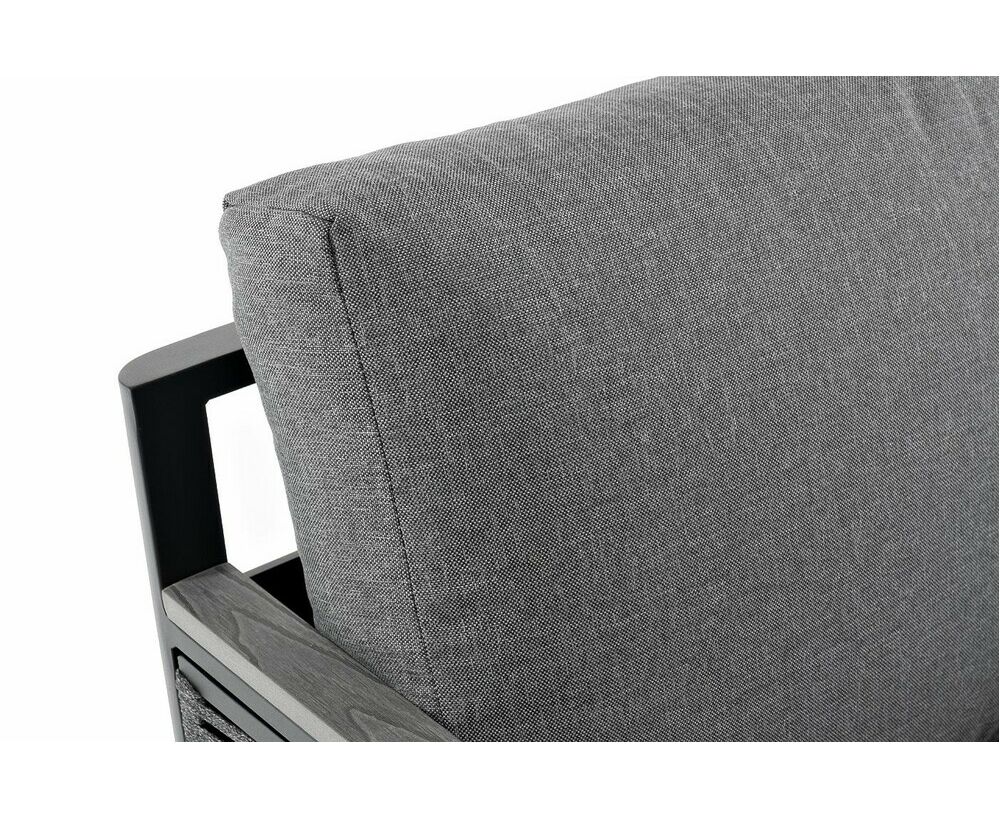 Садовое кресло идет в комплекте с двумя подушками со съемными чехлами. Они выполнены в сером цвете. Изделия изготовлены из прочного полиэстера, плотностью 300гр/м2. Ткань имеет влагоотталкивающую пропитку.