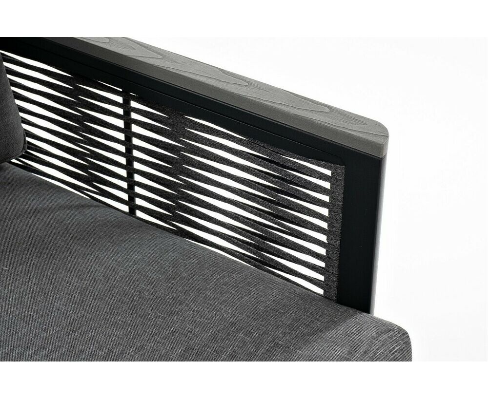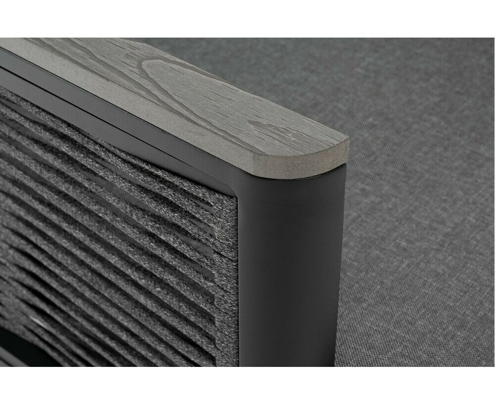 Размер модели – 680×780×700 мм. Ее каркас выполнен из высококачественного алюминия и окрашен порошковой краской в темно-серый цвет. Боковые стороны подлокотников вручную оплетены эластичными синтетическими лентами серого оттенка, состоящие из высокопрочных полиэфирных волокон.