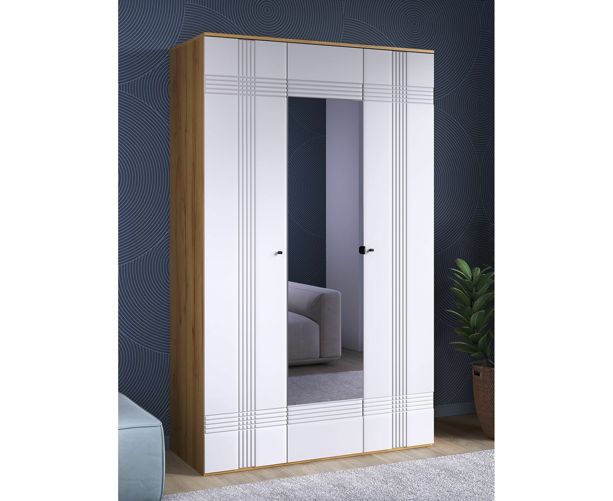 Шкаф для одежды выпускается в двух исполнениях: дуб крафт золотой + серо-зеленый; дуб крафт золотой + глянец белый. Поверхность фасадов в синем исполнении – невероятно приятная на ощупь с эффектом soft touch. Серо-зеленый цвет станет украшением интерьера спальни. Шкаф в белом исполнении с белыми глянцевыми фасадами добавит интерьеру света и тепла.