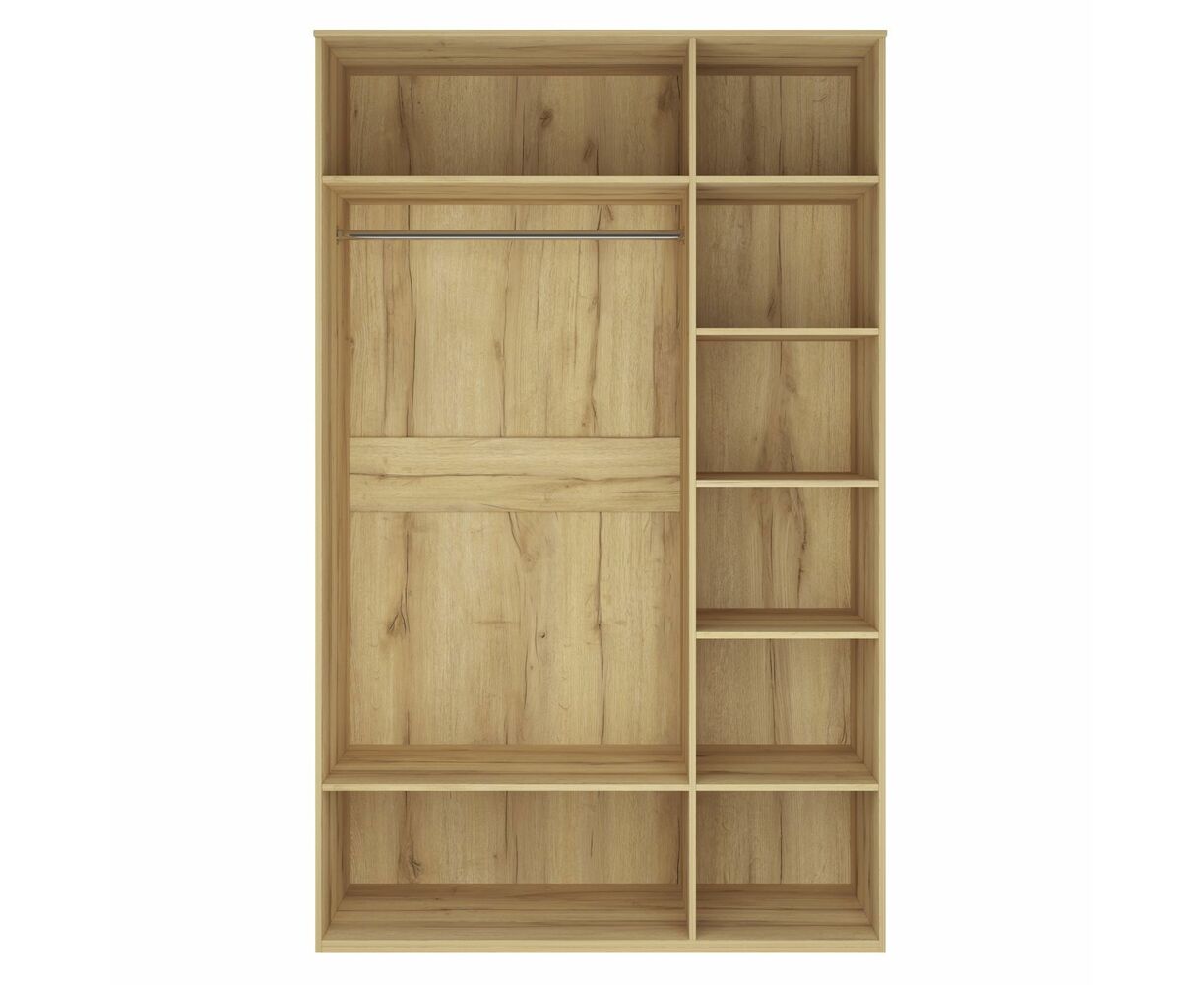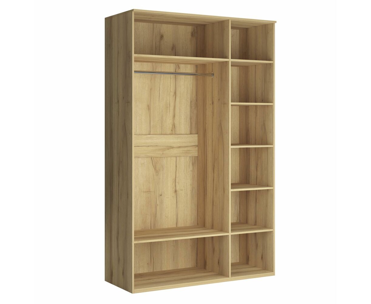 Шкаф для одежды оснащен штангой и полками для хранения. Шкаф трехдверный комплектуется глухими и зеркальным фасадом. Материал фасадов – МДФ в пленке ПВХ – глянцевой или матовой в зависимости от исполнения. Наличие зеркала добавит комнате света и визуально расширит пространство.