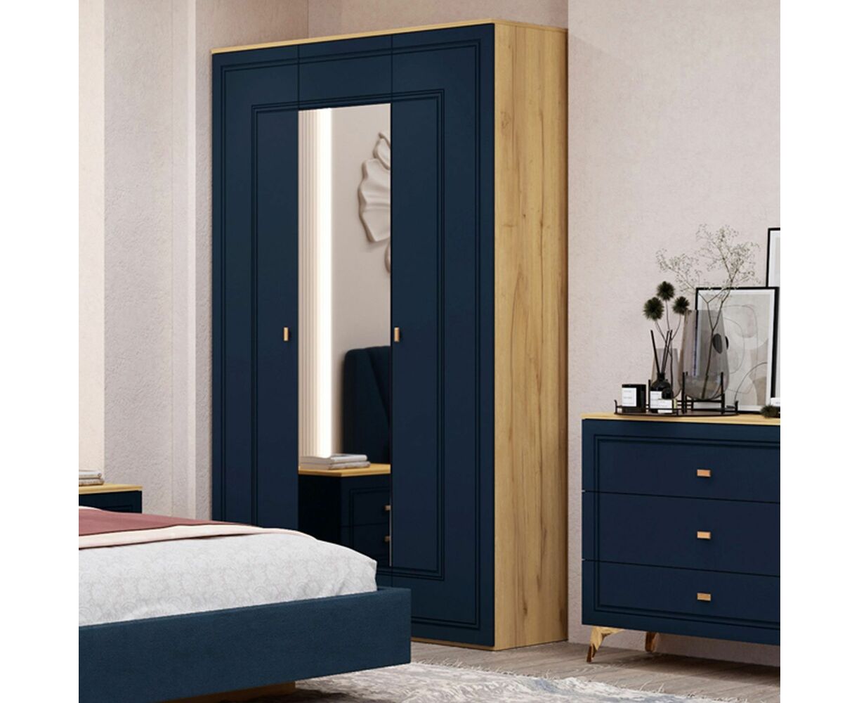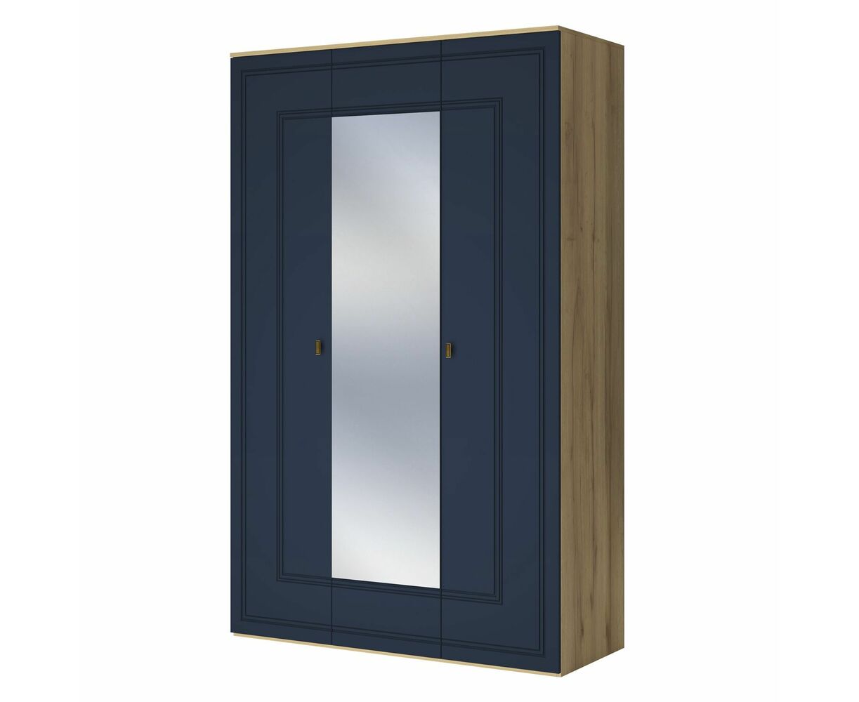 Шкаф для одежды выпускается в двух исполнениях: дуб золотистый + синий софт; дуб золотистый + глянец белый. Поверхность фасадов в синем исполнении – невероятно приятная на ощупь с эффектом soft touch. Глубокий синий цвет станет украшением интерьера спальни. Шкаф в белом исполнении с белыми глянцевыми фасадами добавит интерьеру света и тепла.