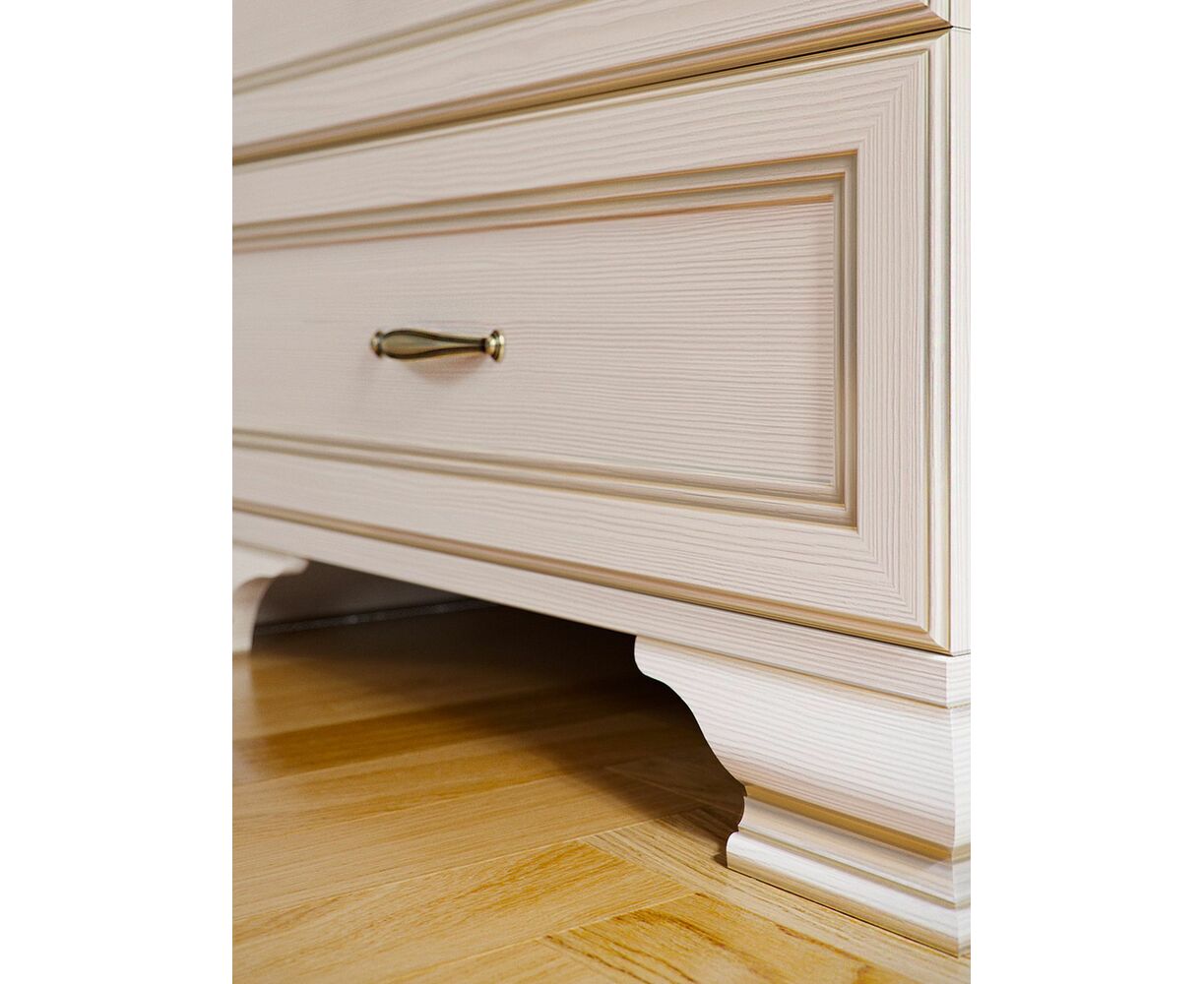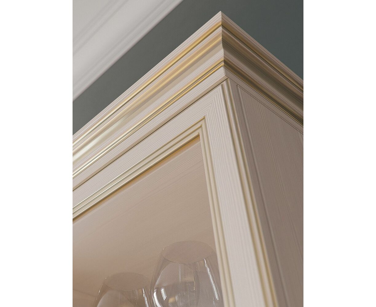 Материал корпуса ЛДСП «Бодега белый» - светлый теплый оттенок с легкой древесной текстурой. Фасады ящиков оформлены накладками МДФ, карниз и опоры имеют рельефную классическую форму. Золотая патина подчеркивает изгибы декоративных деталей, благодаря ей мебель выглядит очень нарядно и эффектно. Фасады украшают металлические ручки цвета старая бронза.