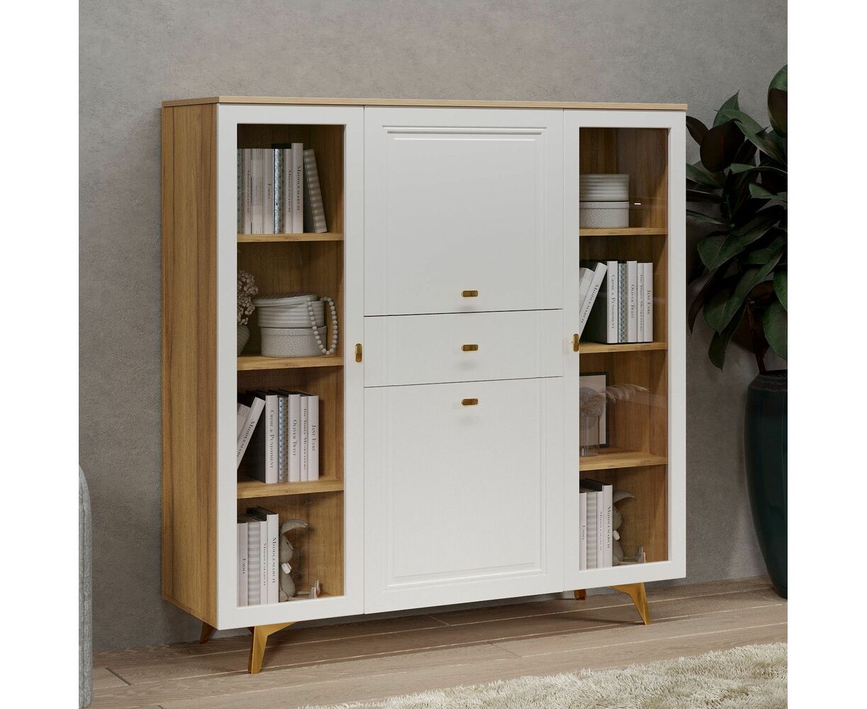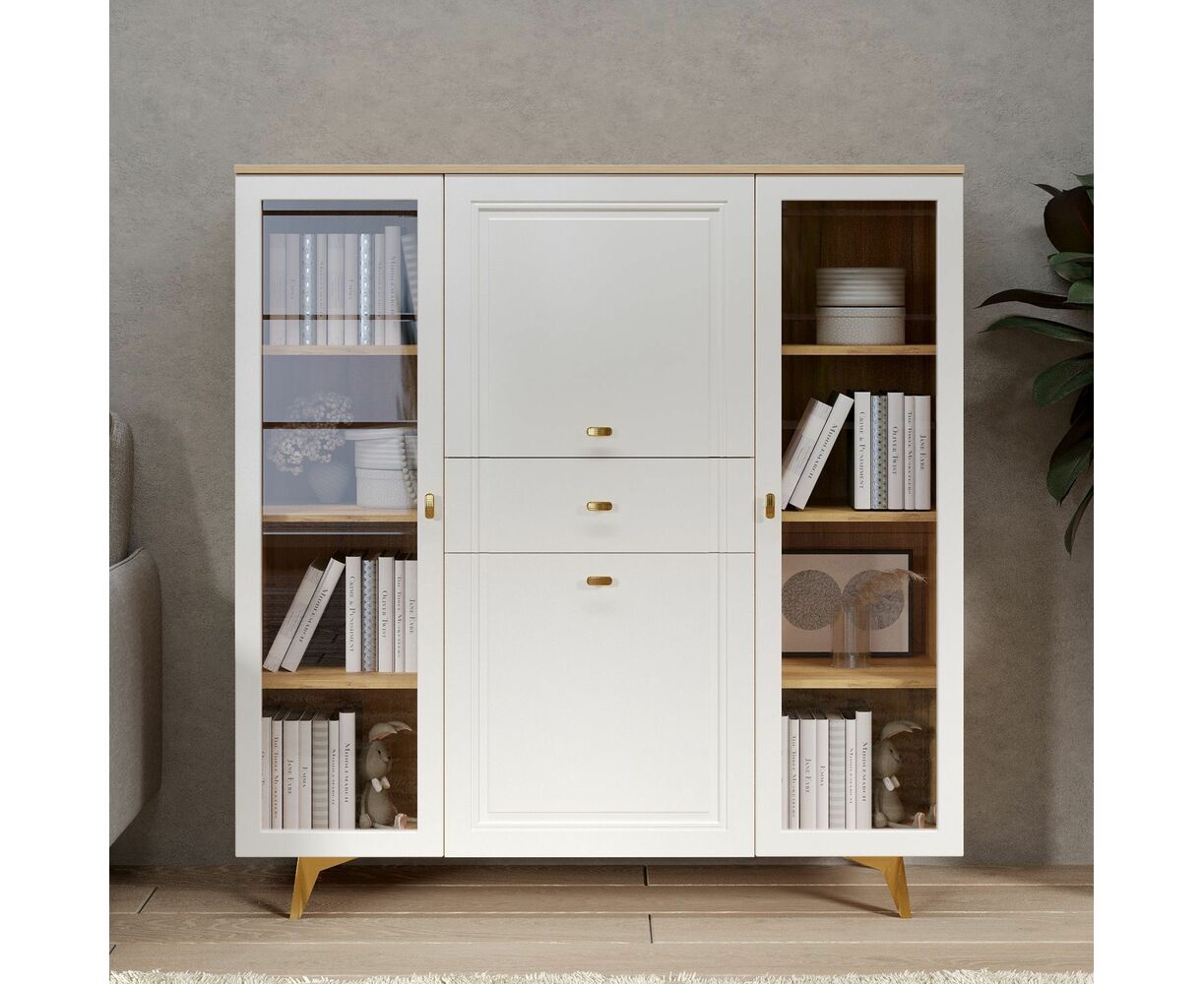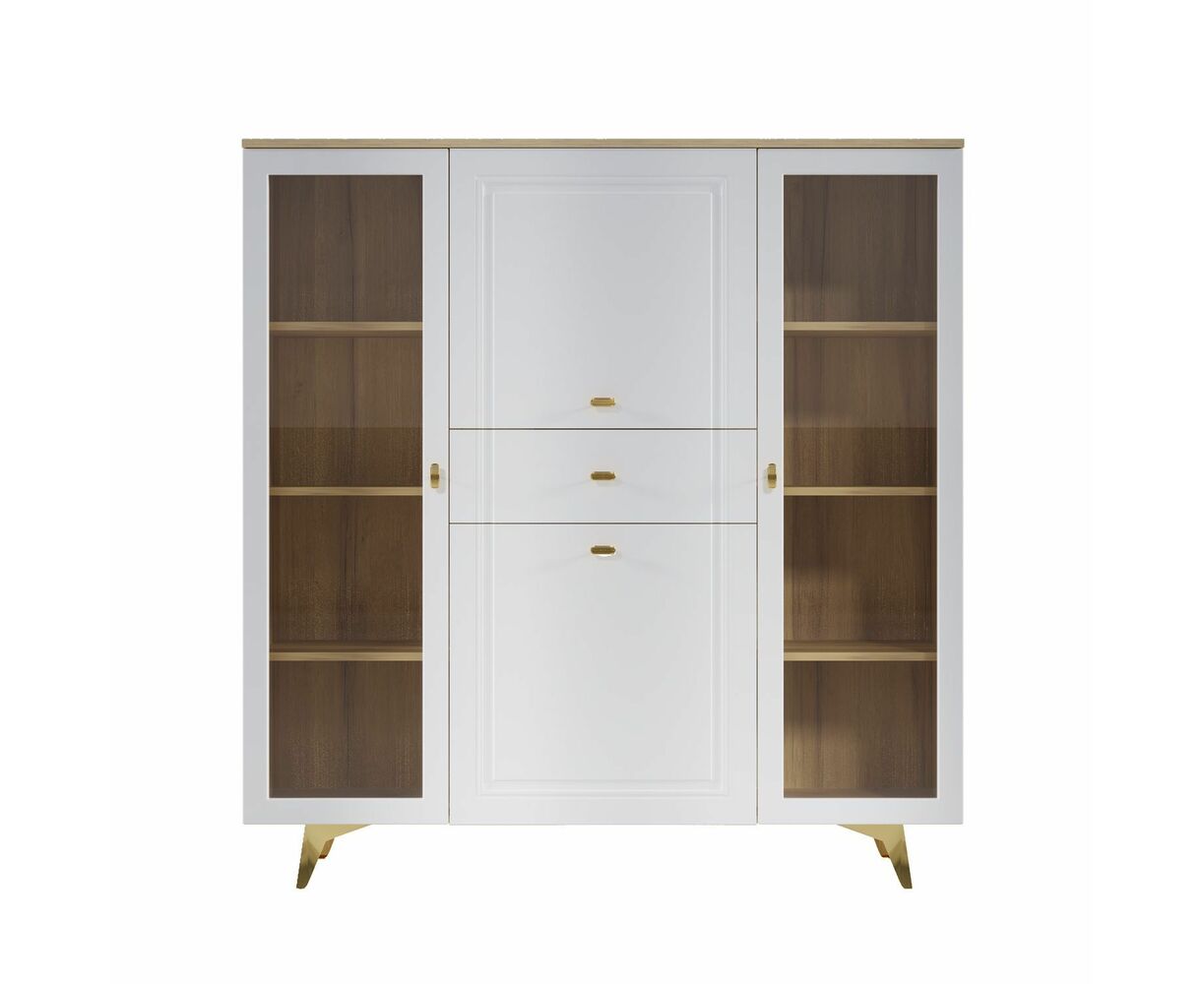 В конструкции модуля предусмотрено отделение для открытого хранения красивой посуды и декоративных предметов, а также два выдвижных ящика, где можно разместить различные мелочи.