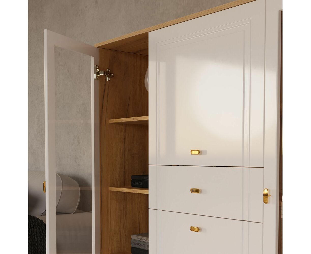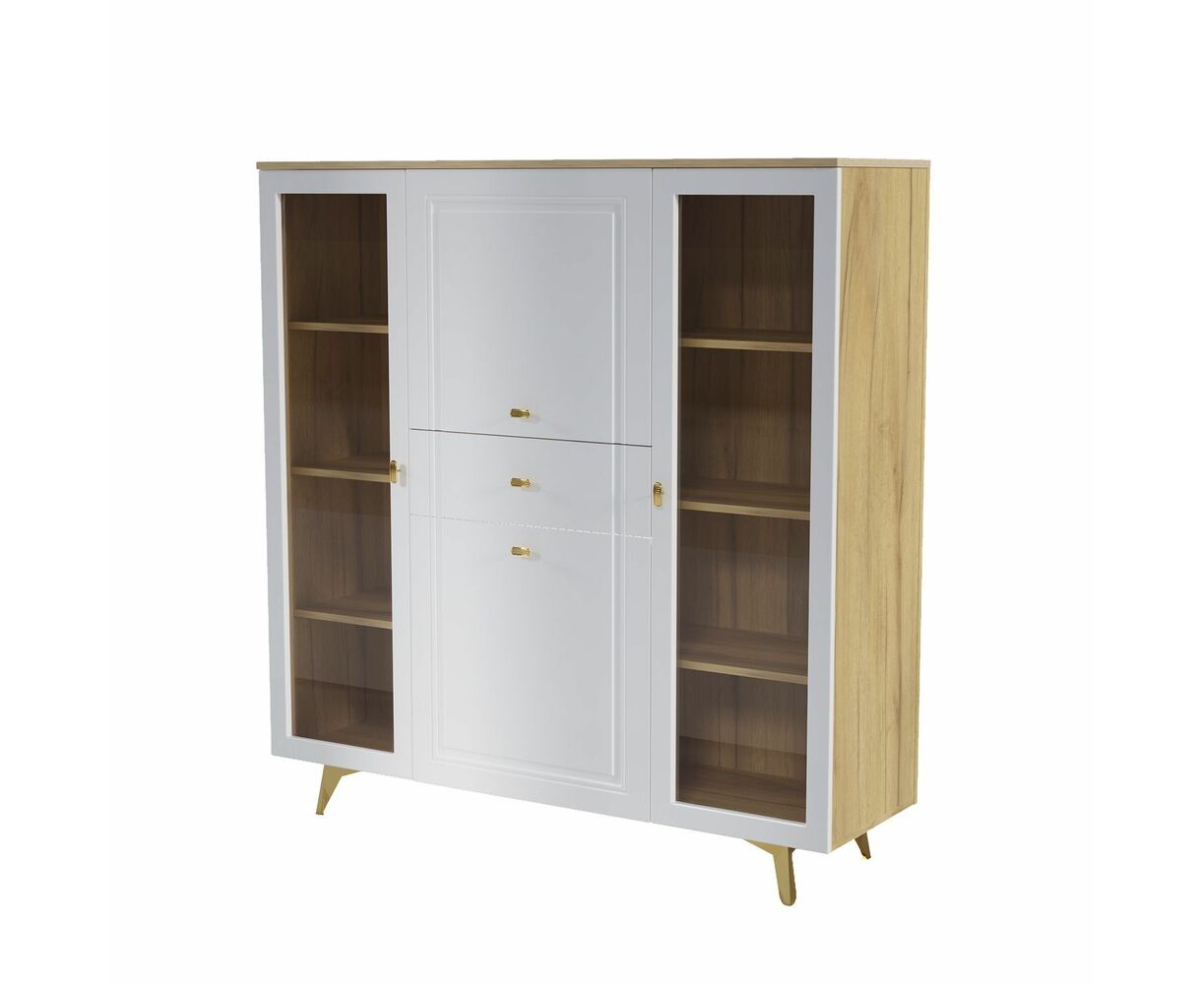 - дуб золотистый корпус с белыми глянцевыми фасадами;