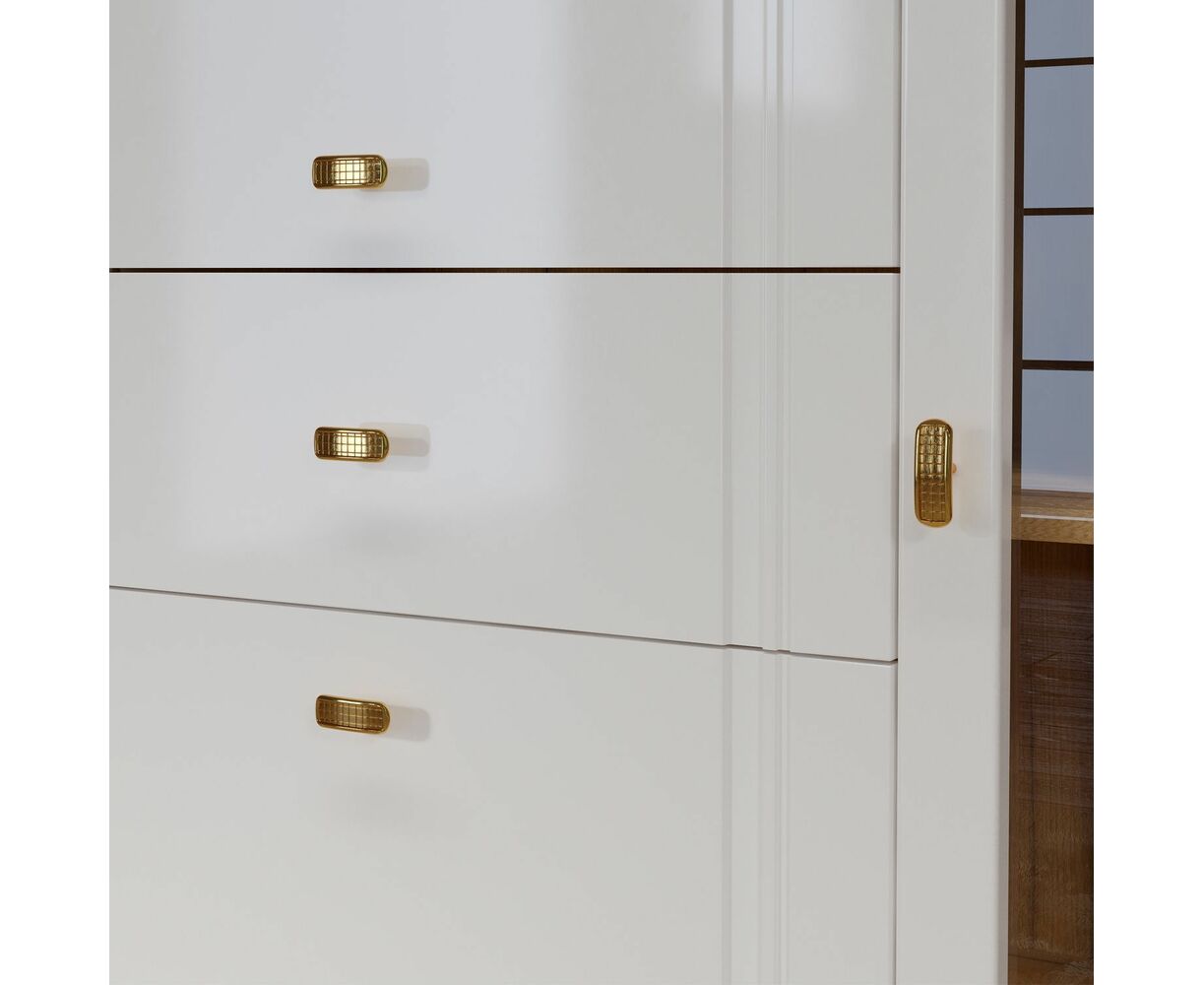Фасады выполнены из МДФ с пленке ПВХ и украшены фрезеровкой строгими линиями, а также лаконичной ручкой в цвете золото. Корпус изделия изготовлен из высококачественного ЛДСП класса эмиссии Е1.