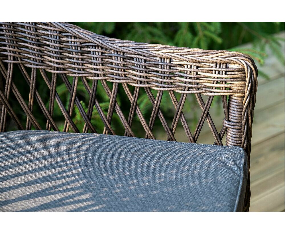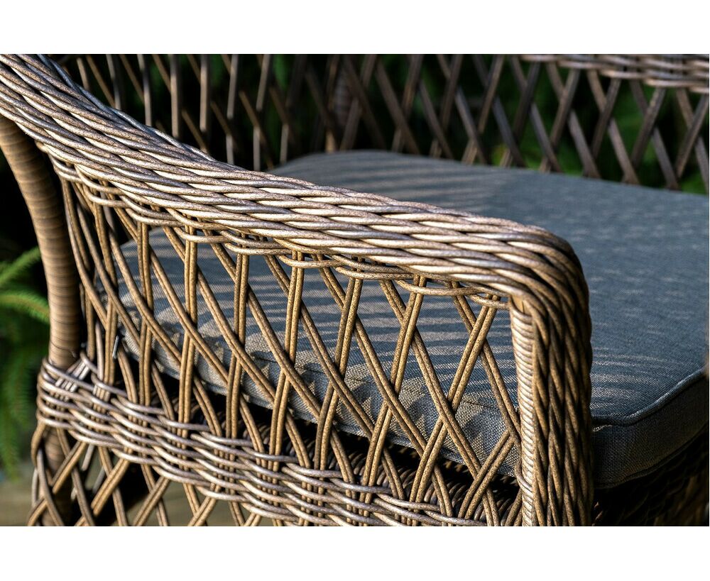 Мебель имеет надежный каркас из легкого алюминия. Изделия дополнительно оплетены ручным методом круглым искусственным ротангом натурального коричневого цвета.