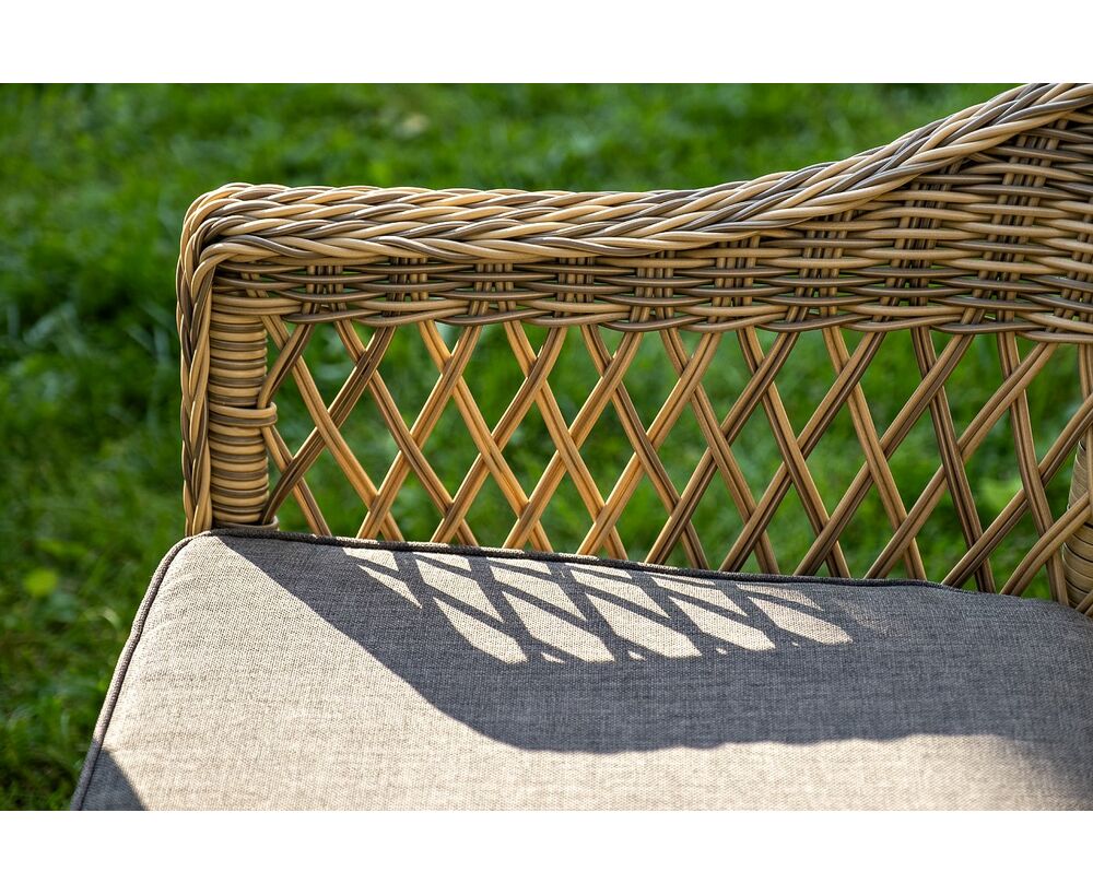 Мебель имеет надежный каркас из легкого алюминия. Изделия дополнительно оплетены ручным методом круглым искусственным ротангом натурального цвета соломы.