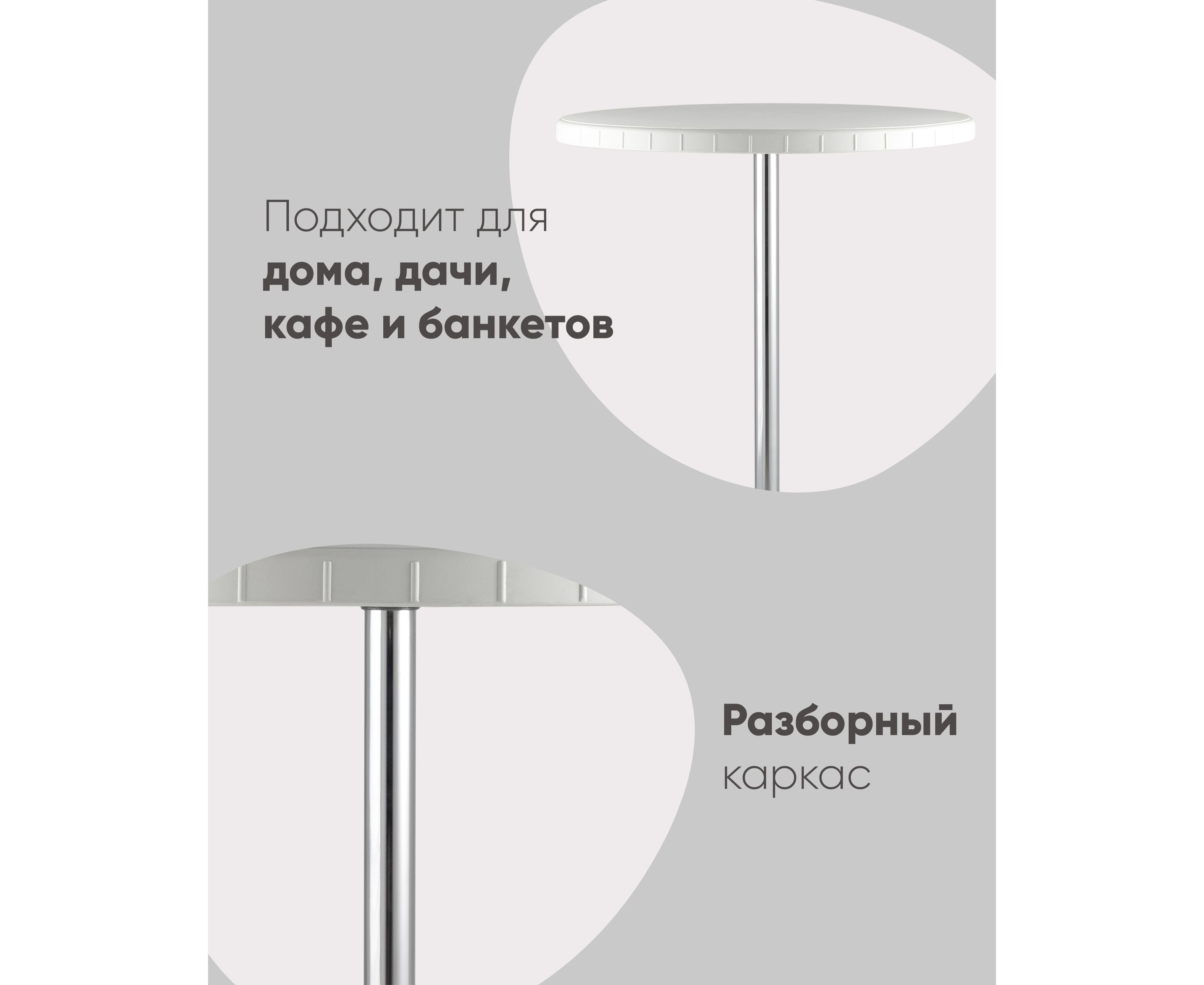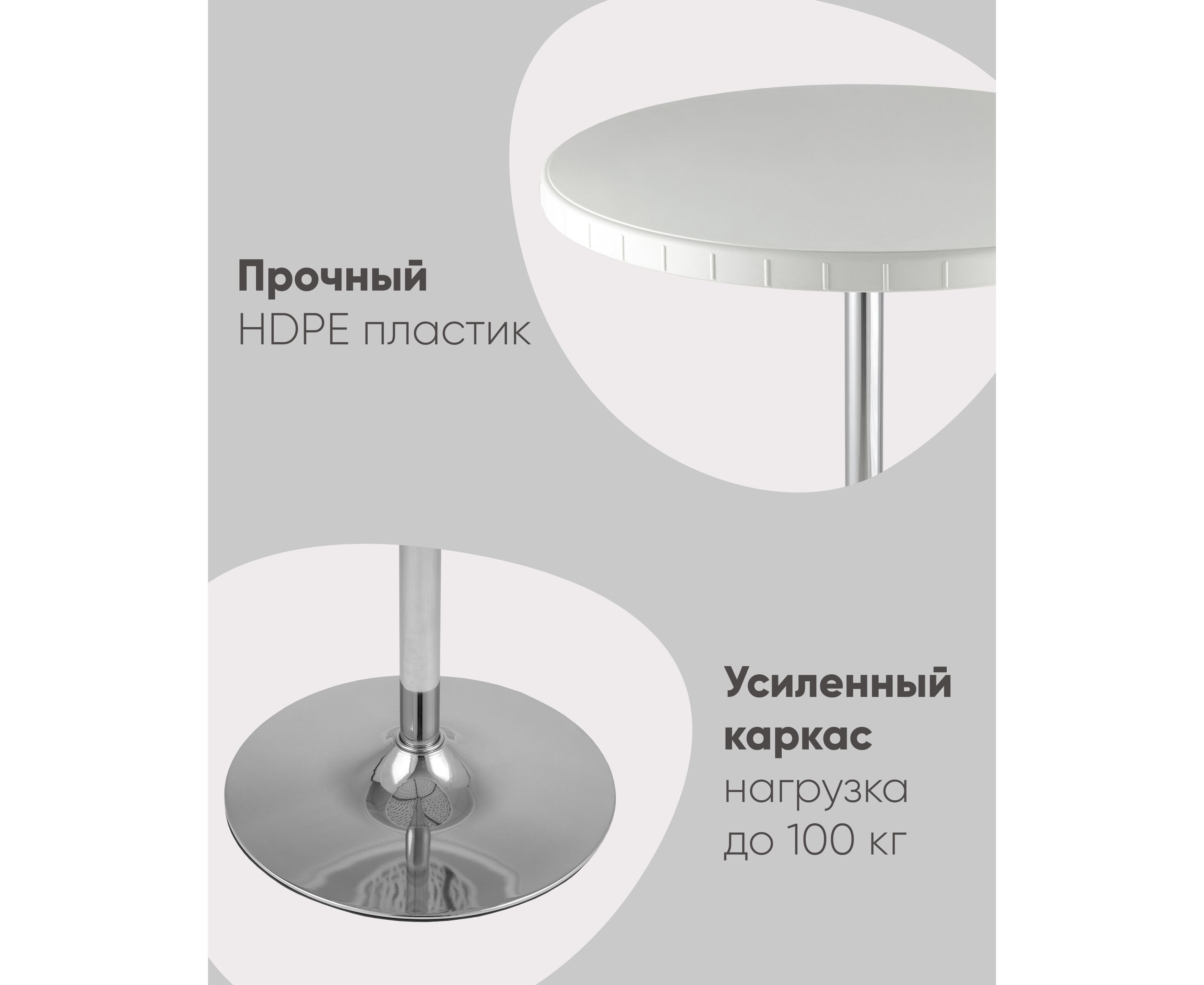 Стол барный круглый, 80*110 см. Для каркаса используется стальная труба особой прочности 25*1 мм, а столешница, толщиной 4,5 см, выполнена из 100% не переработанного полиэтилена HDPE (полиэтилен высокой плотности). Считается одним из более безопасных видов пластика. HDPE пластик выдерживает высокие нагрузки, не трескается при ударной нагрузке, эластичен в диапазоне температур от –70 до +100 °С.