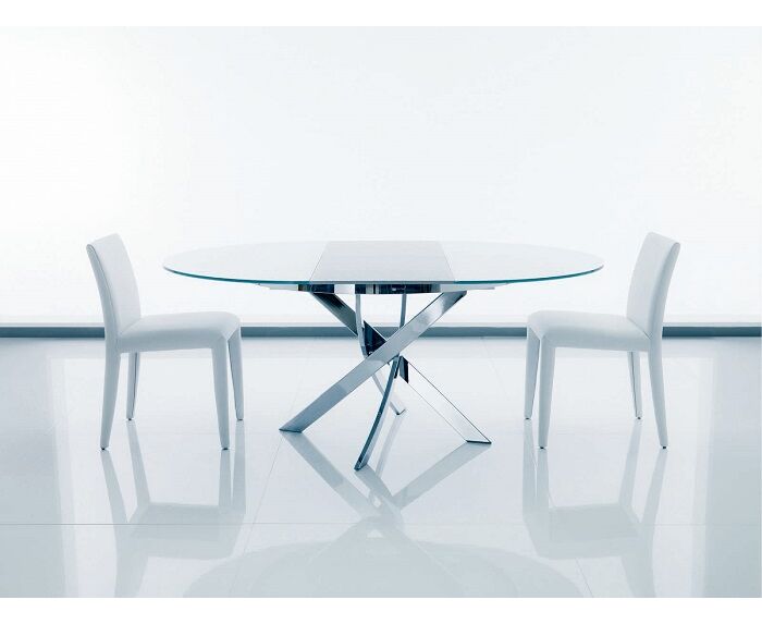 Стол круглый или овальный, раскладной или нераскладной, со структурой из стали. столешница из лакированного дерева и стекла, устойчивого к царапинам.