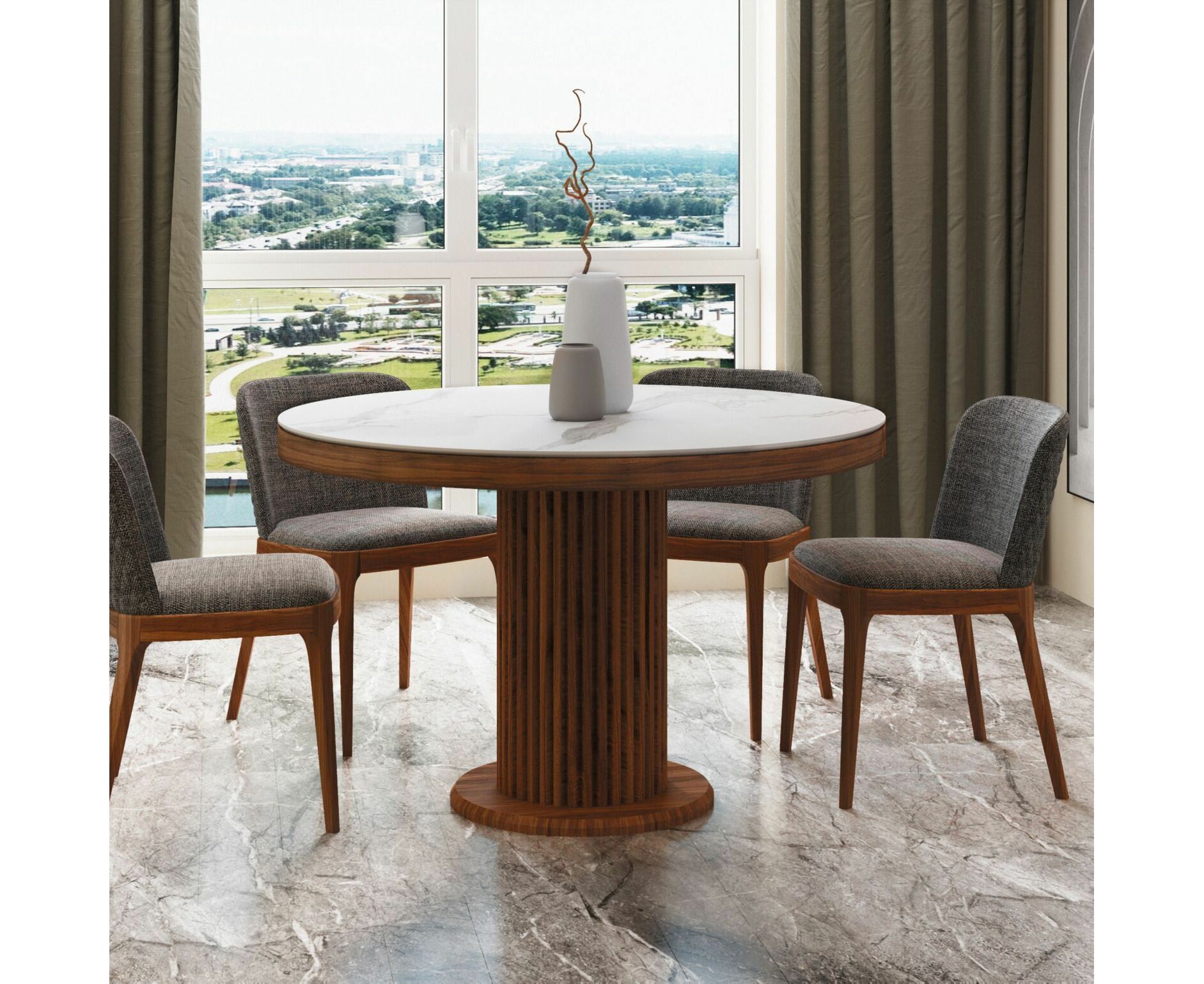 Стол Denver оснащен круглой нераскладывающейся столешницей, выполненной из матовой керамики толщиной 6 мм, что обеспечивает прочность и устойчивость к царапинам и пятнам.