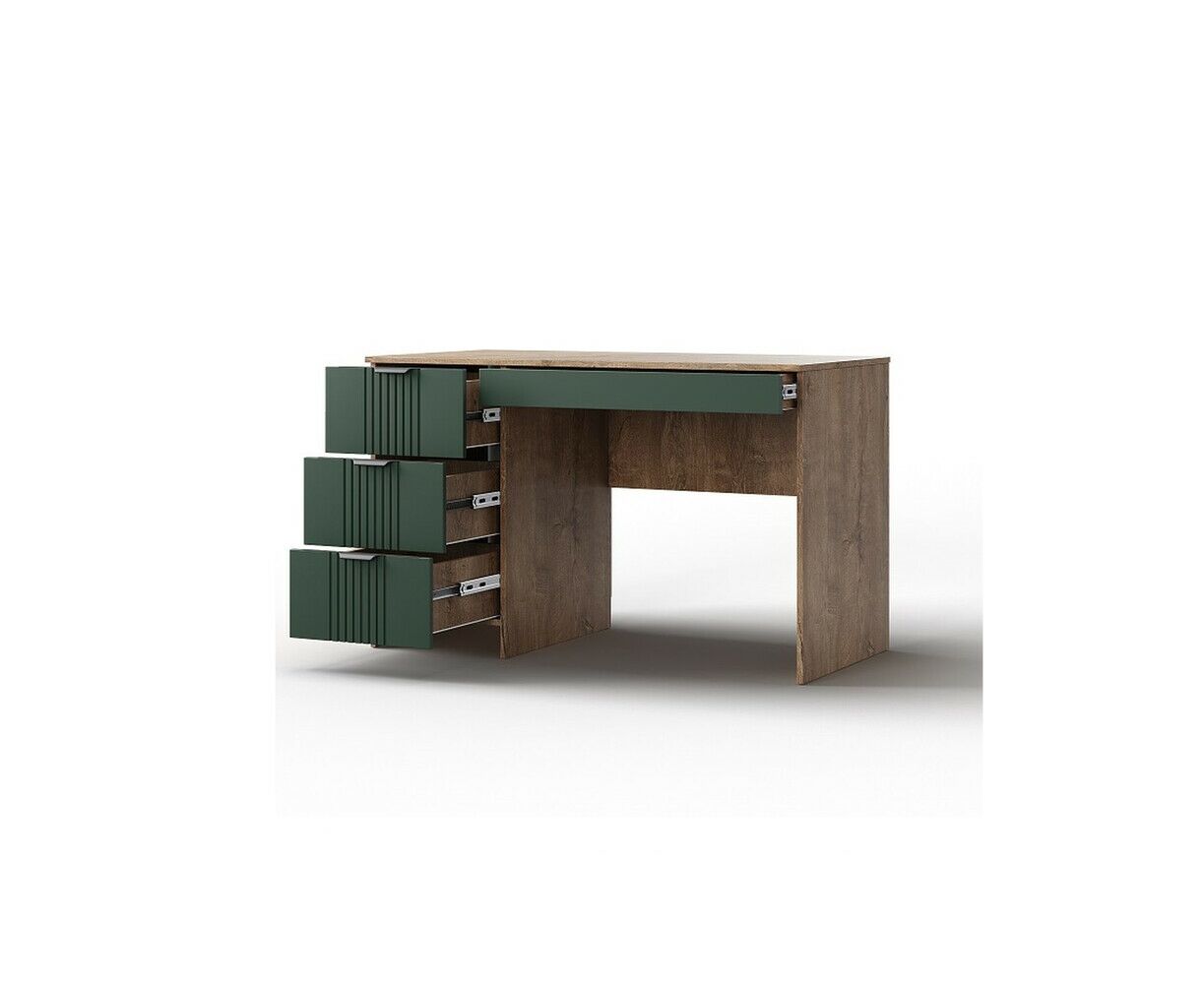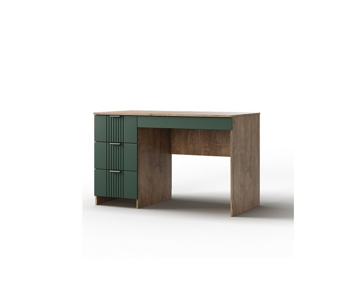 Стол письменный, в спальню «Герта» КМК 0979.30, каркас изготовлен из ЛДСП цвета дуб канзас, фасад из МДФ цвета зеленый матовый. Стол с наружными выдвижным ящикам, установленный на направляющие скрытого монтажа и распашной дверью. За дверью расположены две съемные полки.