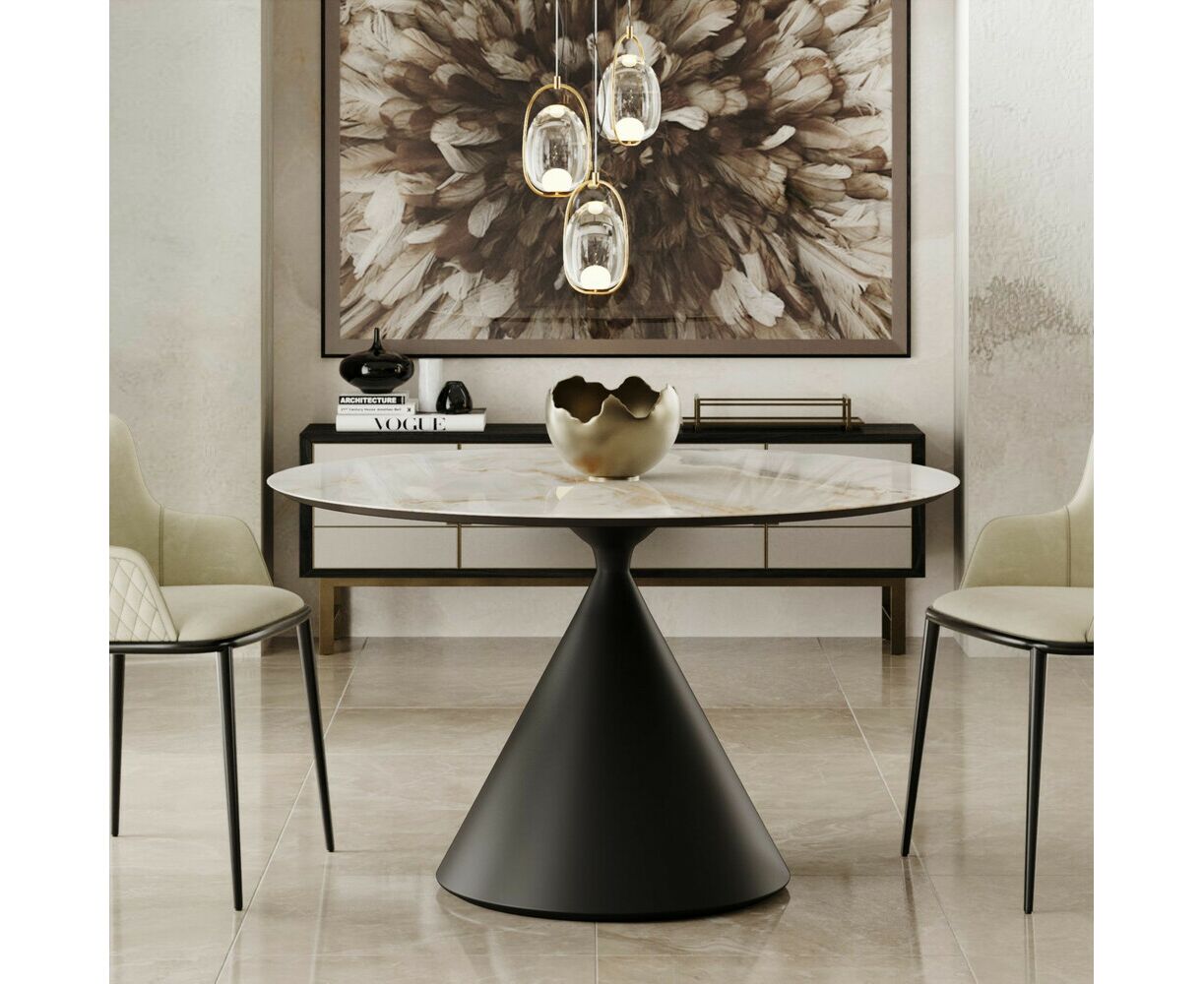 Стол с круглой столешницей AXIS не раскладывающийся, МДФ 40 мм с керамикой 6 мм. Опора стола выполнена в форме конуса и изготовлена из прочного металла. Цвет опоры - черный, что придает столу современный и стильный вид. Черный цвет добавляет элегантности и характера столу, при этом легко сочетается с различными интерьерными стилями.