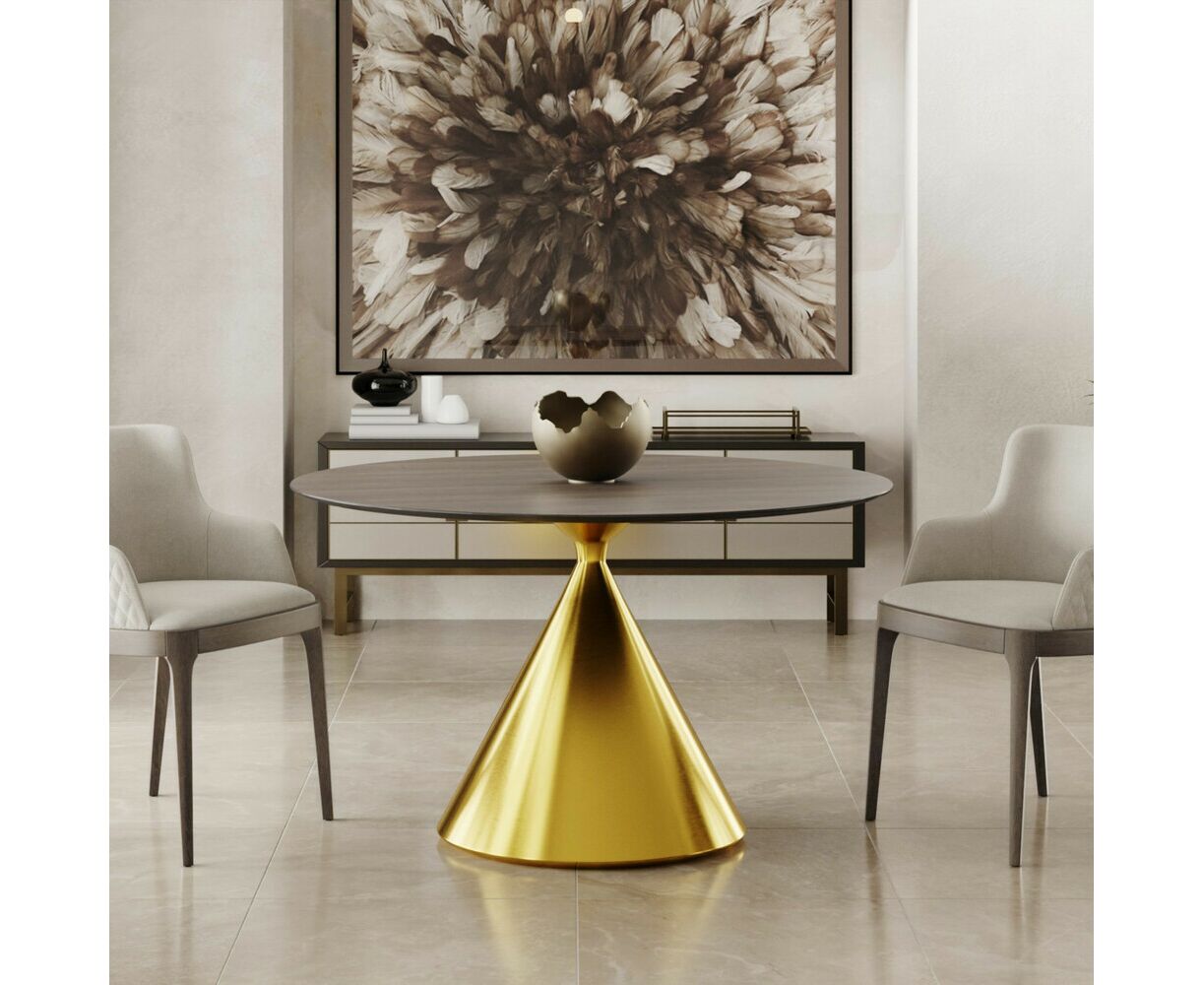 Стол с круглой столешницей AXIS не раскладывающийся, МДФ 24 мм с натуральным шпоном 1 мм. Опора стола выполнена в форме конуса и изготовлена из прочного металла. Цвет опоры - золото, что придает столу современный и стильный вид.