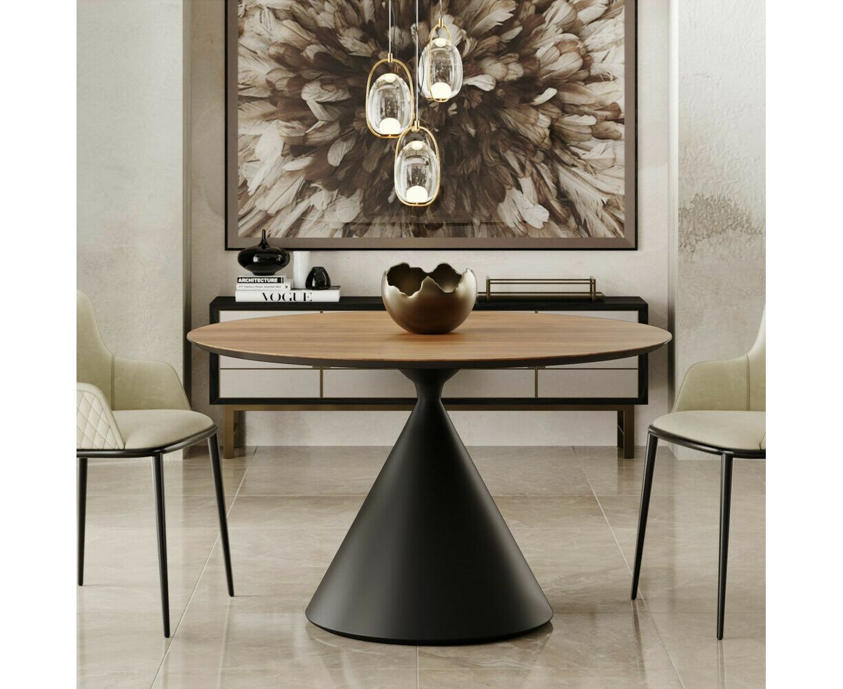 Стол с круглой столешницей AXIS не раскладывающийся, МДФ 24 мм с натуральным шпоном 1 мм. Опора стола выполнена в форме конуса и изготовлена из прочного металла. Цвет опоры - черный, что придает столу современный и стильный вид. Черный цвет добавляет элегантности и характера столу, при этом легко сочетается с различными интерьерными стилями.
