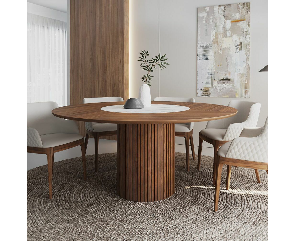 Стол Denver оснащен круглой нераскладывающейся столешницей, выполненной из шпона с круглой вставкой из матовой керамики.