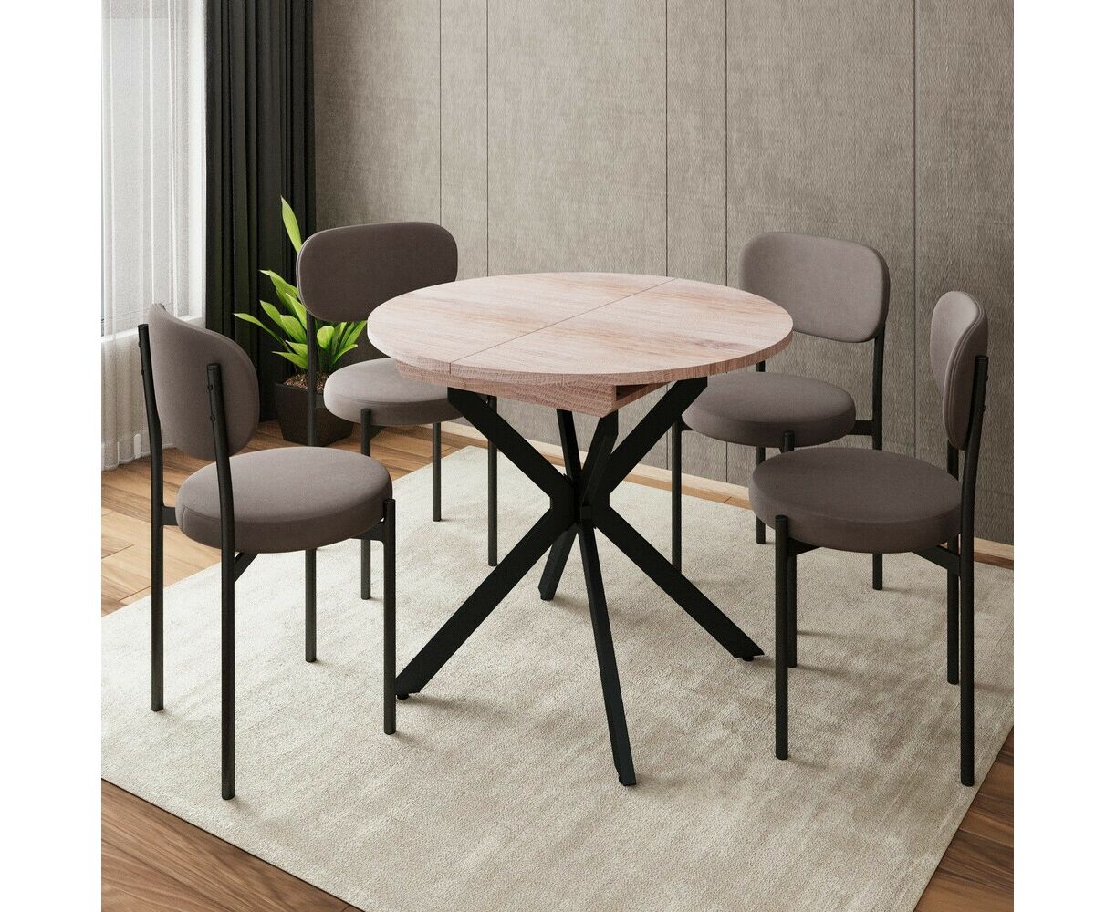 Раздвижной обеденный стол Твист разработан для малогабаритных кухонь и квартир-студий: в сложенном виде компактный и не занимает пространство, при необходимости легко раскладывается для гостей. Особая форма опоры позволяет беспрепятственно задвигать стулья под стол, делая посадку удобной. Модель выглядит актуально благодаря чистым линиям, спокойной текстуре столешницы «под дерево» и выразительной Х-образной опоре, которая и дала название линейке.