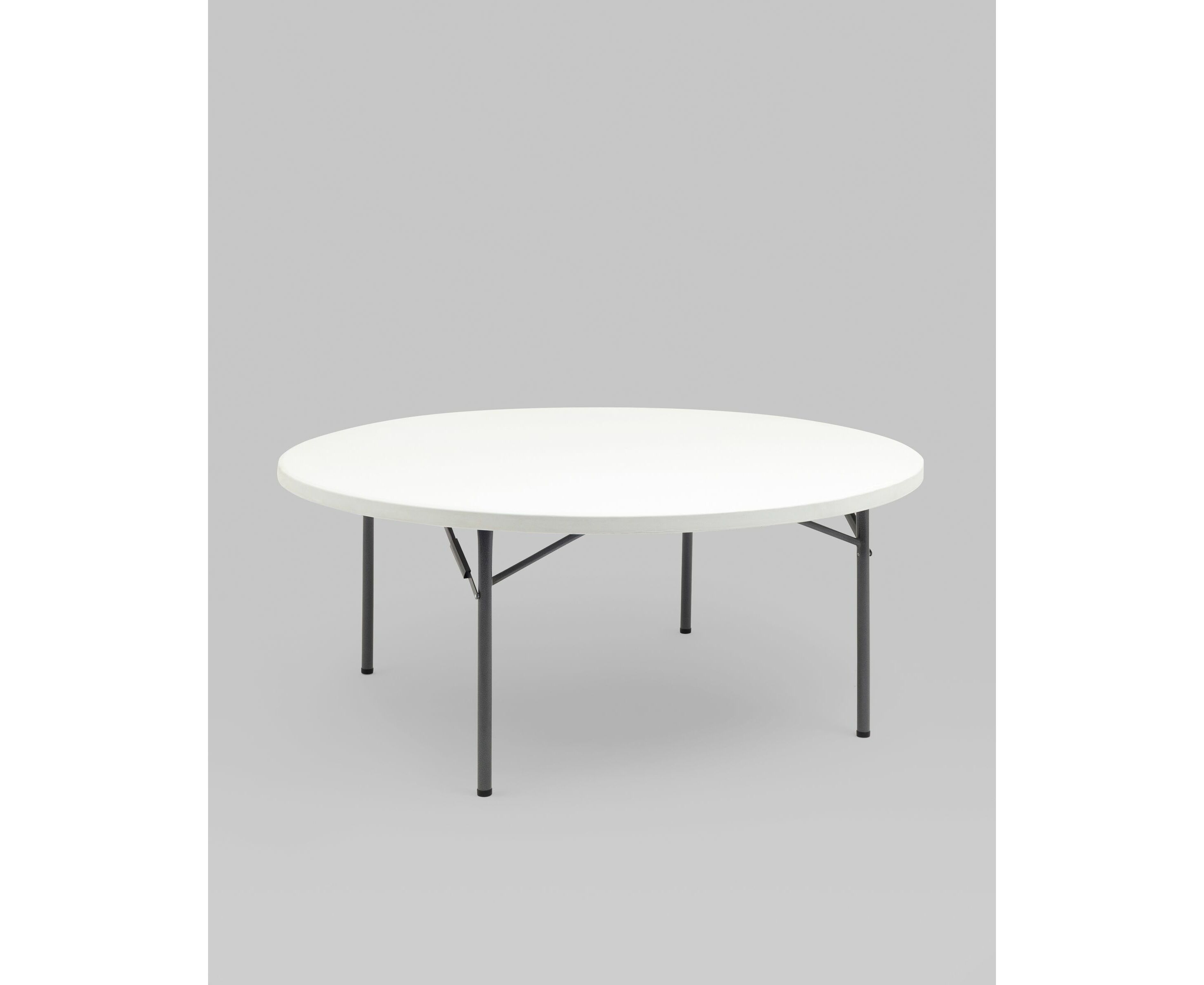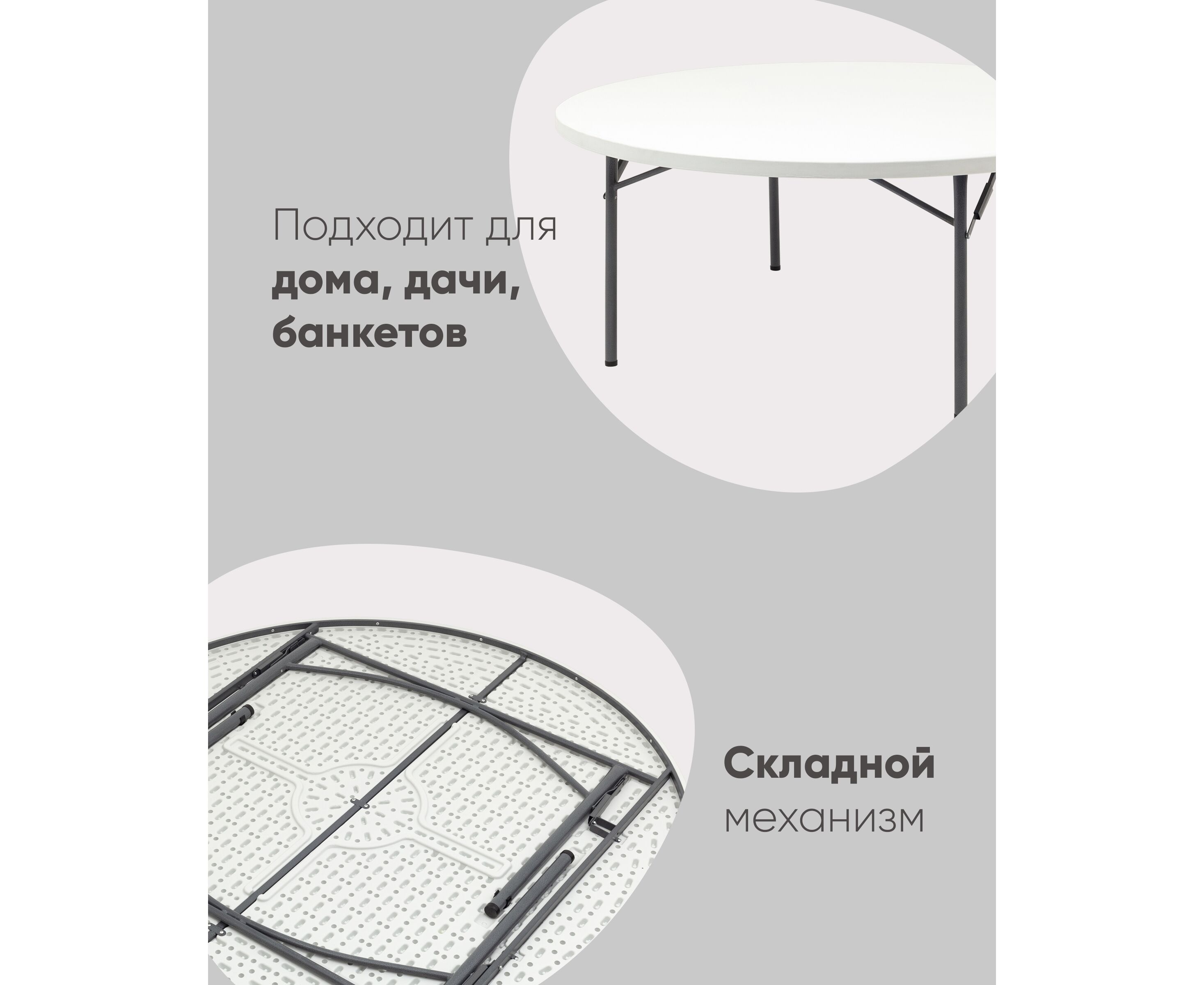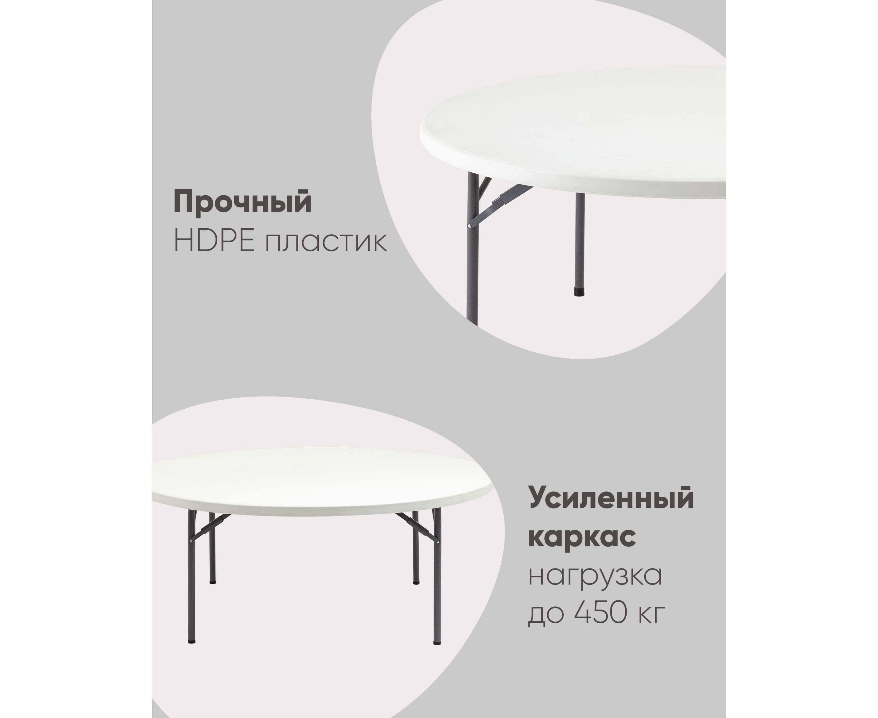 Стол круглый, 180*74 см. Для каркаса используется стальная труба особой прочности 32*1 мм, а столешница, толщиной 5 см, выполнена из 100% не переработанного полиэтилена HDPE (полиэтилен высокой плотности). Считается одним из более безопасных видов пластика. HDPE пластик выдерживает высокие нагрузки, не трескается при ударной нагрузке, эластичен в диапазоне температур от –70 до +100 °С.