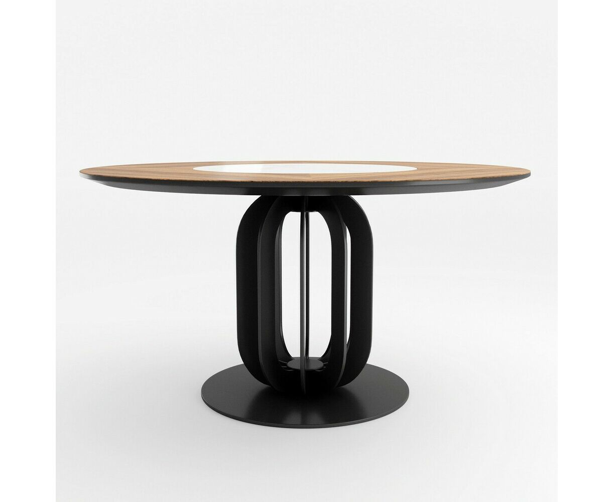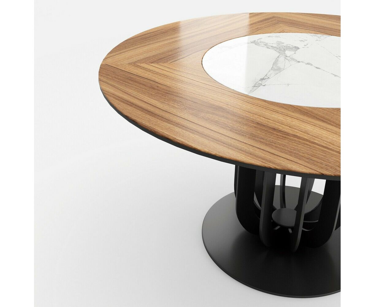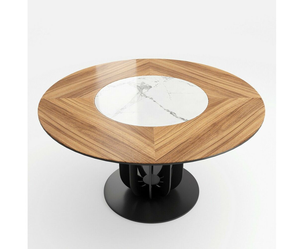 Нераскладывающаяся столешница — изготовлена из МДФ толщиной 40 мм с натуральным шпоном 1 мм и вставкой по центру из матовой или глянцевой керамики 6 мм с диаметром круга 80 см, Круглая форма стола делает его подходящим для повседневного использования и обслуживания гостей. Сохо — стильный и практичный выбор для современных интерьеров.