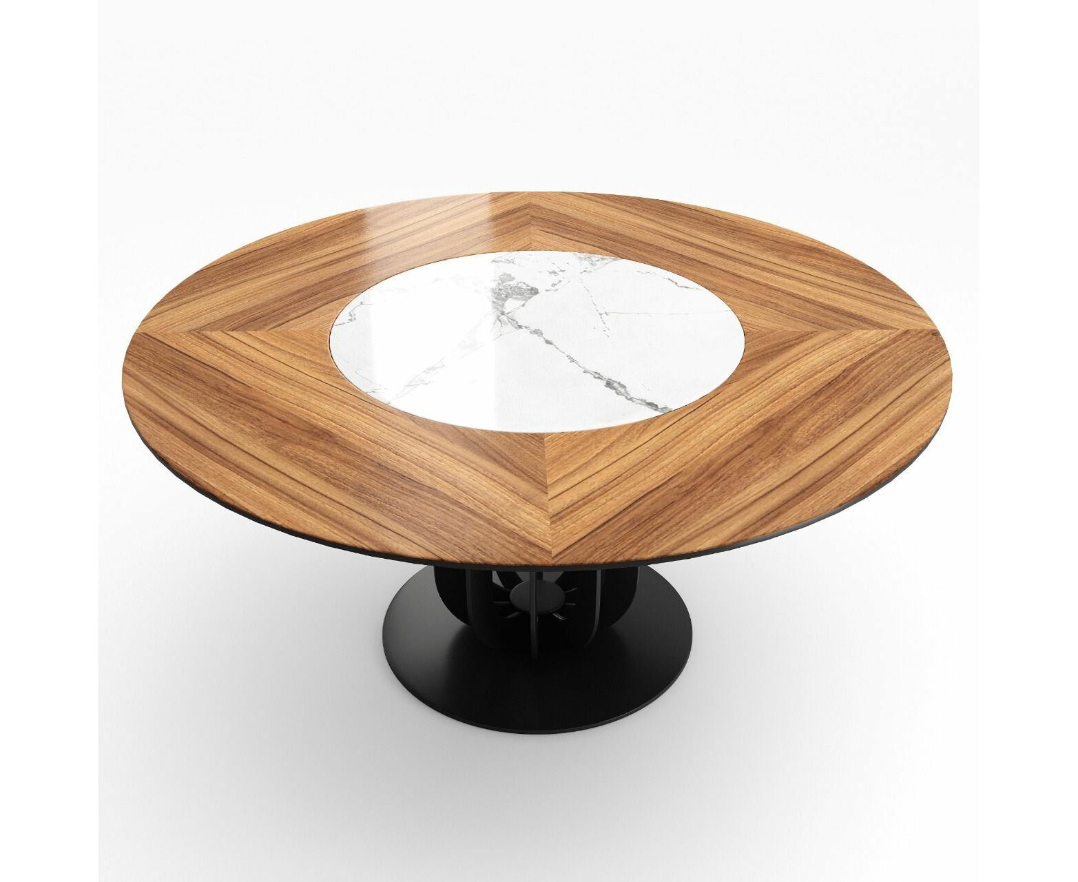 Круглый стол «Сохо» с опорой из металла черного цвета выглядит современным и стильным. Комбинация шпона и керамики в столешнице добавляет привлекательный контраст и функциональность. Такой дизайн может подходить для различных интерьеров, включая современные, минималистичные, или индустриальные стили.