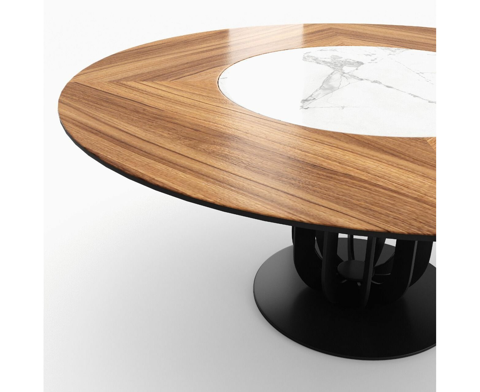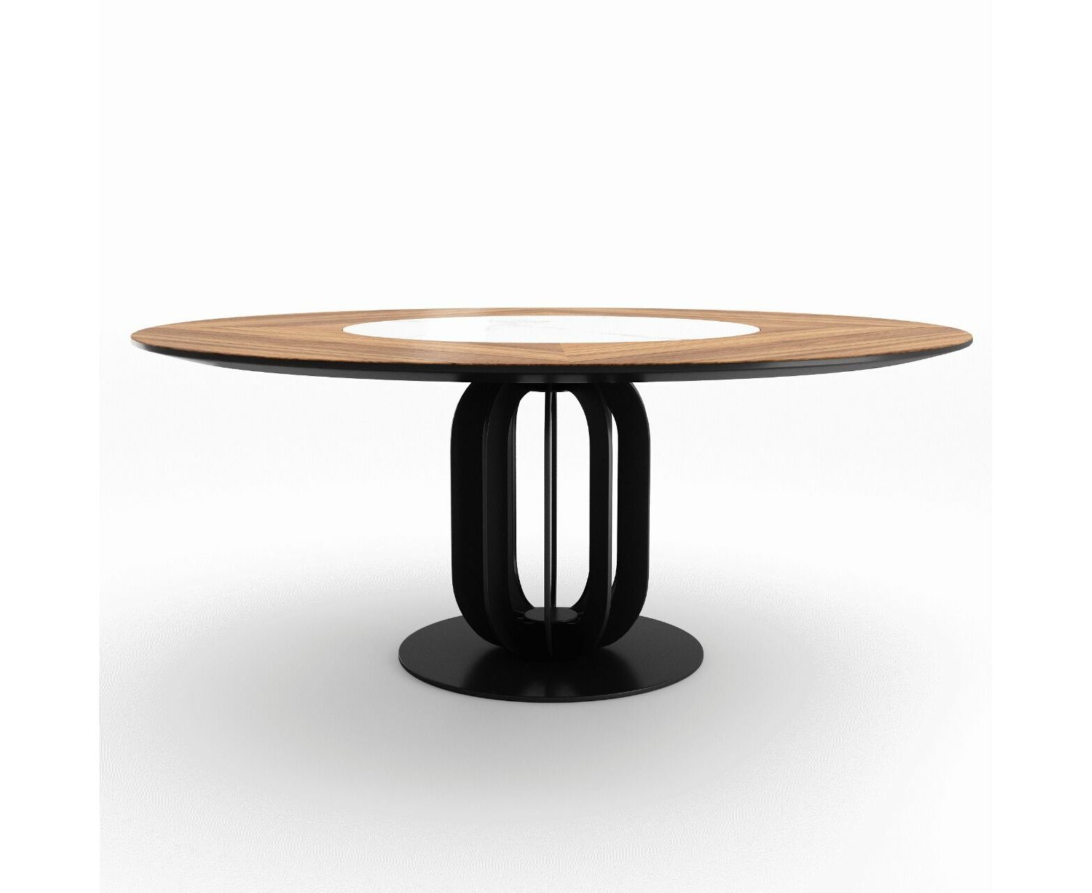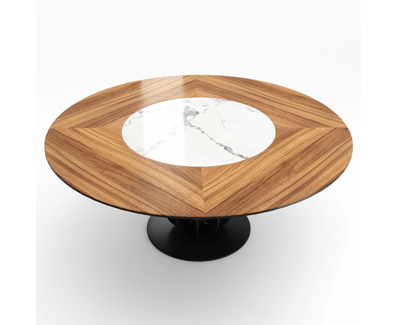 Нераскладывающаяся столешница — изготовлена из МДФ толщиной 40 мм с натуральным шпоном 1 мм и вставкой по центру из матовой или глянцевой керамики 6 мм с диаметром круга 80 см, Круглая форма стола делает его подходящим для повседневного использования и обслуживания гостей. Сохо — стильный и практичный выбор для современных интерьеров.