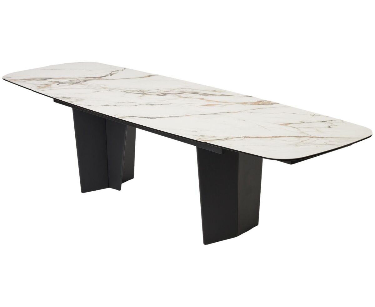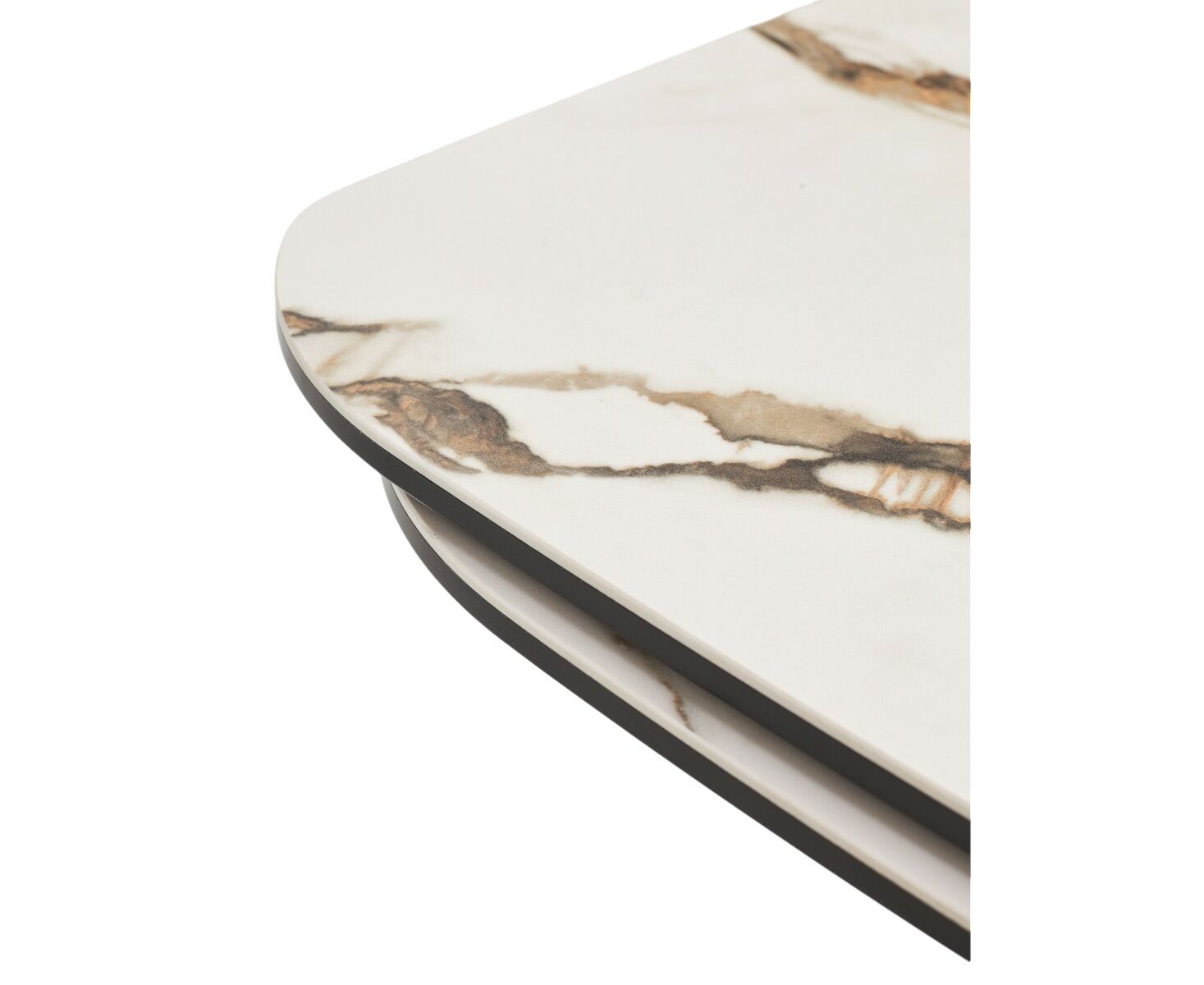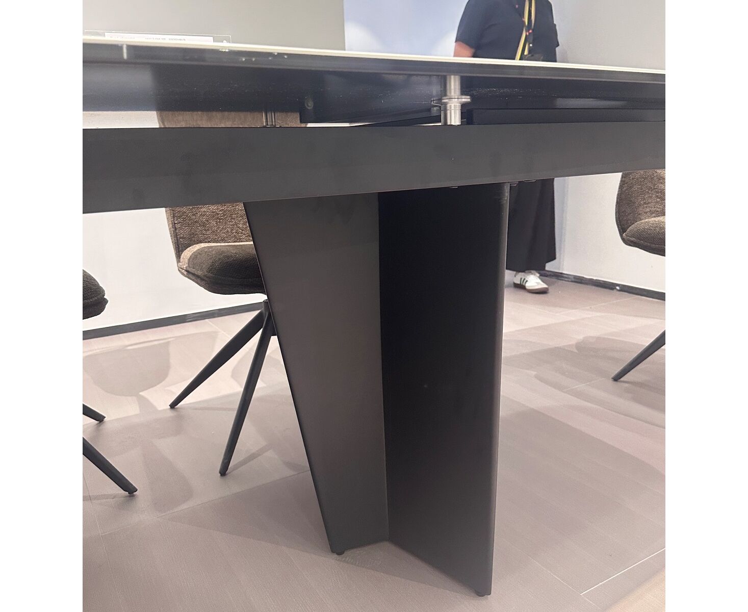 - двухсторонняя торцевая система раскладывания, две независимые вставки по краям по 50 см позволяют увеличить длину столешницы на 250 или 300 см при необходимости, испанская керамика, толщина столешницы 13 мм (3 мм керамика + 10 мм закаленное стекло), не впитывает загрязнения, термостойкая;