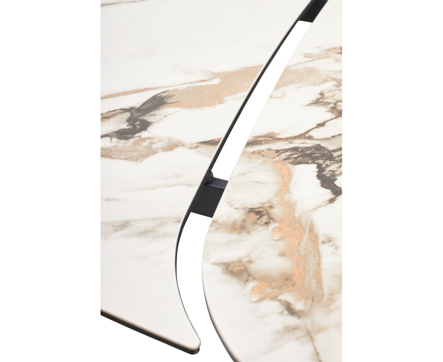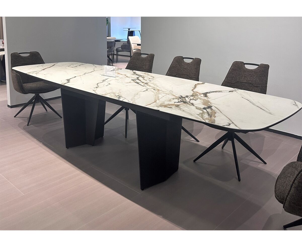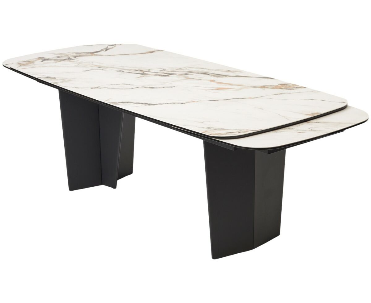 - двухсторонняя торцевая система раскладывания, две независимые вставки по краям по 50 см позволяют увеличить длину столешницы на 250 или 300 см при необходимости, испанская керамика, толщина столешницы 13 мм (3 мм керамика + 10 мм закаленное стекло), не впитывает загрязнения, термостойкая;