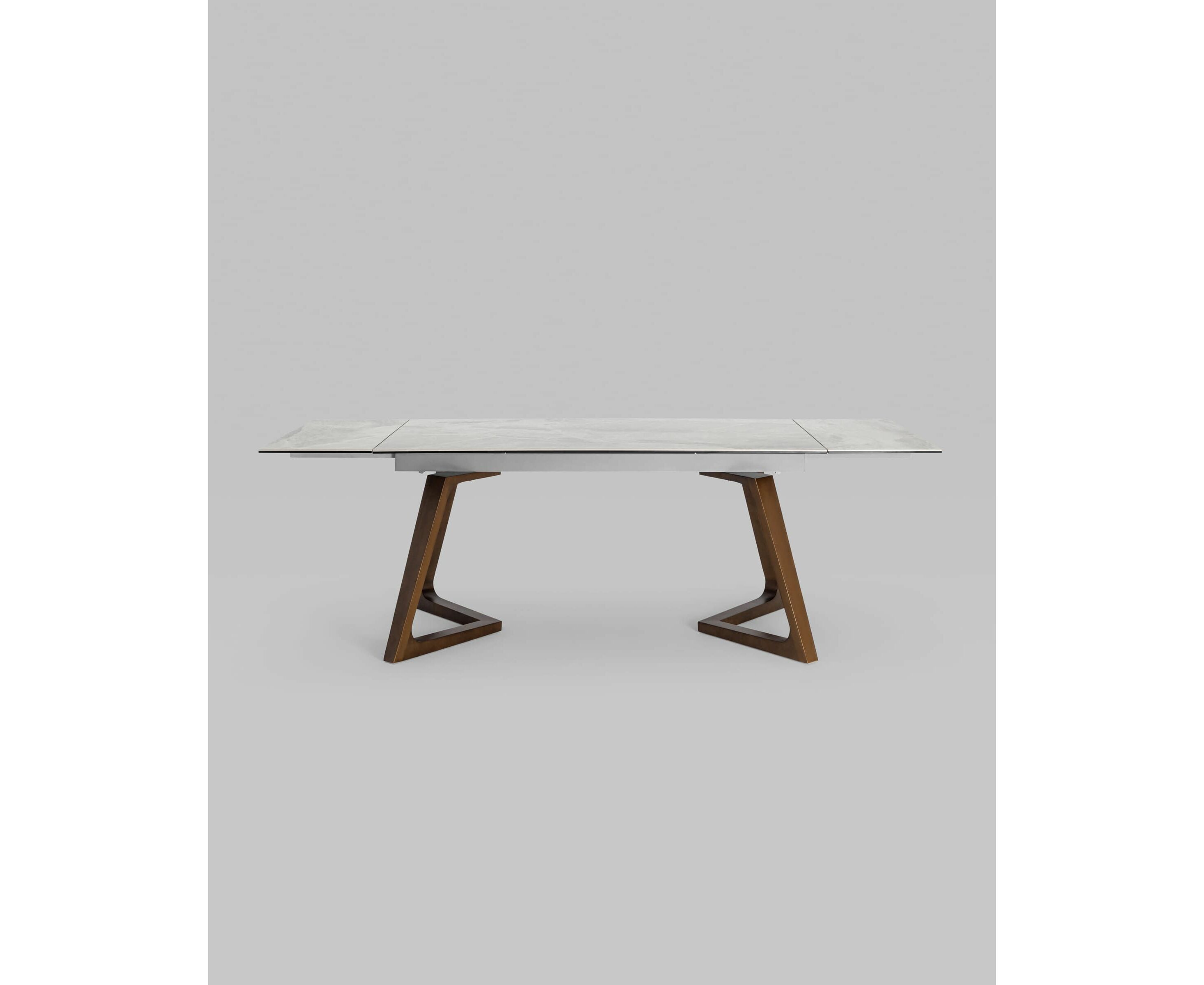 Столешница из керамики отличный вариант для кухни. Материал знаменит прочностью и долговечностью, поверхность устойчива к различным внешним воздействиям. Благодаря спрятанным по бокам элементам можно увеличить полезную площадь стола дополнительно на 40 или 80 см. Ножки выполнены из массива дерева в оригинальной форме, которые надежно удерживают всю конструкцию. Обеденный стол Артизан станет практичным украшением любой кухни или обеденной зоны.