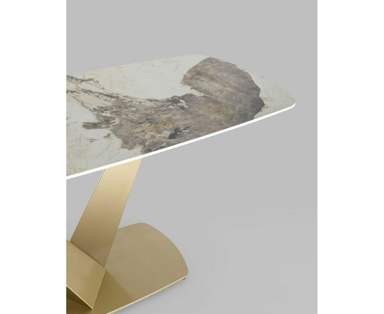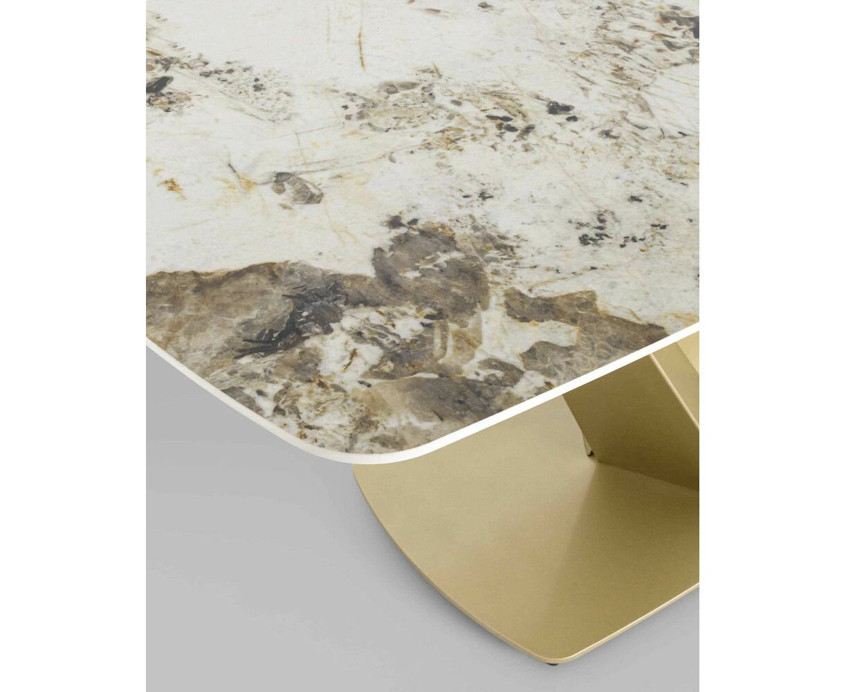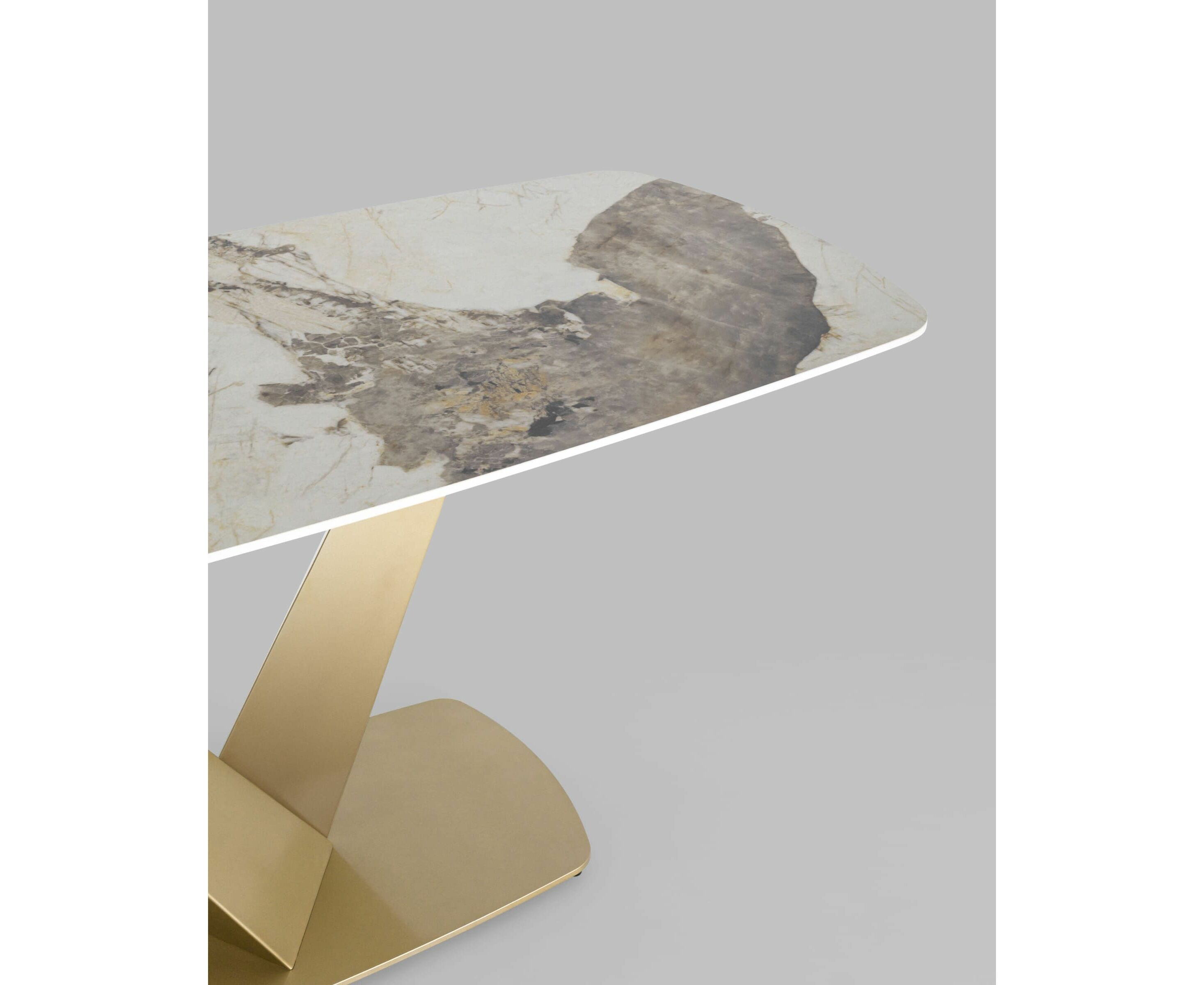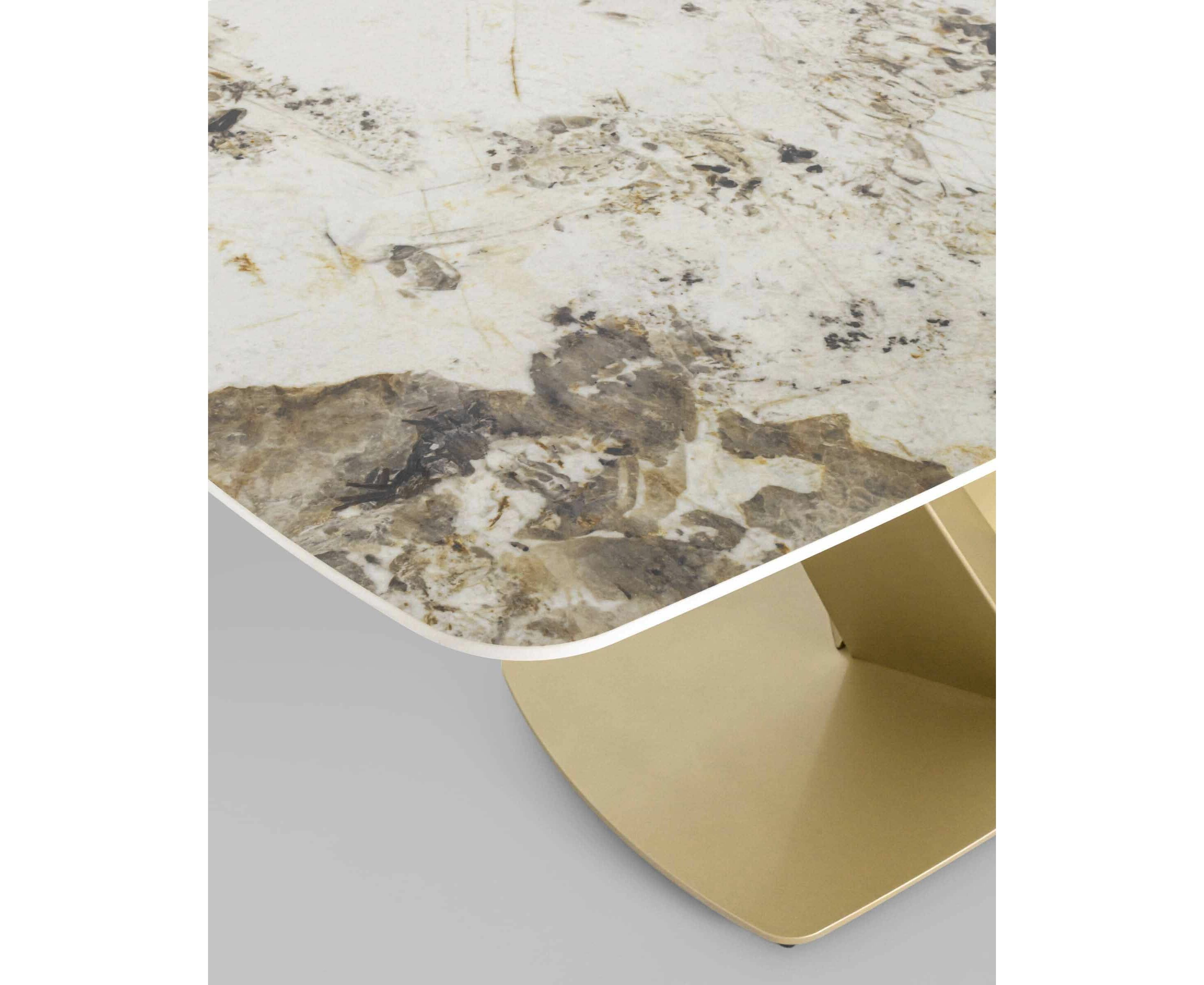 Столешница сочетает в себе прочную керамику, покрытую слоем закалённого стекла для практичности и стиля. Материалы устойчивы к перепадам температуры, к чрезмерной влаге, любые загрязнения легко устранить. Поверхность повторяет рисунок изысканного мрамора, излучая комфорт и спокойствие. Металлический каркас золотого матового цвета из двух объёмных балок образуют простую и надежную конструкцию. Роскошное сочетание цветов позволяет подобрать к столу любые комплекты стульев в современном стиле.