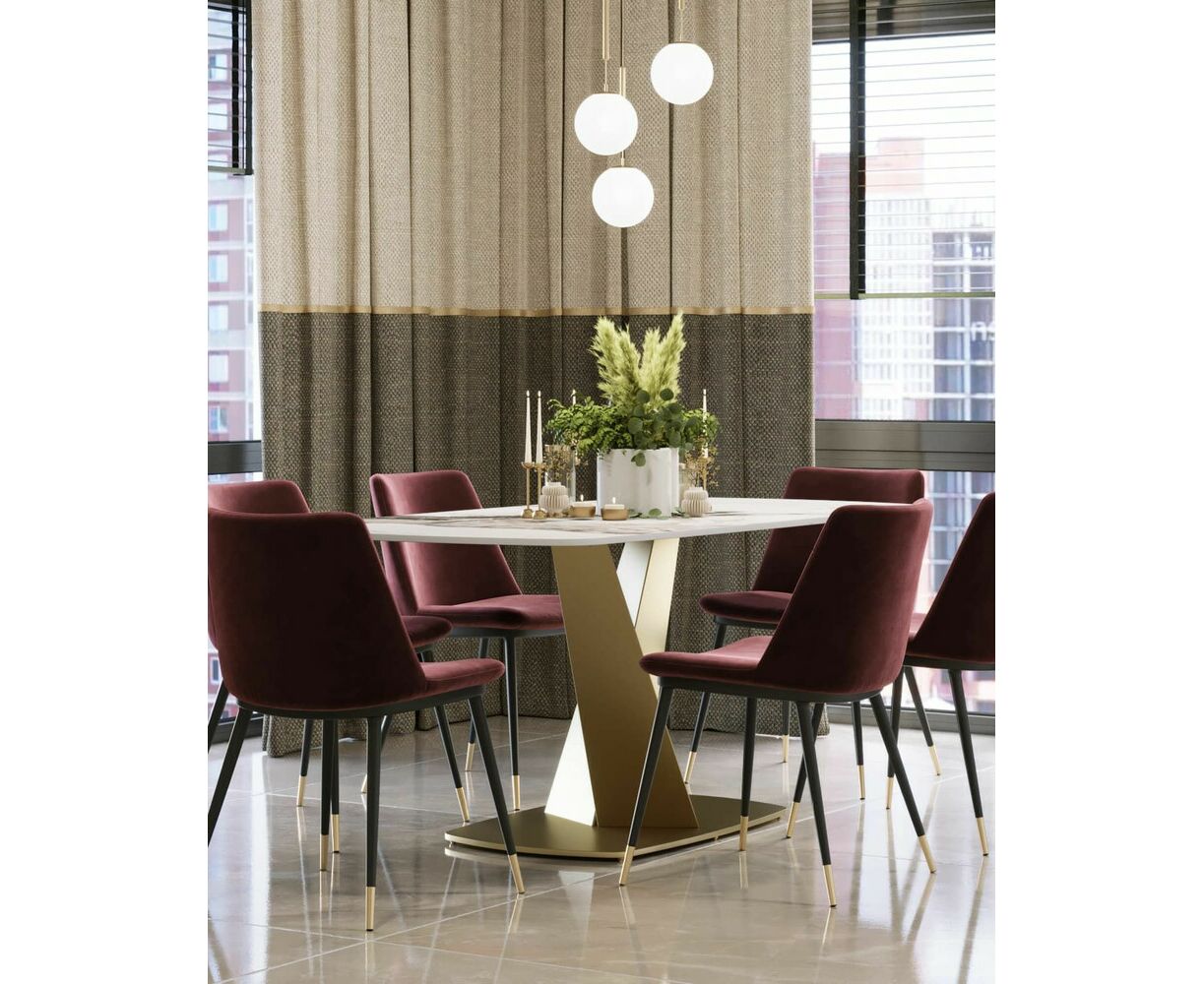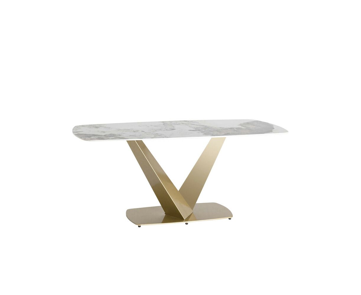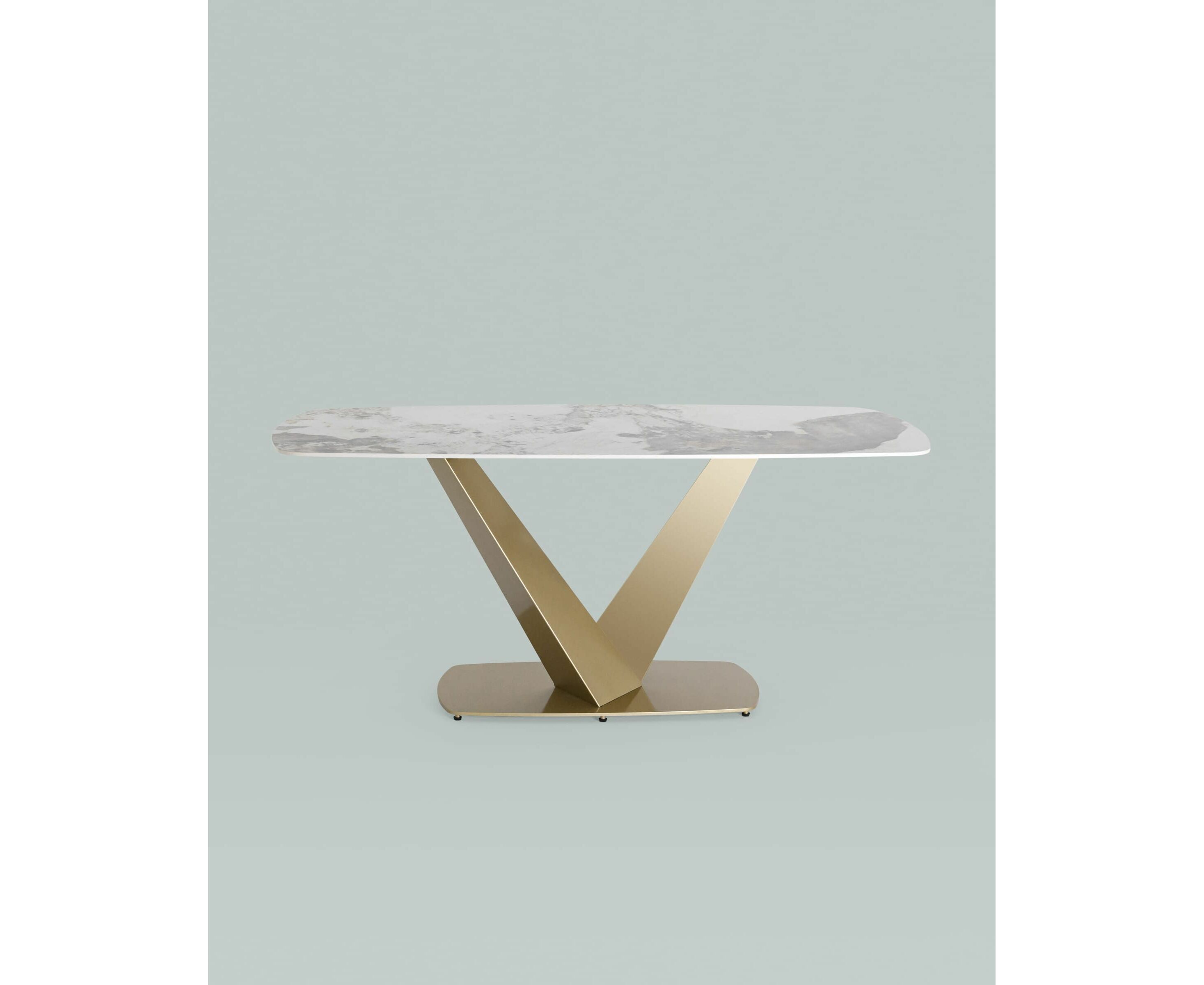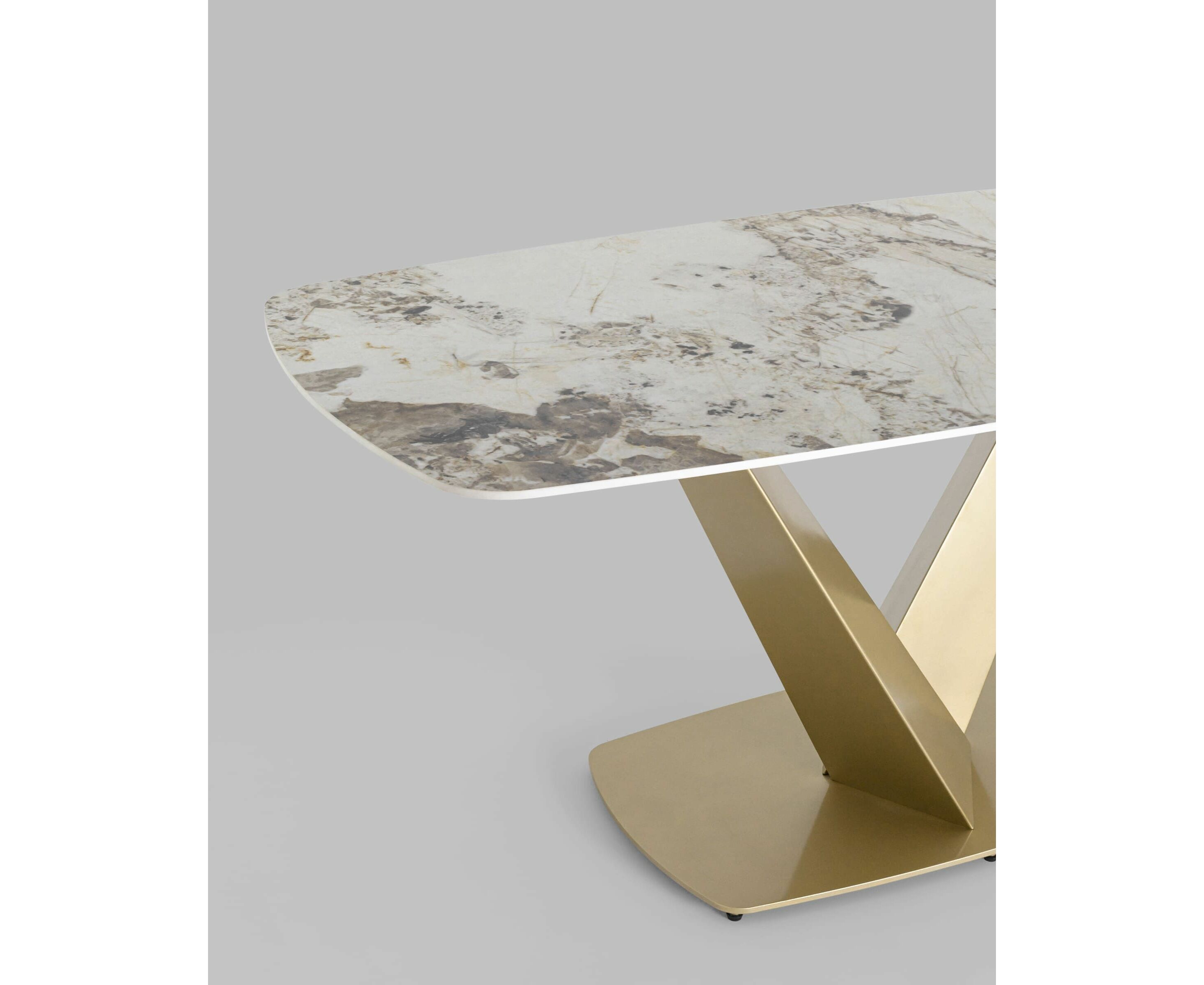 Столешница сочетает в себе прочную керамику, покрытую слоем закалённого стекла для практичности и стиля. Материалы устойчивы к перепадам температуры, к чрезмерной влаге, любые загрязнения легко устранить. Поверхность повторяет рисунок изысканного мрамора, излучая комфорт и спокойствие. Металлический каркас золотого матового цвета из двух объёмных балок образуют простую и надежную конструкцию. Роскошное сочетание цветов позволяет подобрать к столу любые комплекты стульев в современном стиле.