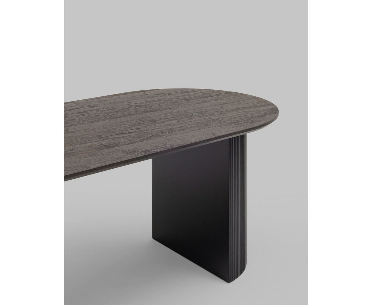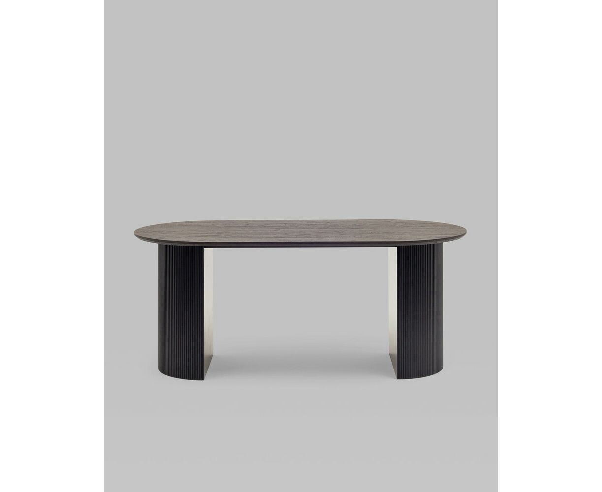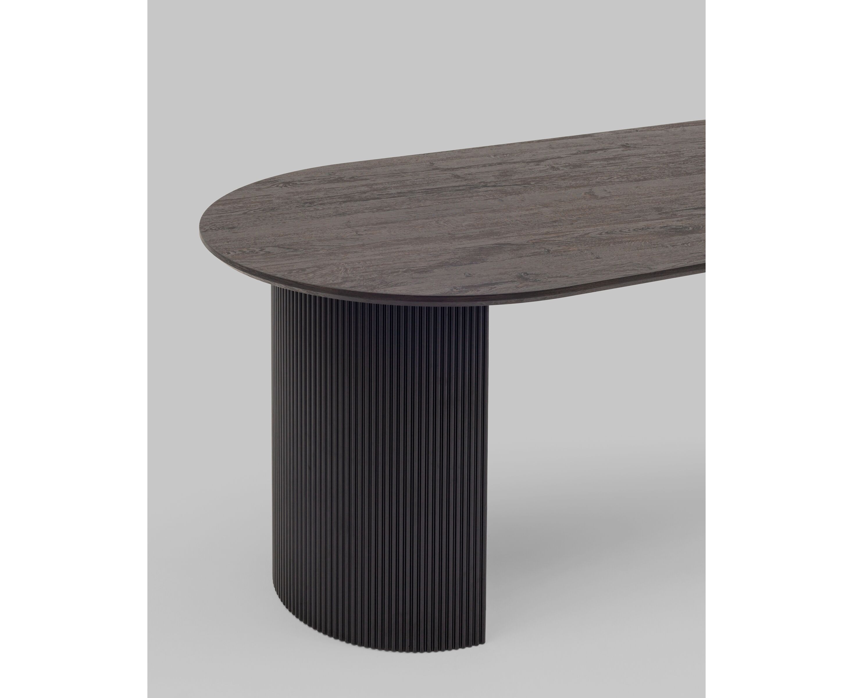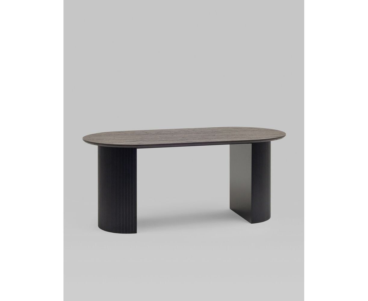 Столешница выполнена из прочного и долговечного МДФ. Темная поверхность столешницы гармонично сочетается с массивными ножками черного цвета. Простая овальная форма стола позволит легко вписать его в современный интерьер, стол украсит кухню, гостиную или современное кафе, ресторан. Опорные плиссированные ножки в лаконичном дизайне надёжно удерживают всю конструкцию и дополняют монолитный образ.