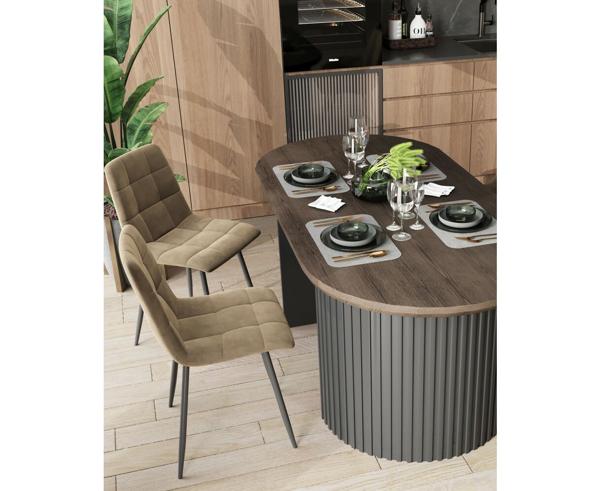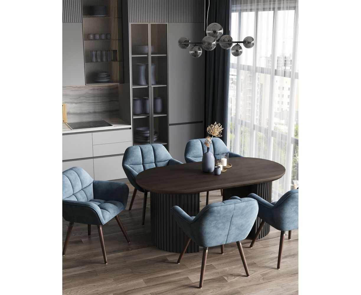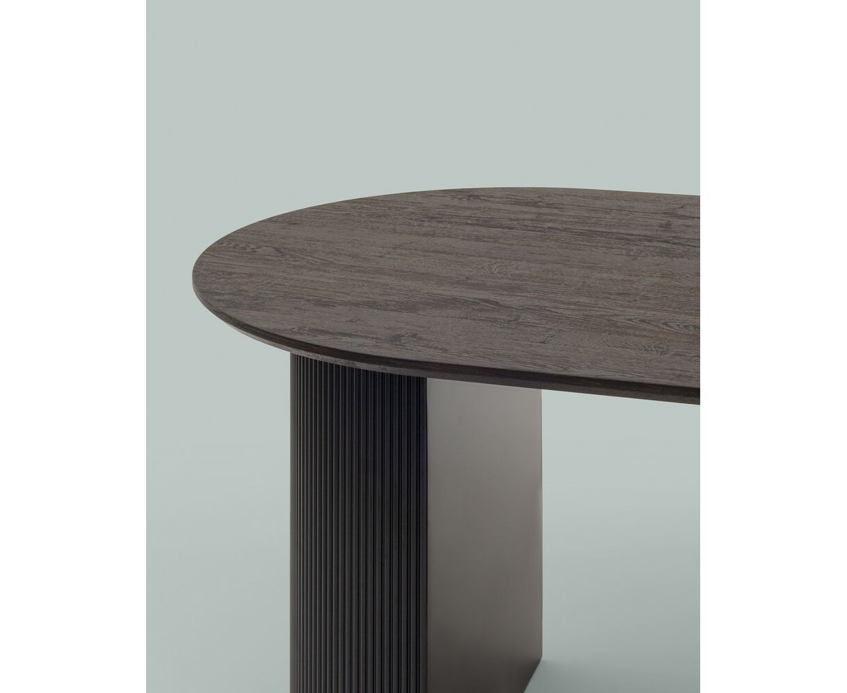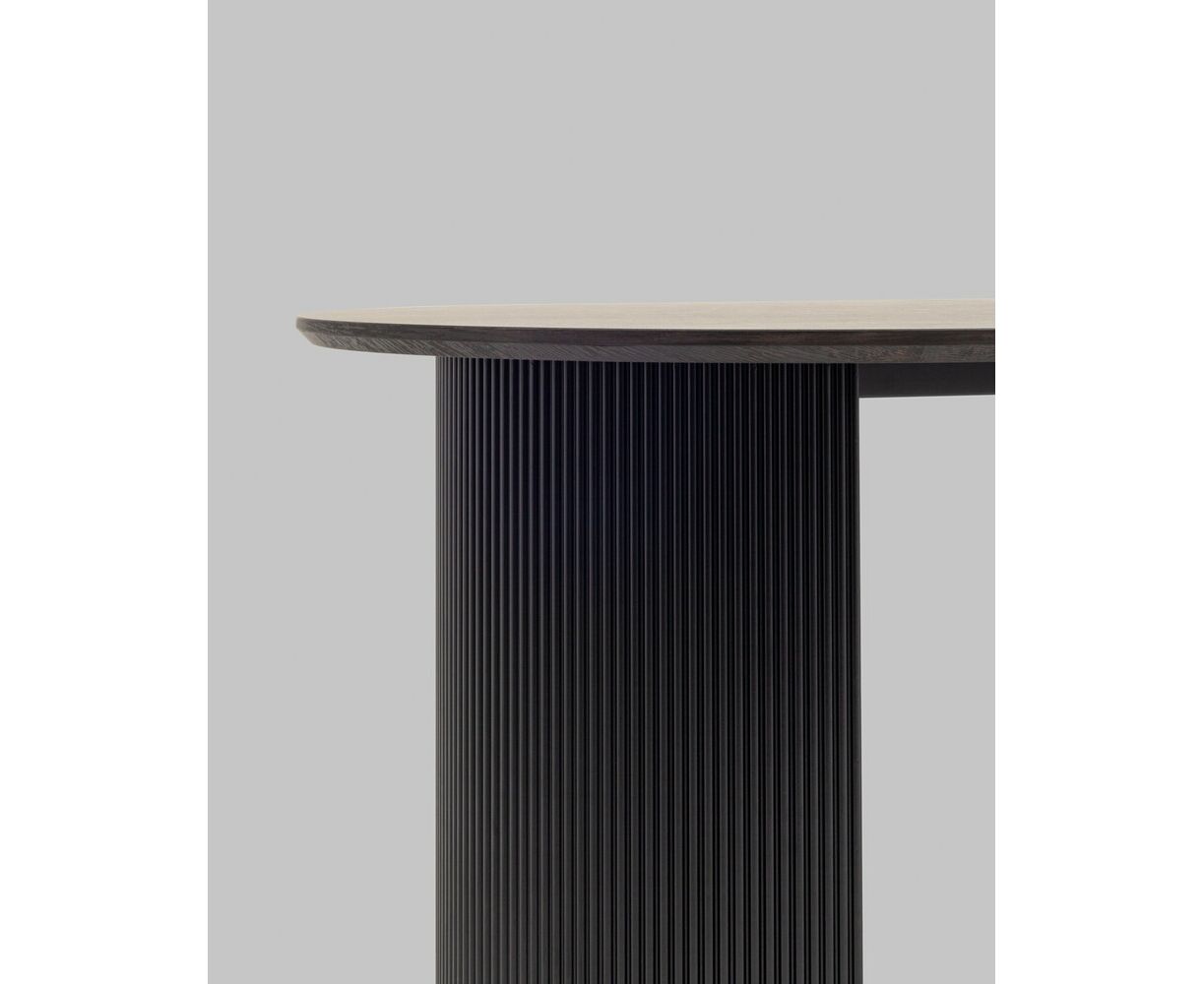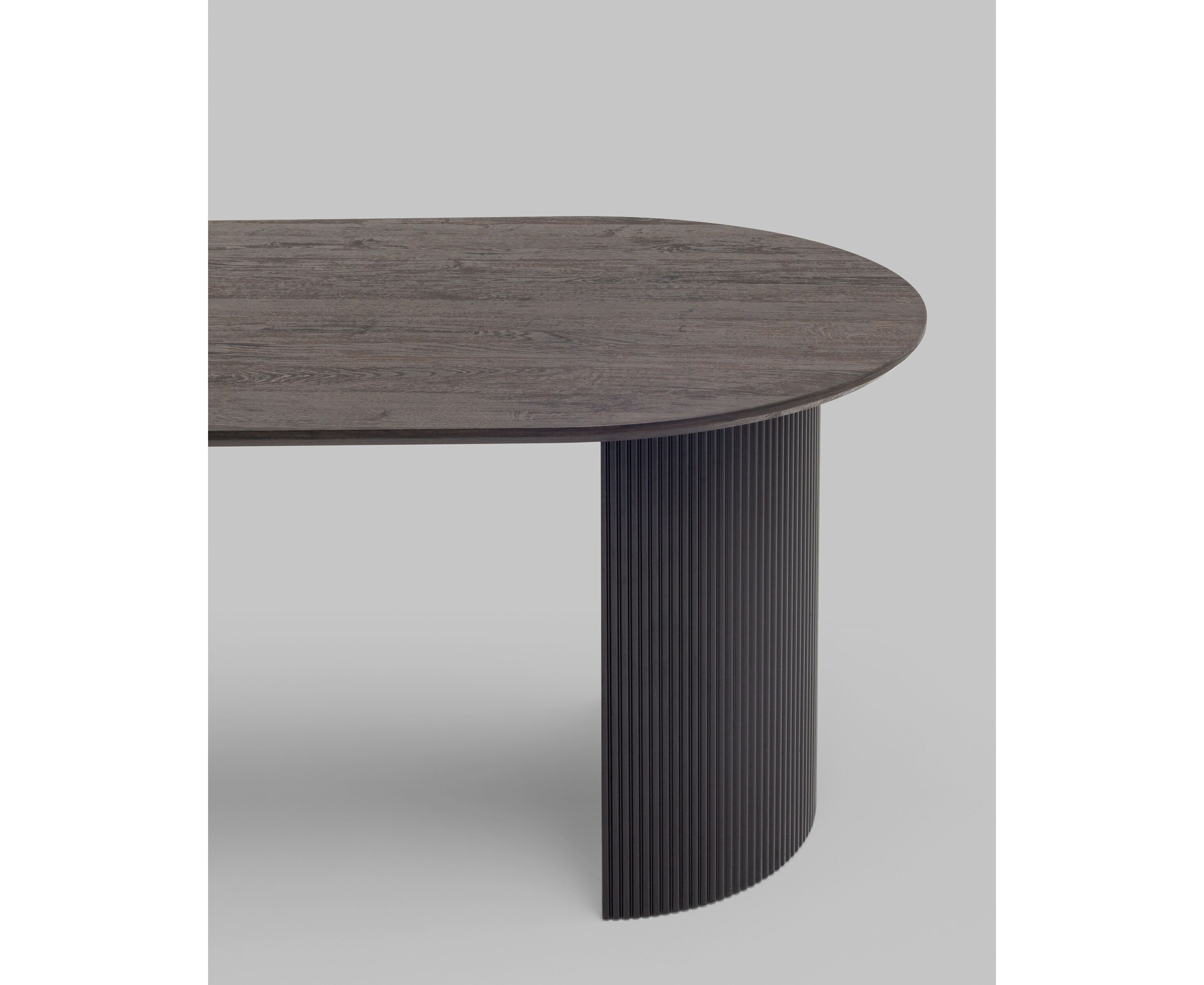Столешница выполнена из прочного и долговечного МДФ. Темная поверхность столешницы гармонично сочетается с массивными ножками черного цвета. Простая овальная форма стола позволит легко вписать его в современный интерьер, стол украсит кухню, гостиную или современное кафе, ресторан. Опорные плиссированные ножки в лаконичном дизайне надёжно удерживают всю конструкцию и дополняют монолитный образ.