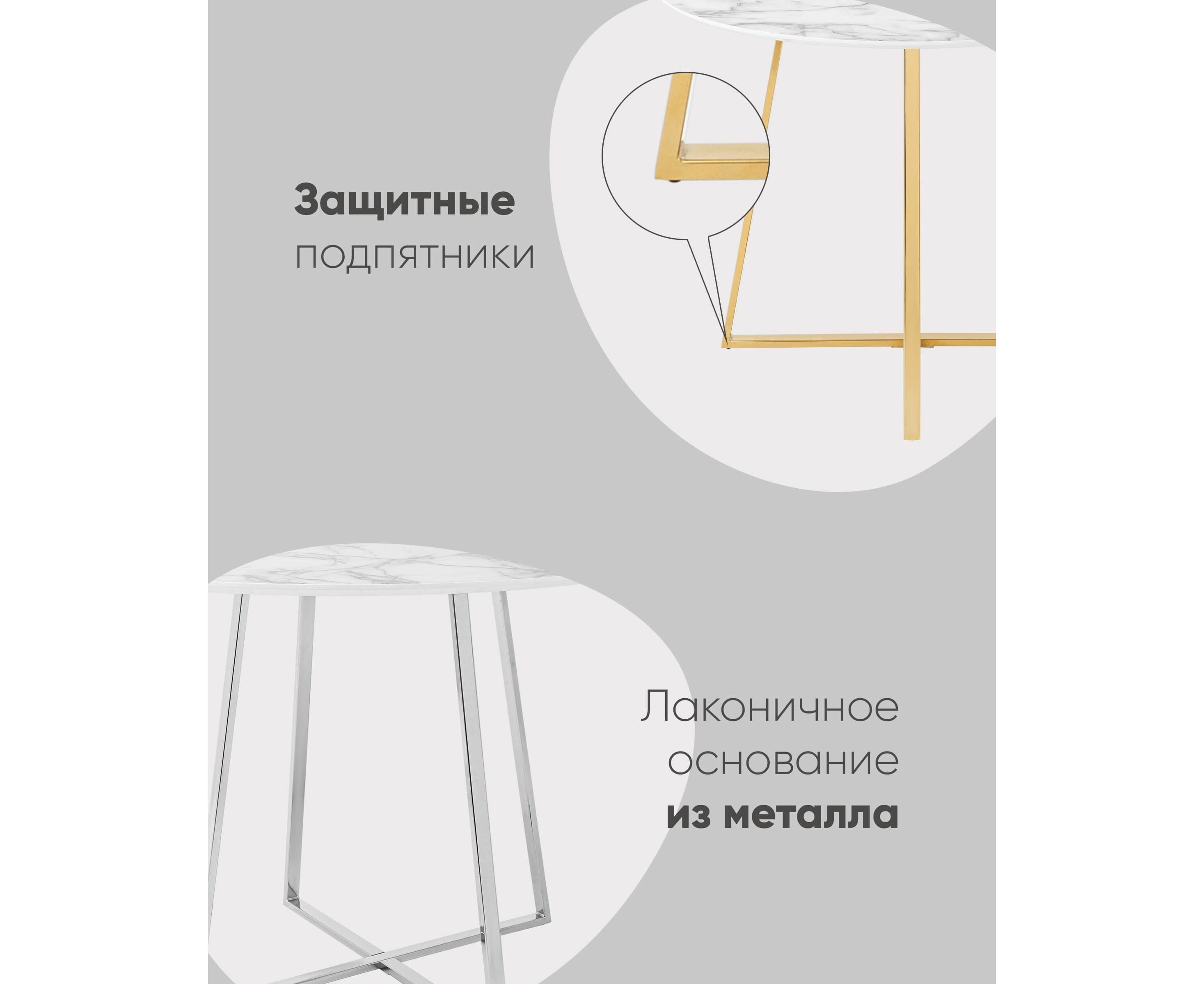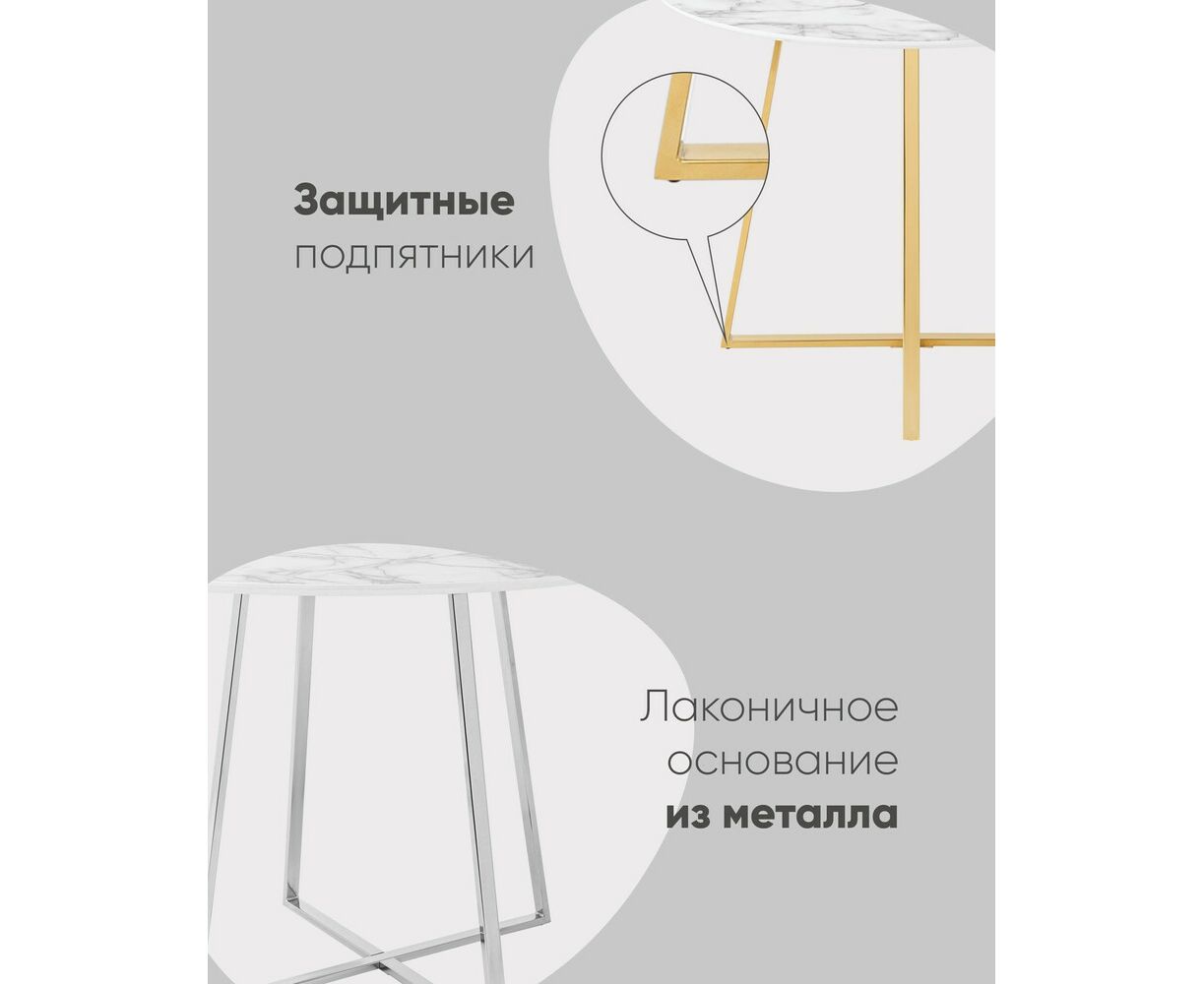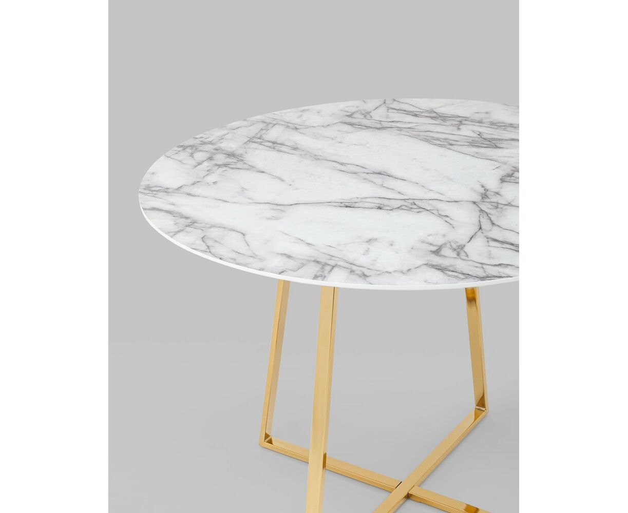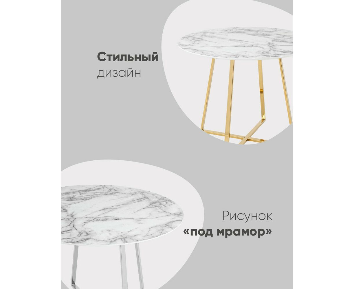 Роскошный обеденный стол для кухни. Круглая столешница с рисунком белого мрамора выполнена из МДФ - прочного, экологически безопасного материала, который устойчив к перепадам температур и повышенной влажности. Поверхность столешницы декорирована рисунком белого мрамора, который идеально сочетается с металлическими ножками в золотом цвете. Защитные подпятники на ножках предотвращают порчу напольного покрытия.