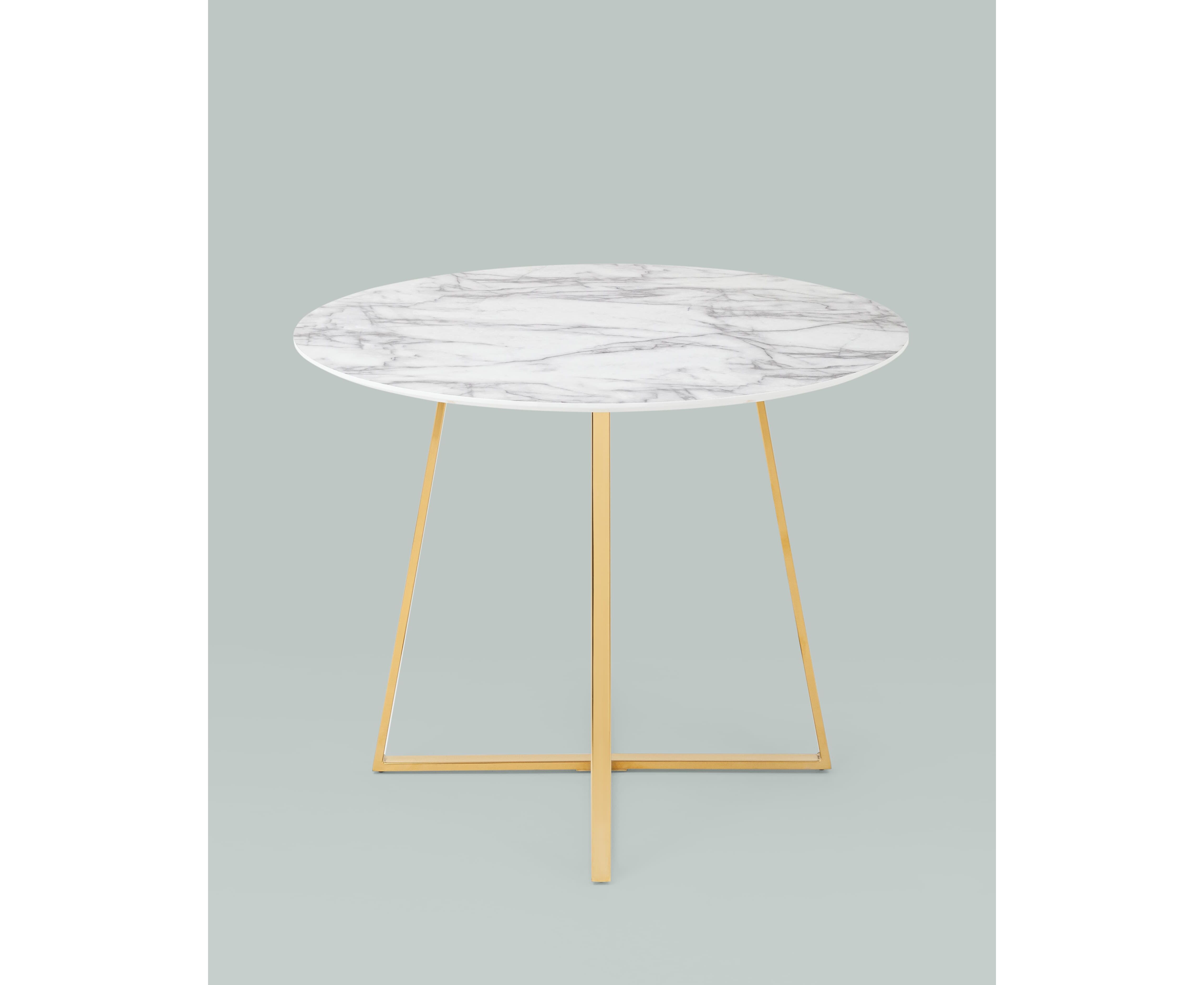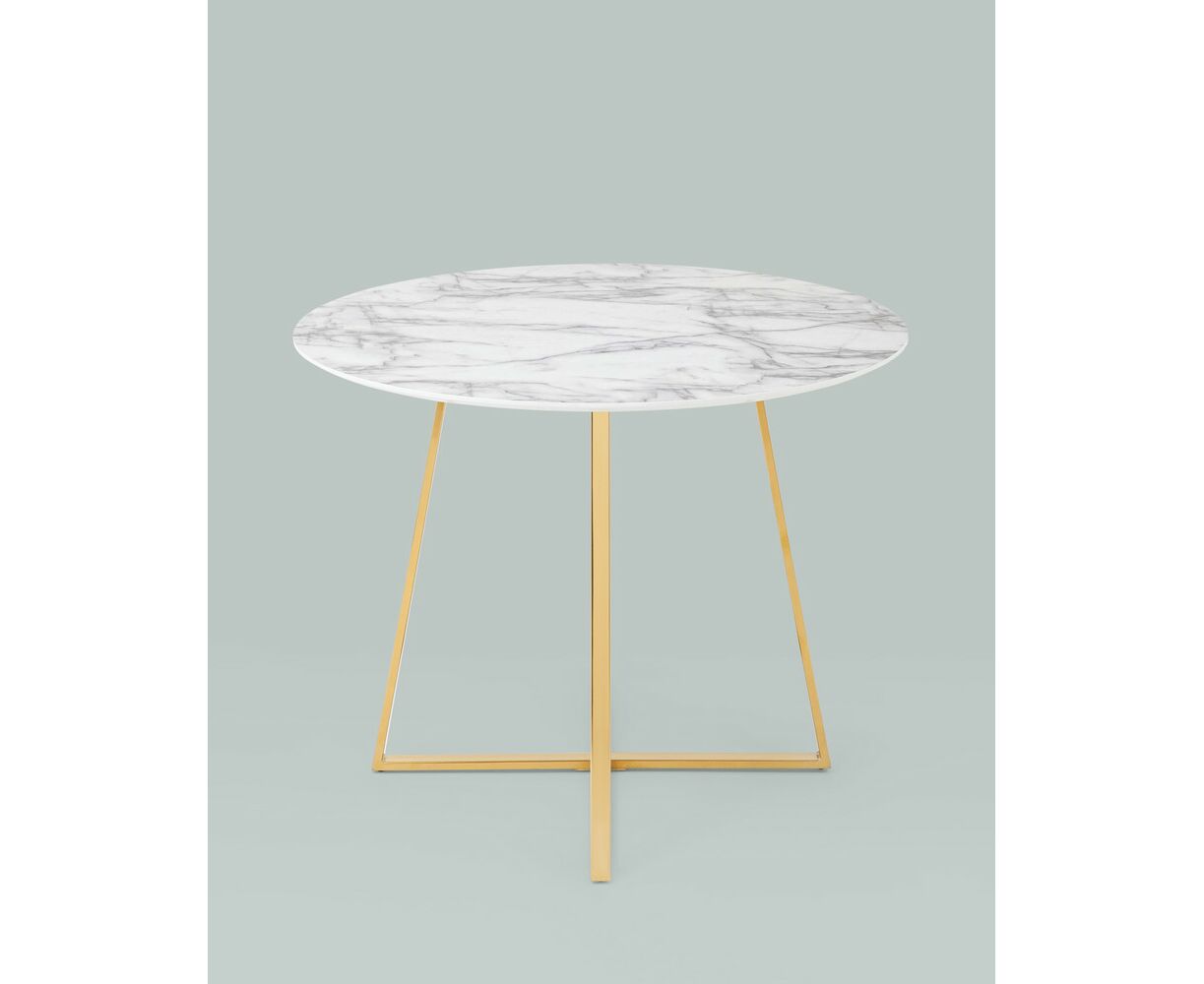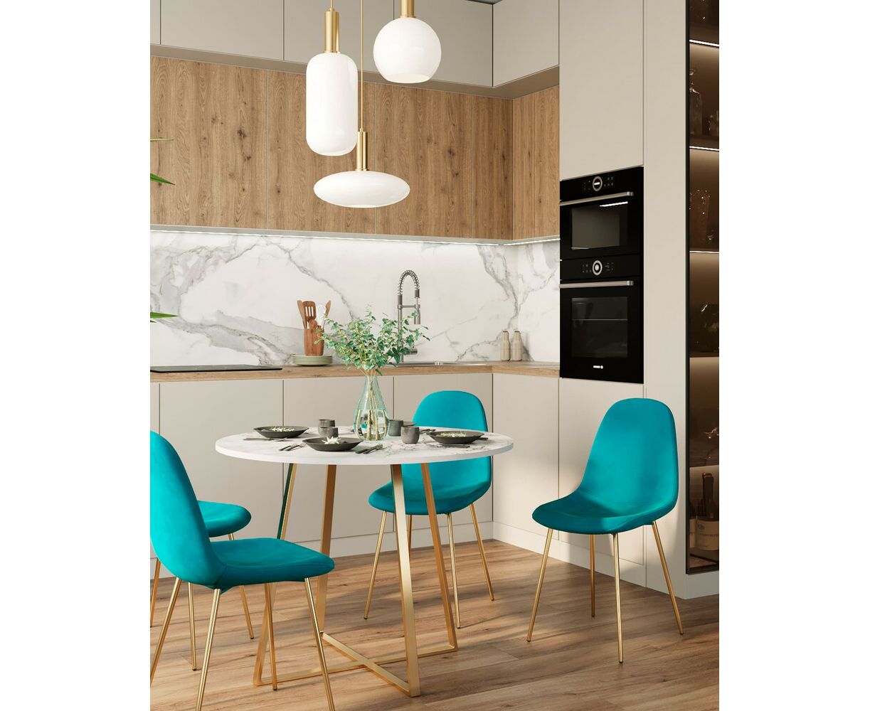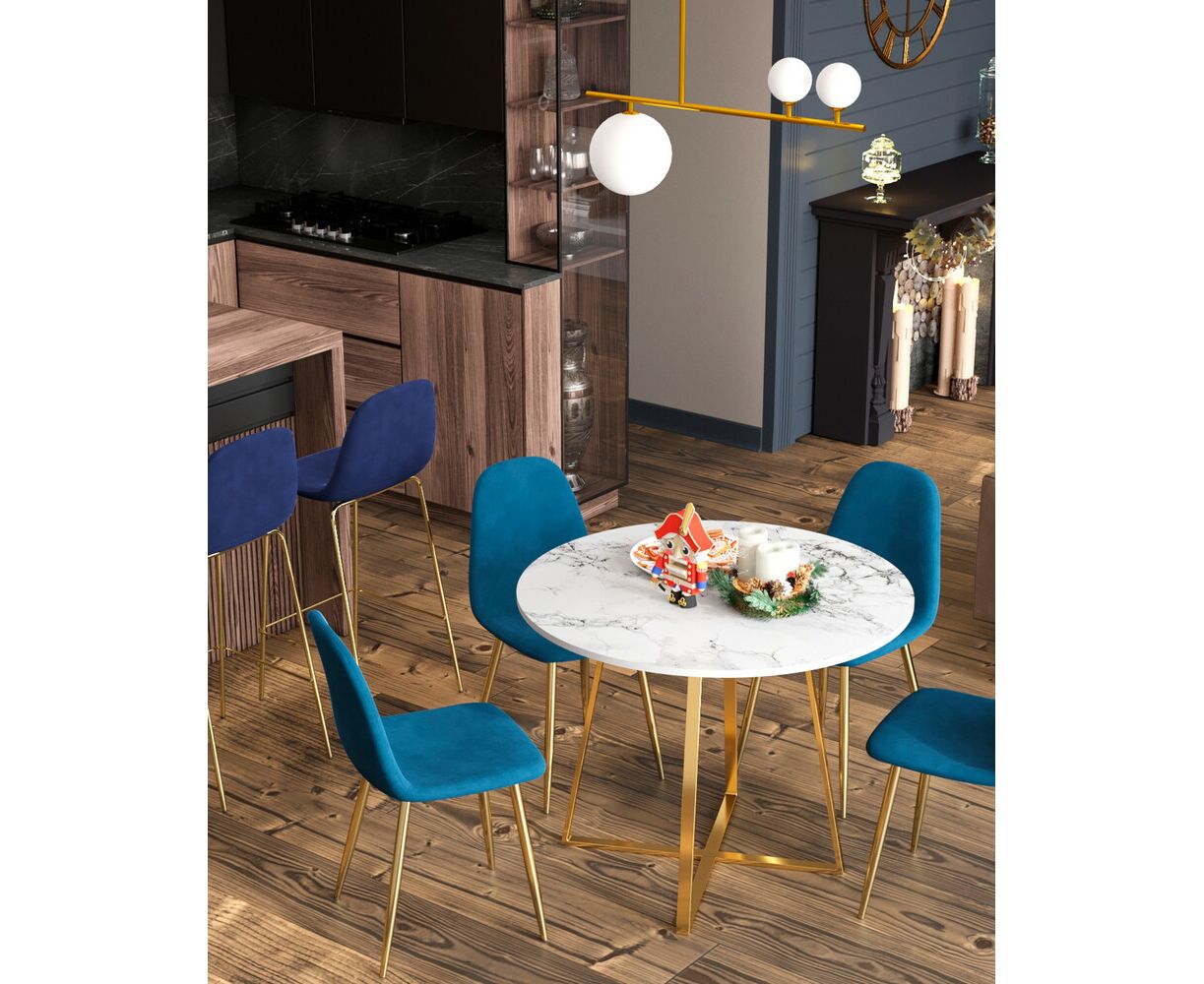 Роскошный обеденный стол для кухни. Круглая столешница с рисунком белого мрамора выполнена из МДФ - прочного, экологически безопасного материала, который устойчив к перепадам температур и повышенной влажности. Поверхность столешницы декорирована рисунком белого мрамора, который идеально сочетается с металлическими ножками в золотом цвете. Защитные подпятники на ножках предотвращают порчу напольного покрытия.