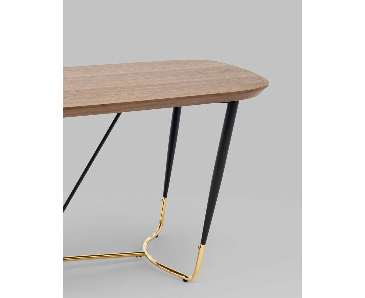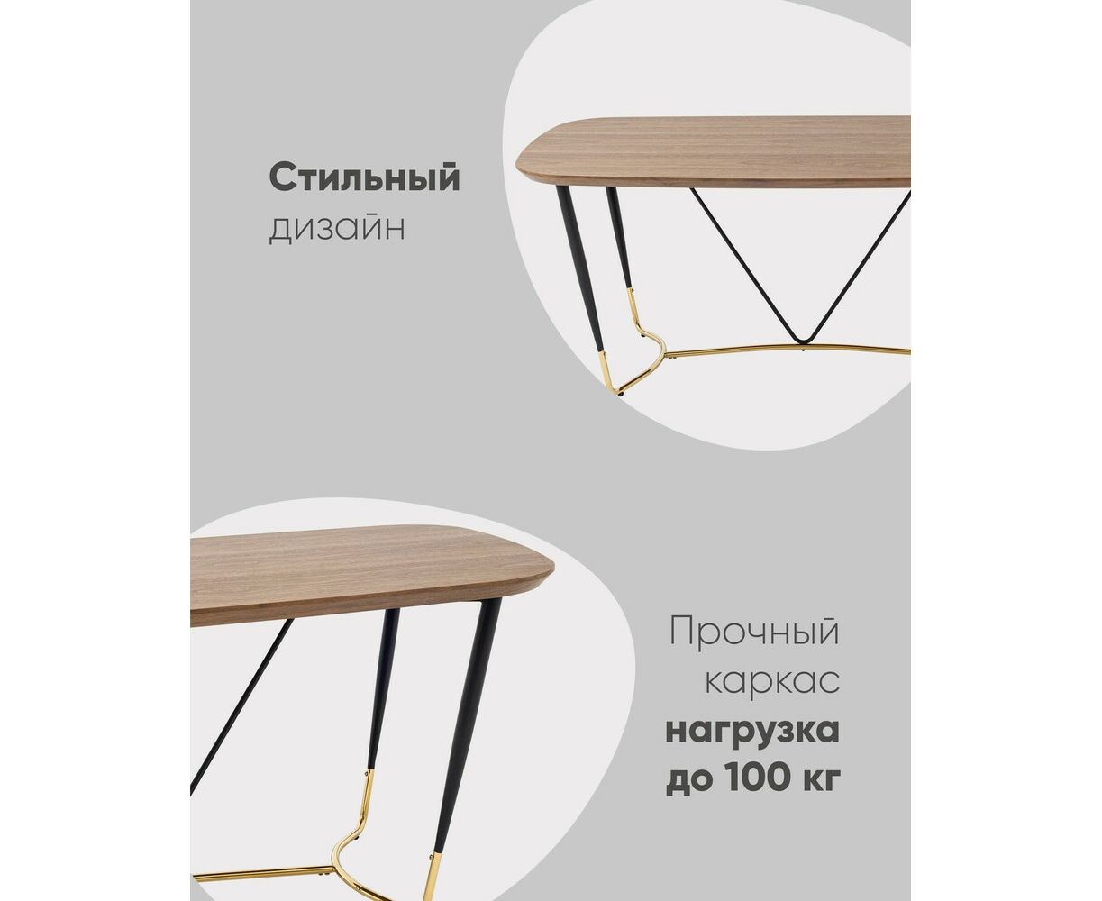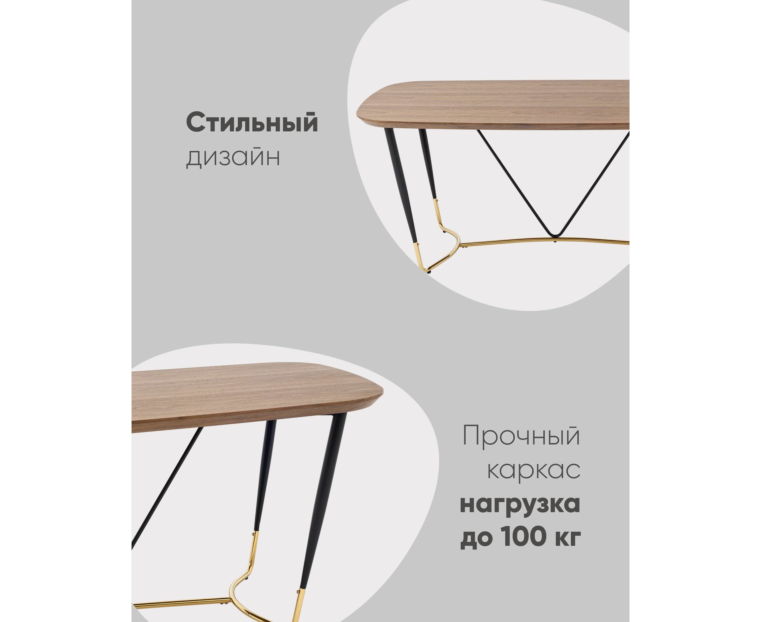 Стильный обеденный стол Даймакс. Прямоугольная столешница с закругленными углами выполнена из МДФ и покрыта шпоном цвета дуба. Придает столу сдержанный вид, создает ощущение уюта и тепла. Металлический каркас в черно-золотом цвете гармонично сочетается со столешницей. Выдерживает нагрузку до 100 кг, основание оснащено подпятниками для предотвращения порчи напольного покрытия. Стол Даймакс дополнит любой современный интерьер кухни или зала.