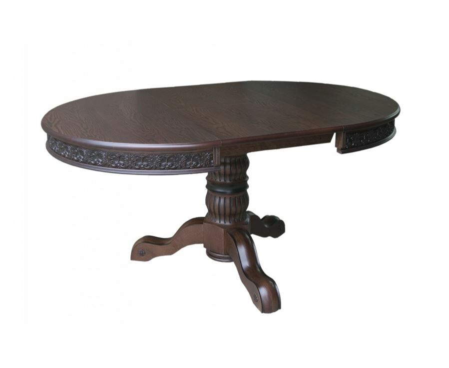Обеденный стол Милорд выполнен в благородном цвете темный орех с черной патиной. Крглая столешница срезным узором по кромке стыкуется с массивной ножкой-опорой на трех лапках. Стол станет отличным дополнением в классическом интерьере.