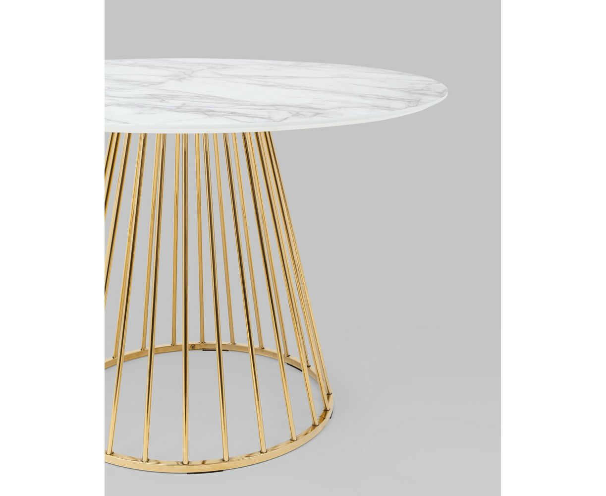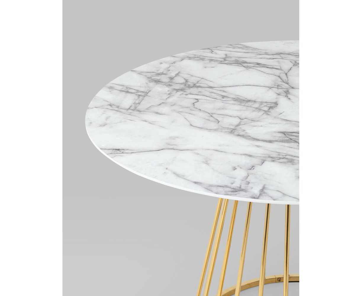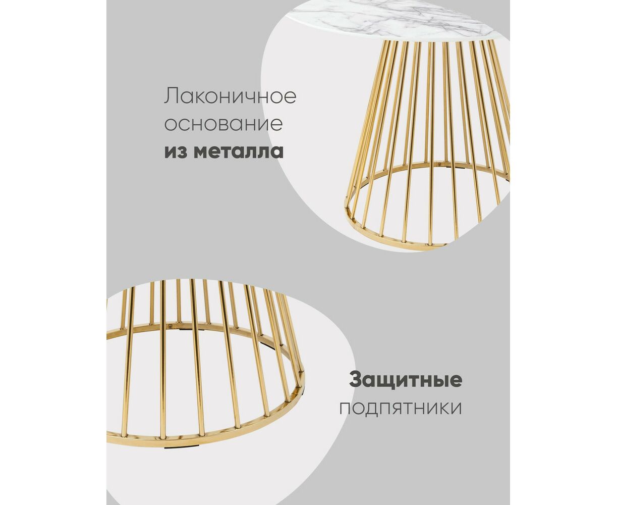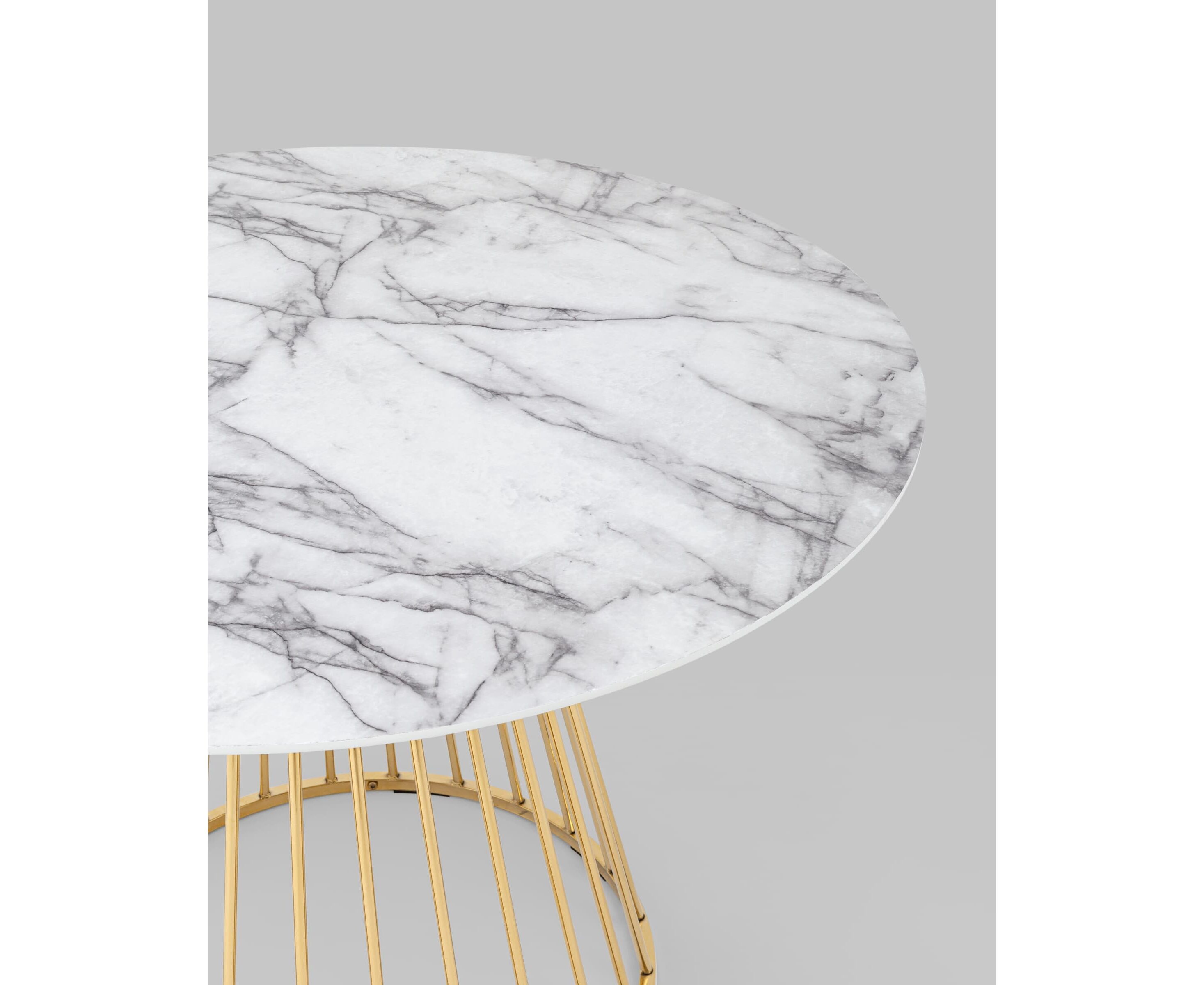 Стильный стол с металлическим основанием. Круглая столешница с рисунком белого мрамора выполнена из МДФ - прочного, экологически безопасного материала, который устойчив к перепадам температур и повышенной влажности. Поверхность столешницы декорирована рисунком белого мрамора, который идеально сочетается с металлическим основанием в золотом цвете. Защитные подпятники в основании предотвращают порчу напольного покрытия.