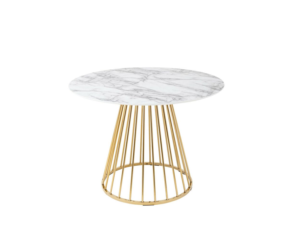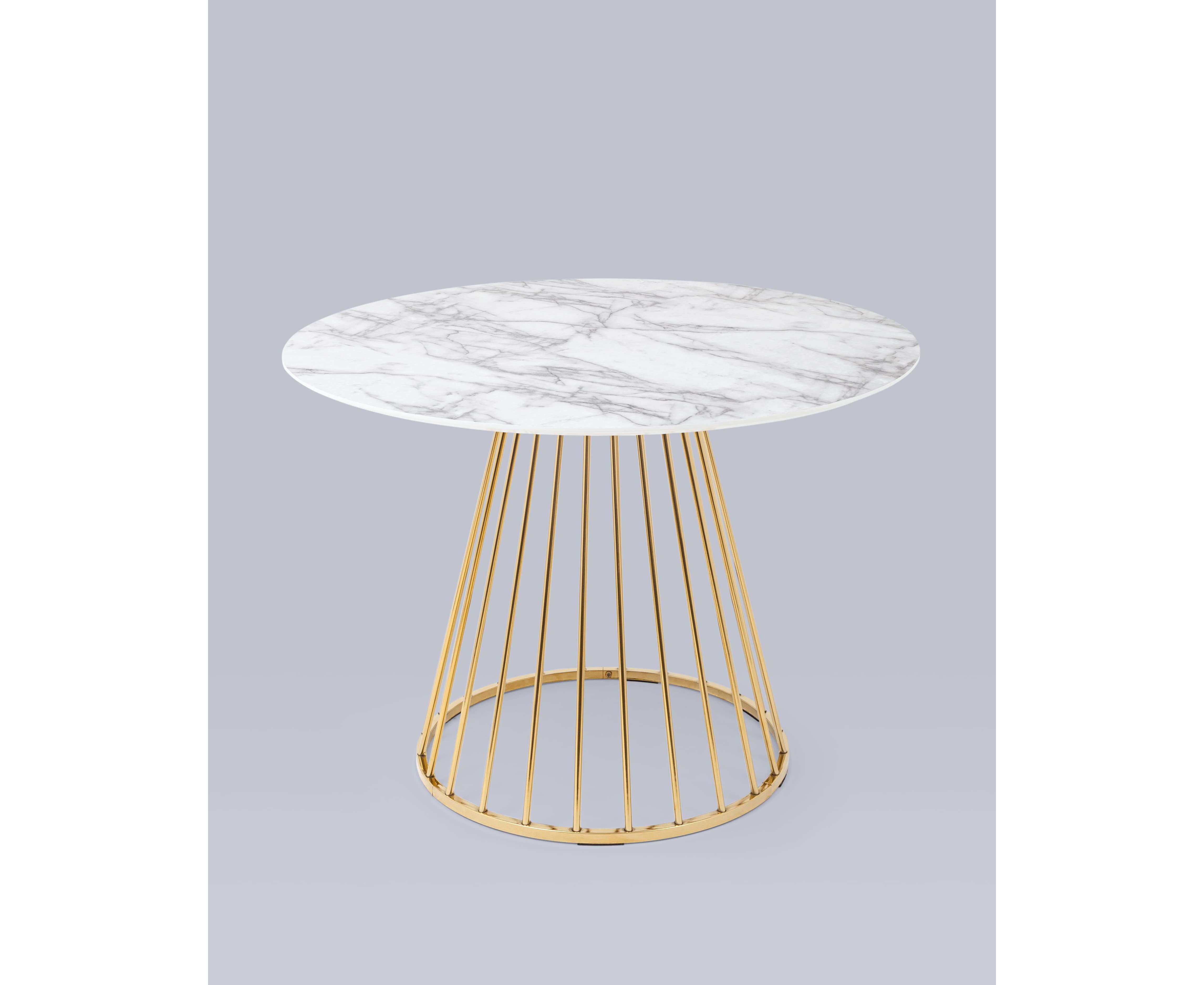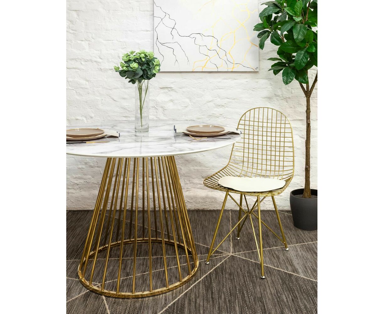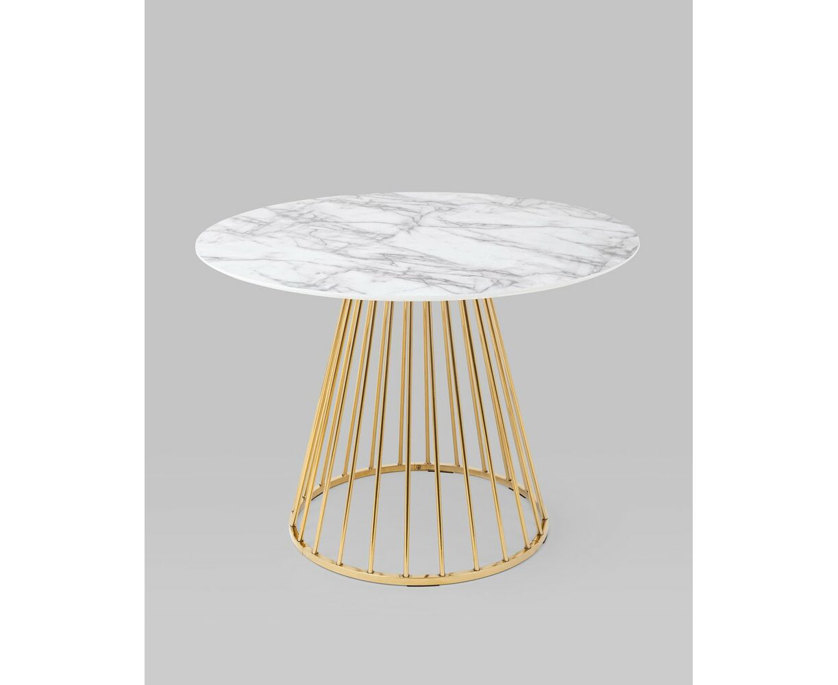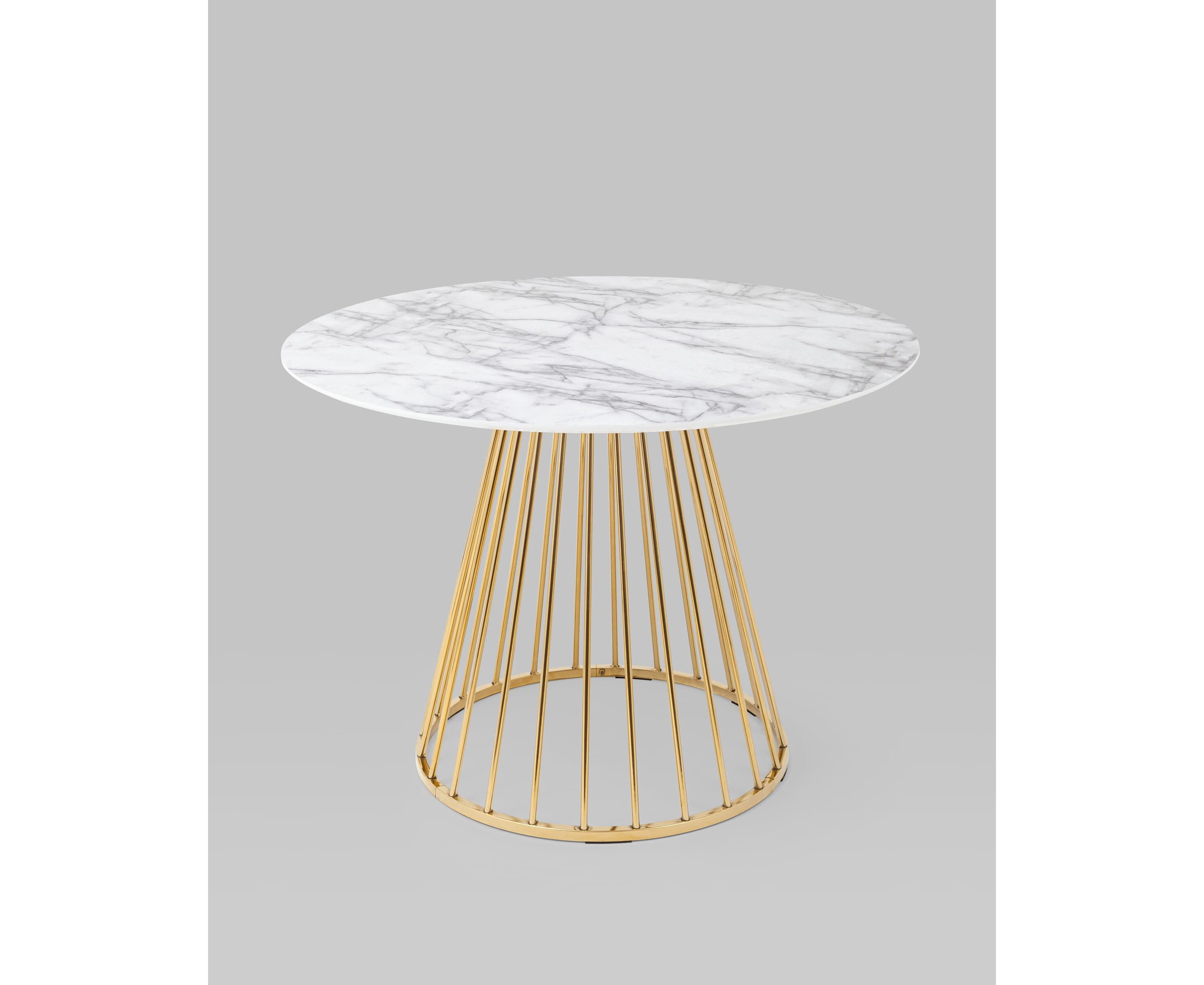 Стильный стол с металлическим основанием. Круглая столешница с рисунком белого мрамора выполнена из МДФ - прочного, экологически безопасного материала, который устойчив к перепадам температур и повышенной влажности. Поверхность столешницы декорирована рисунком белого мрамора, который идеально сочетается с металлическим основанием в золотом цвете. Защитные подпятники в основании предотвращают порчу напольного покрытия.