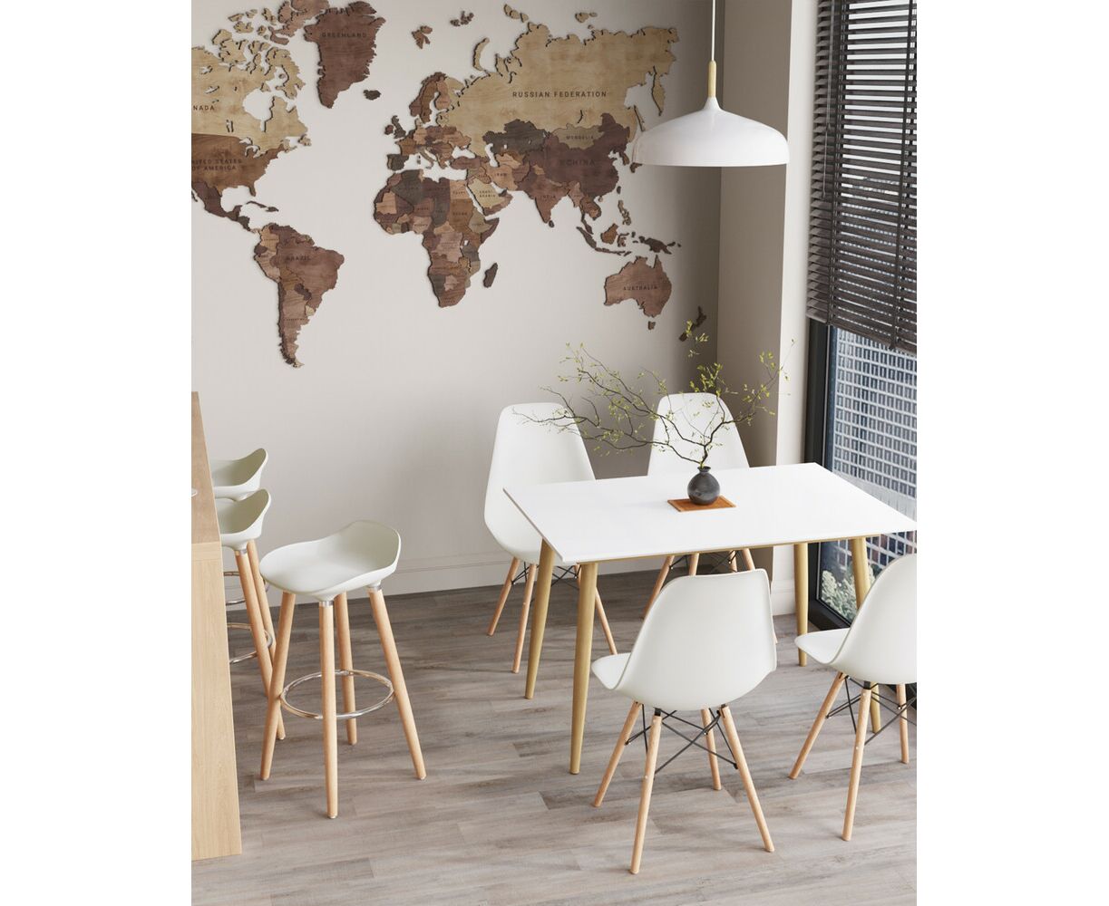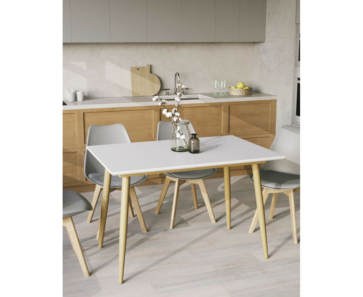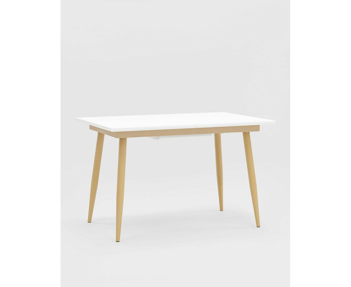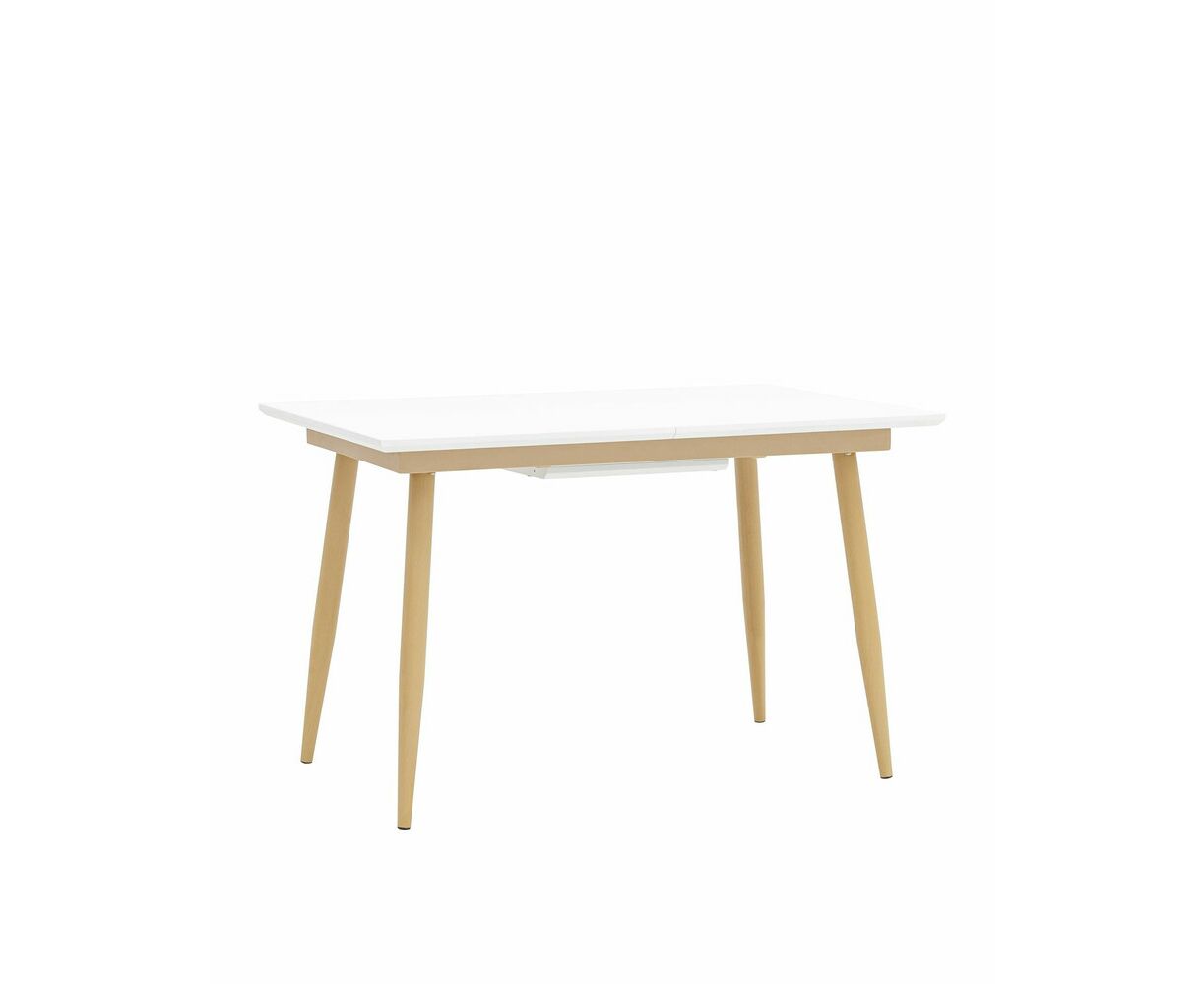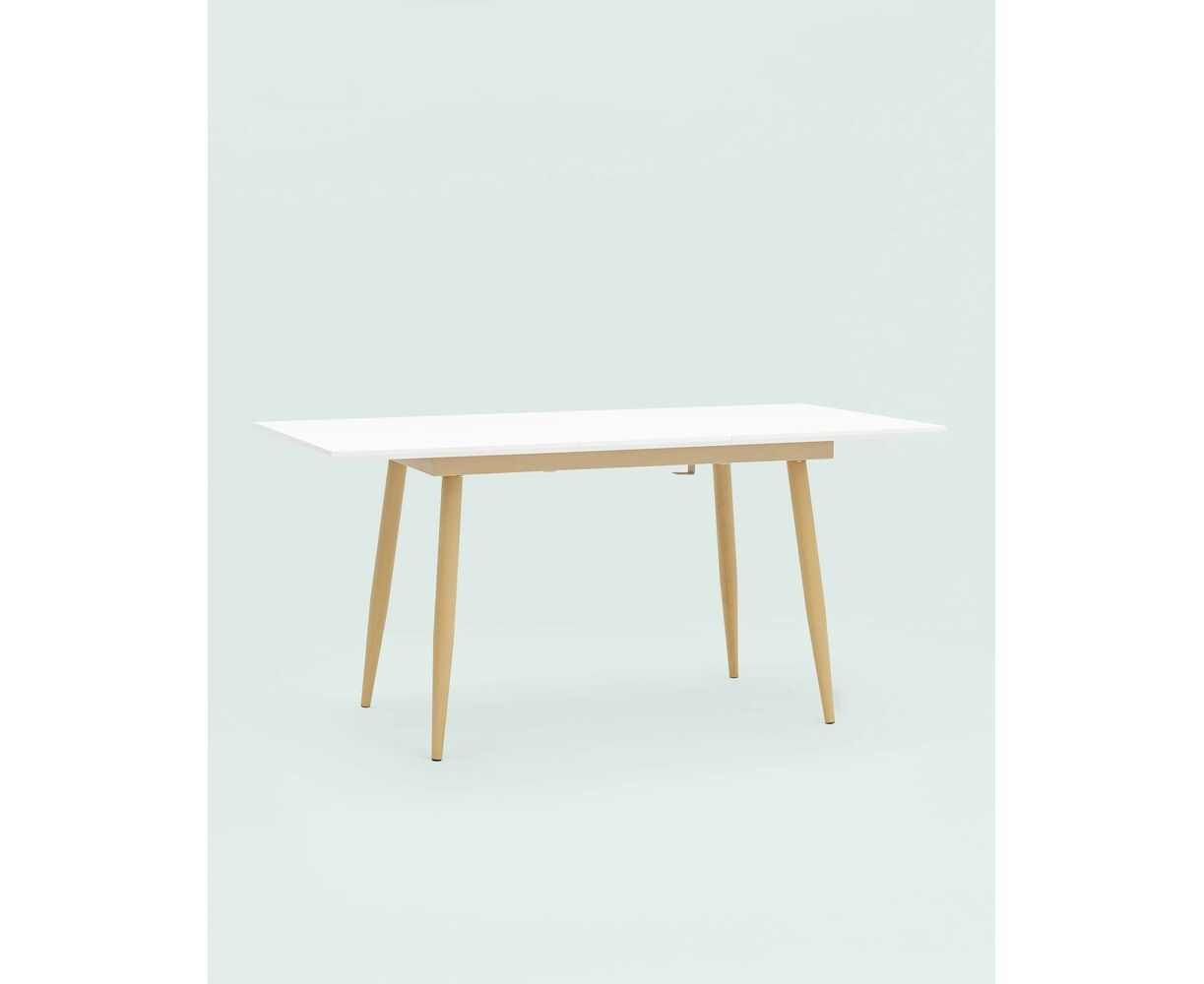 Обеденный стол в прямоугольной столешницей. Цвет столешницы белый. Ножки металлические, покрашены в цвет светлого дерева.